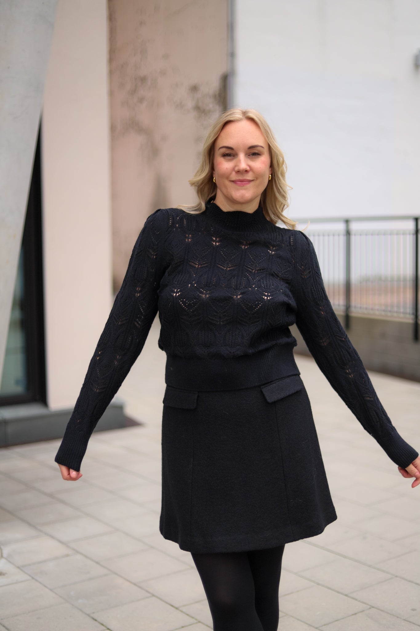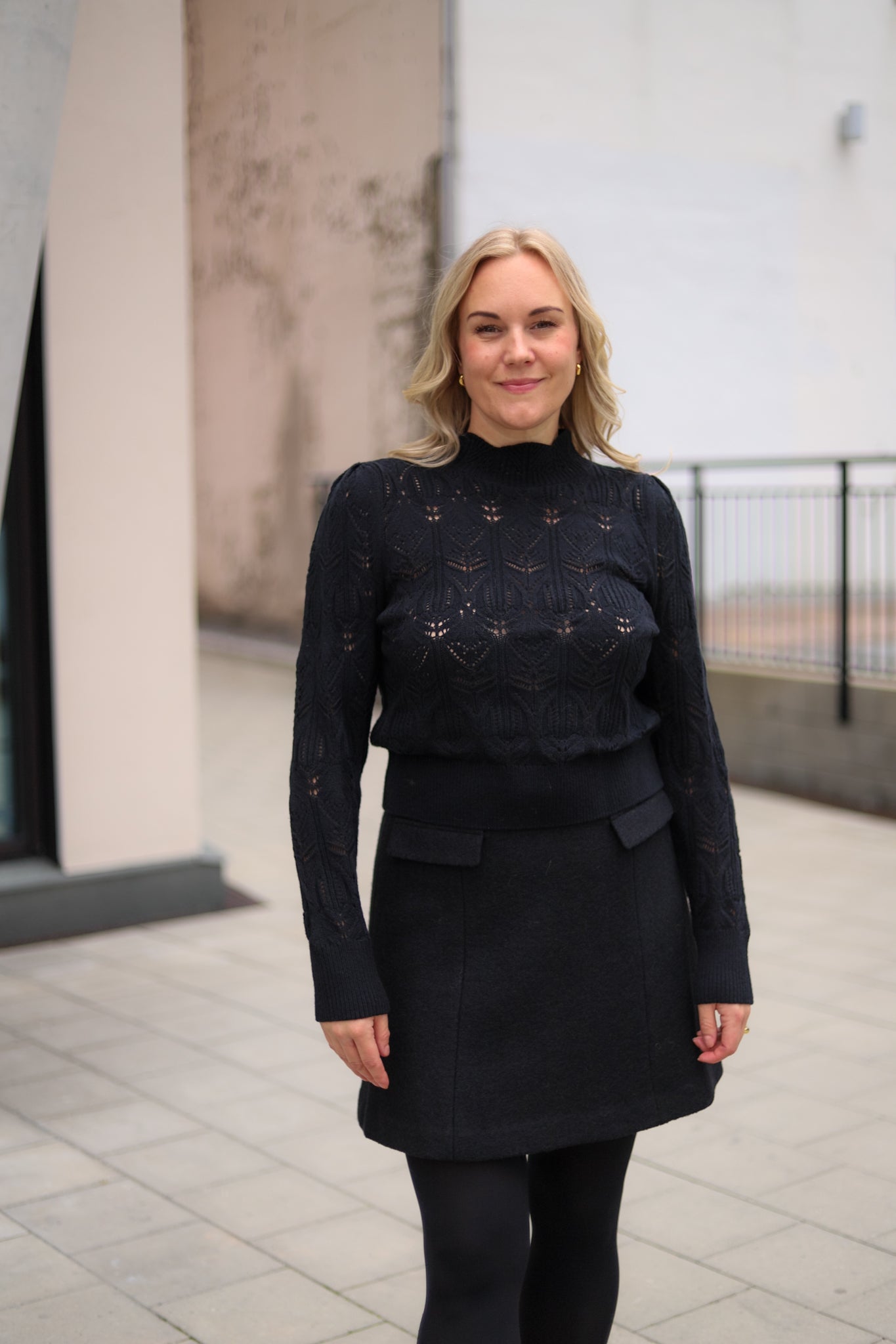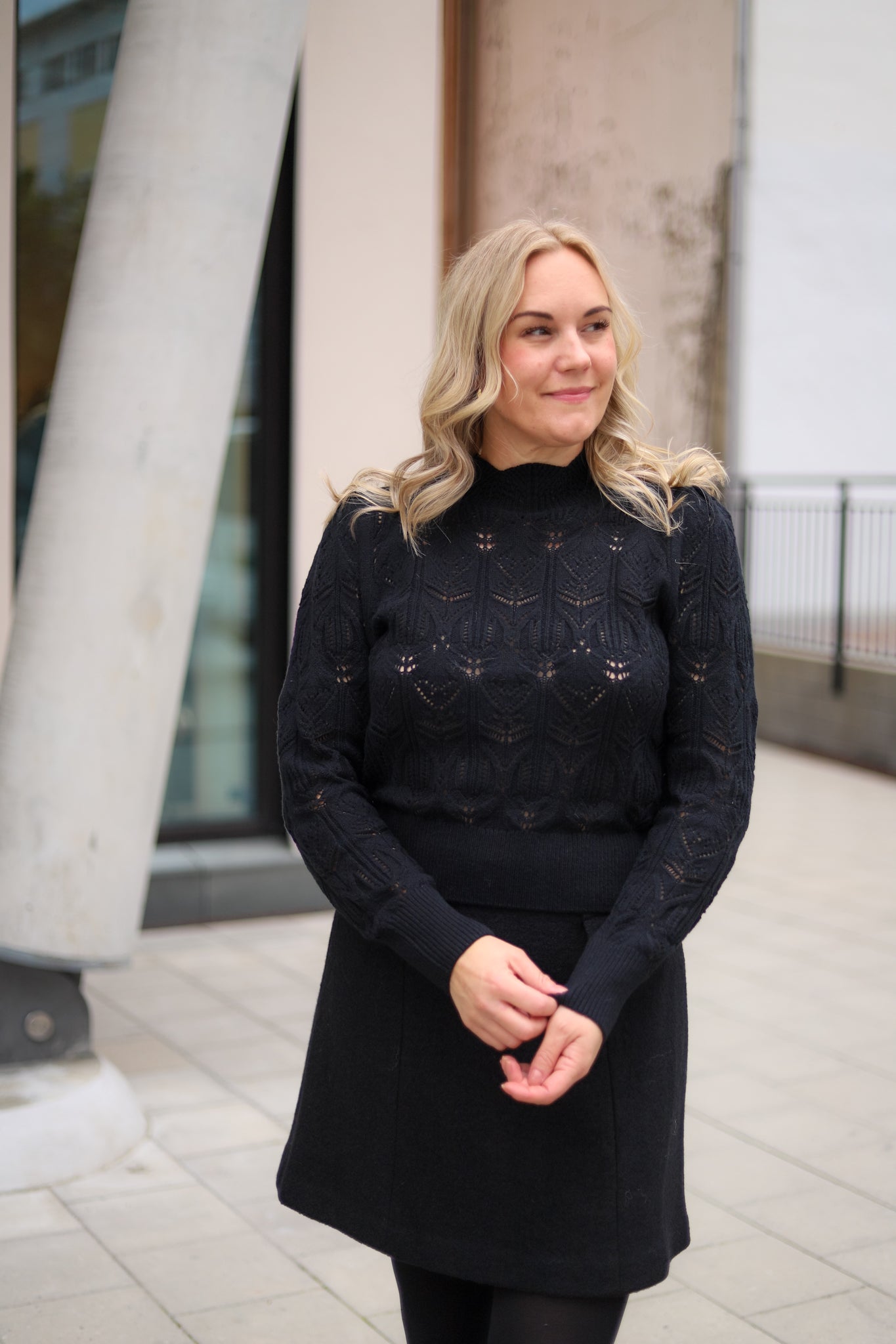 Vakker blondestrikk i klassisk sort fra Pia Tjelta. Modellen er tettsittende med semihøy hals og pen hoftelengde. Ribbestrikk i hals, hem og mansjett. Laget i myk, varm og pustende bomullsmix. Like fin til jeans, dressbukser eller et skjørt og perfekt under en dressjakke.