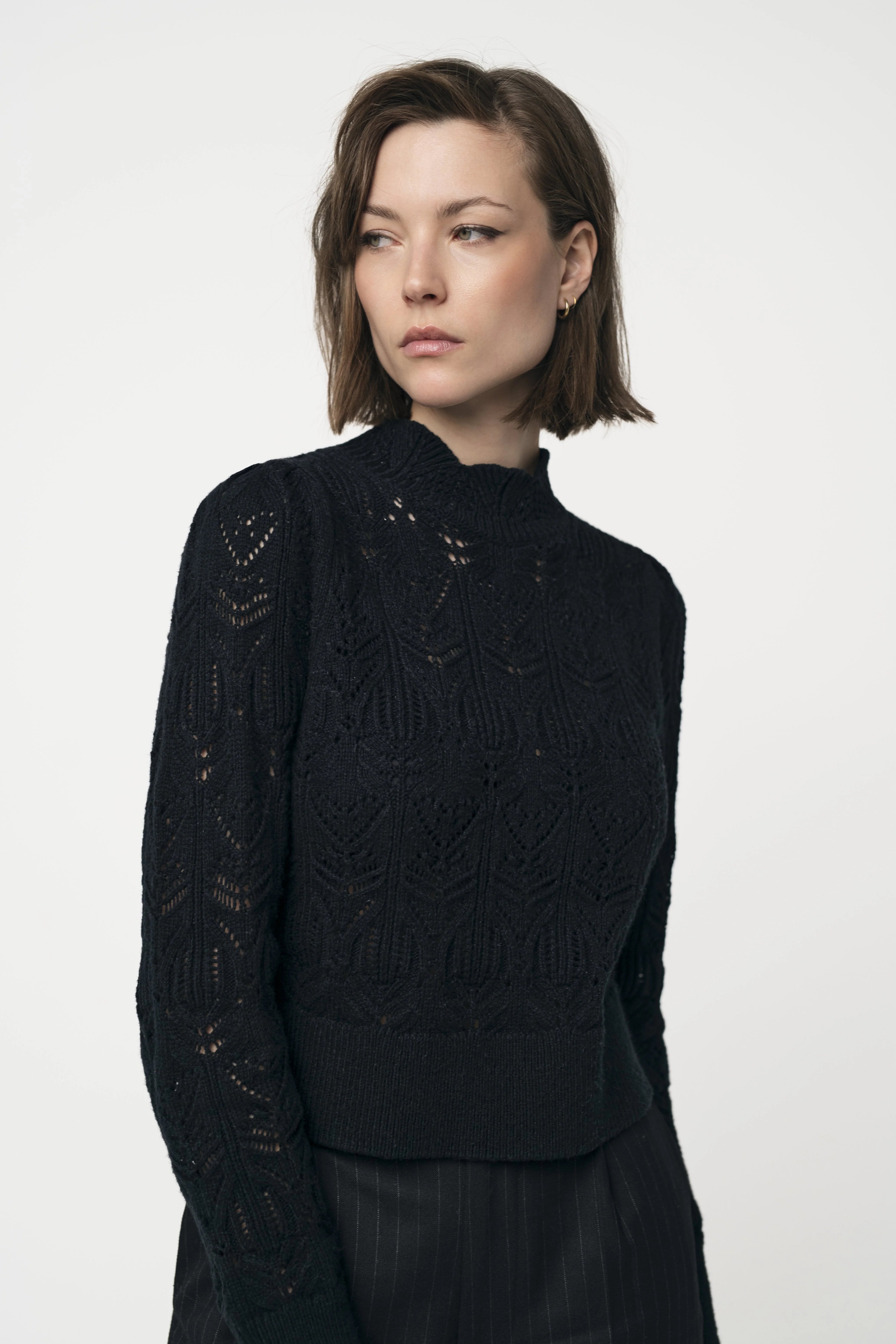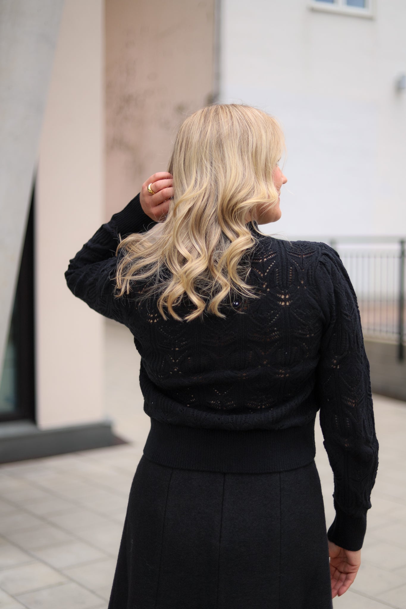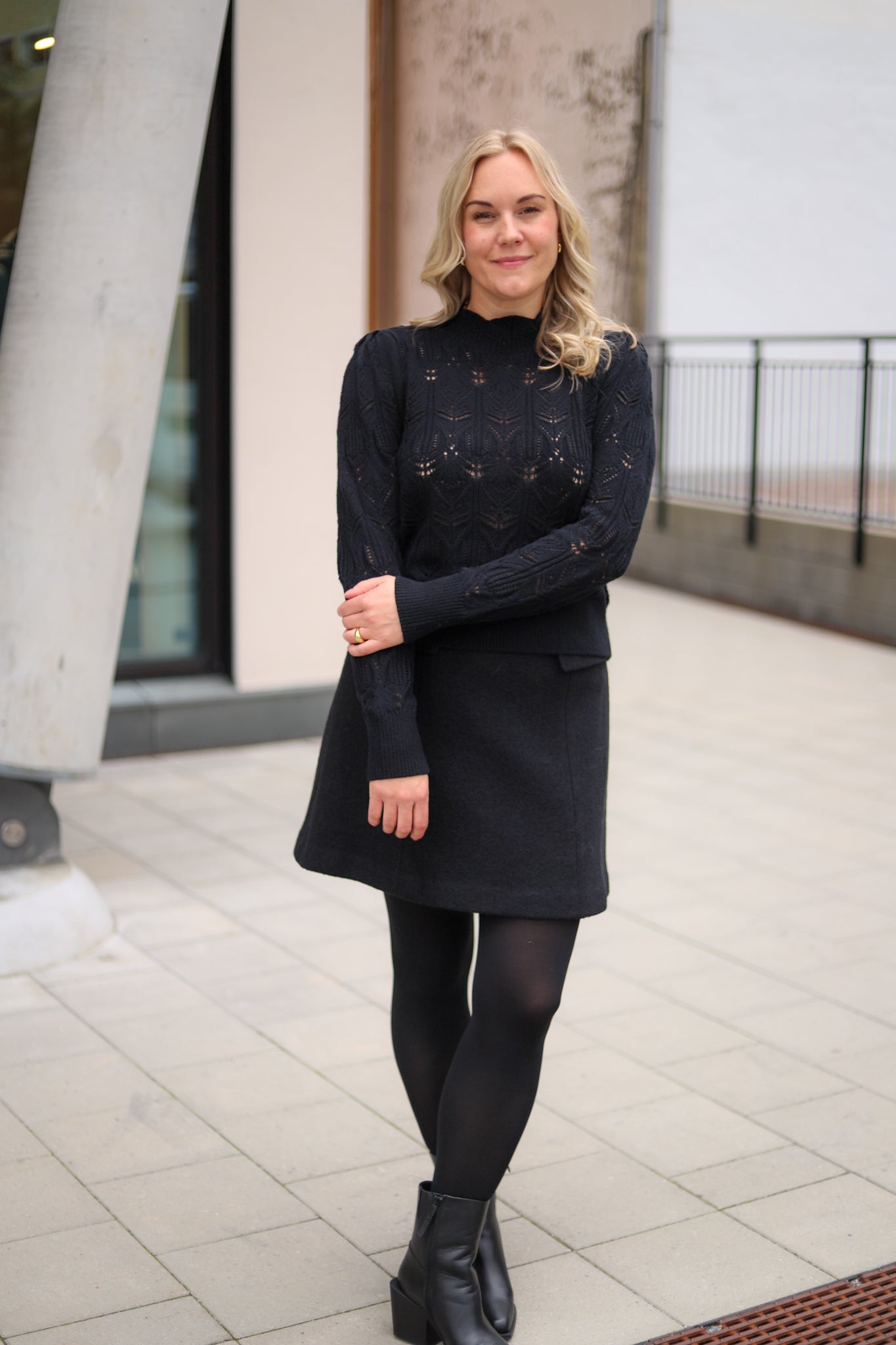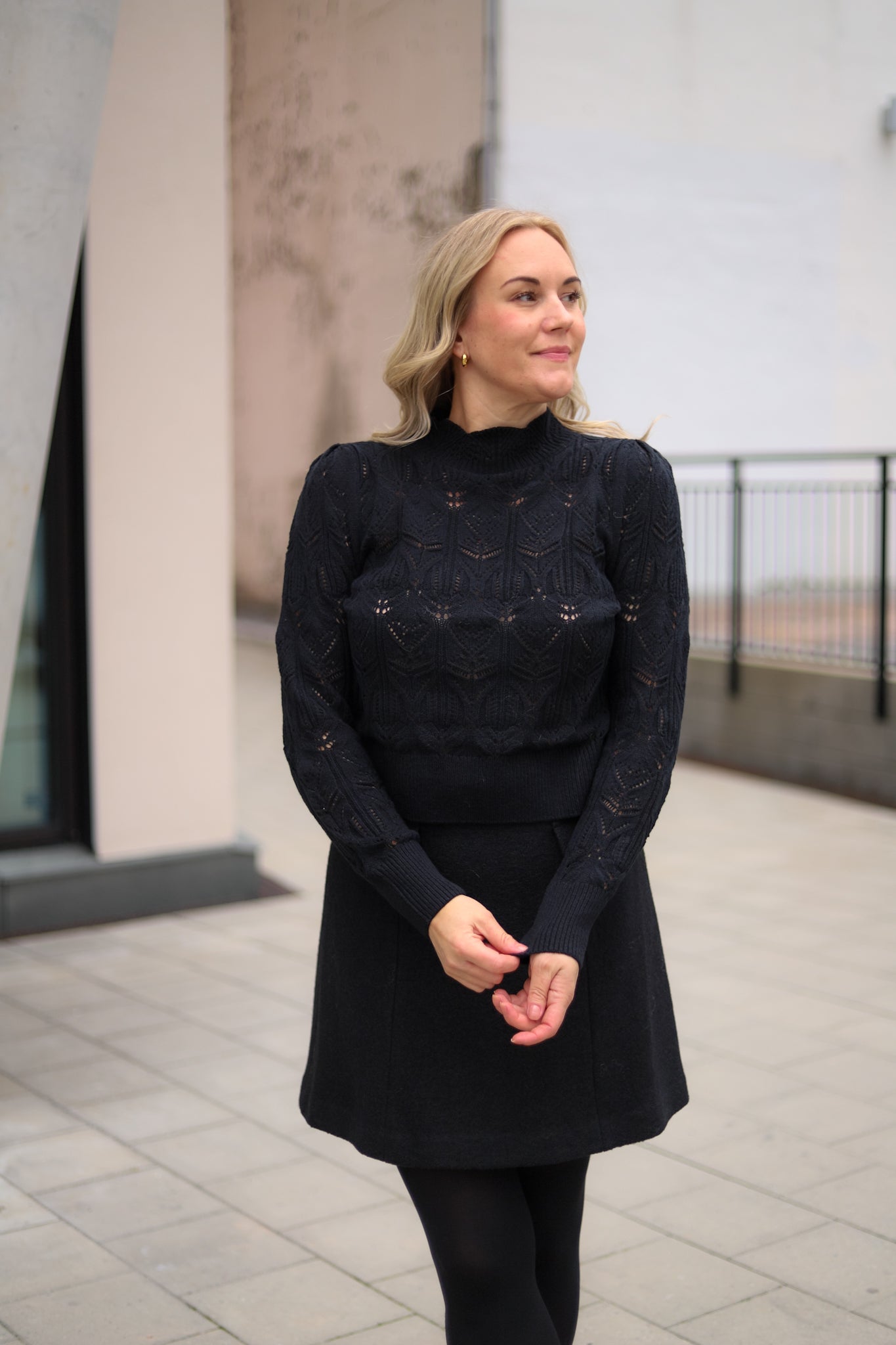 Vakker blondestrikk i klassisk sort fra Pia Tjelta. Modellen er tettsittende med semihøy hals og pen hoftelengde. Ribbestrikk i hals, hem og mansjett. Laget i myk, varm og pustende bomullsmix. Like fin til jeans, dressbukser eller et skjørt og perfekt under en dressjakke.