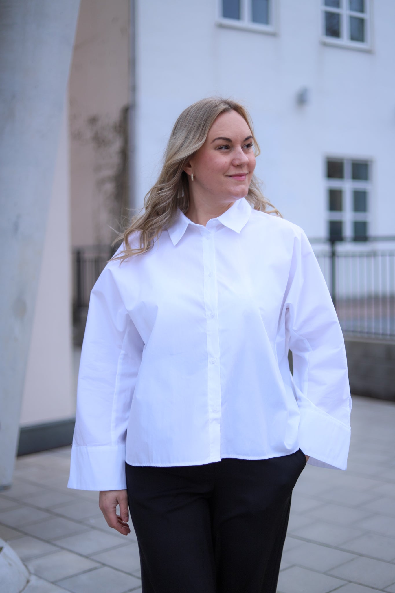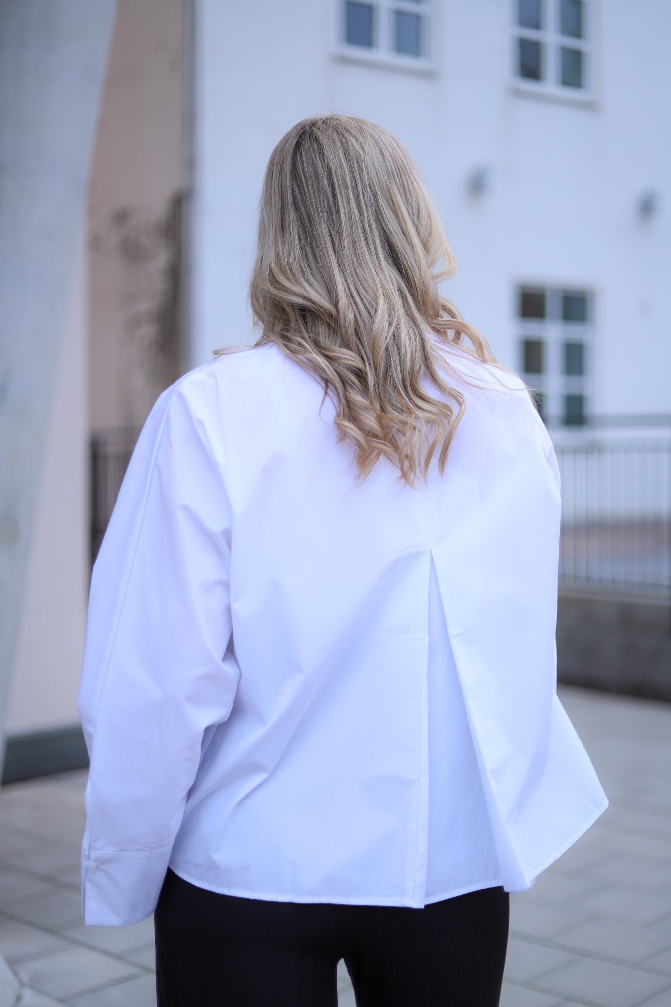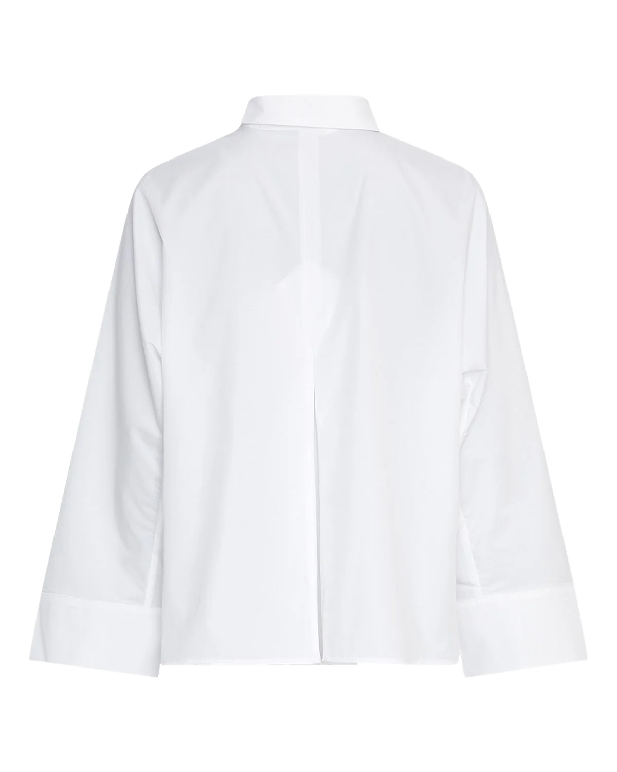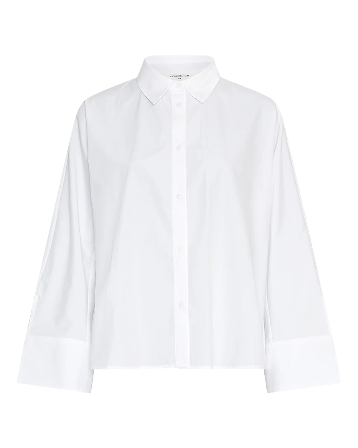 Stilig skjorte i klassisk hvit fra MSCH Copenhagen. Modellen skrår ut med nett lengde og delikat legg i ryggen som skaper pent fall. Den har klassisk skjortekrage med ton-i-ton knappestolpe og lange vide ermer med droppet skulder med brede mansjetter. En tøff skjorte i basegarderoben.