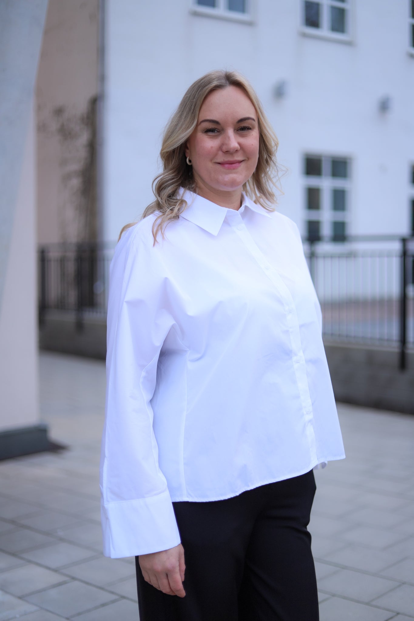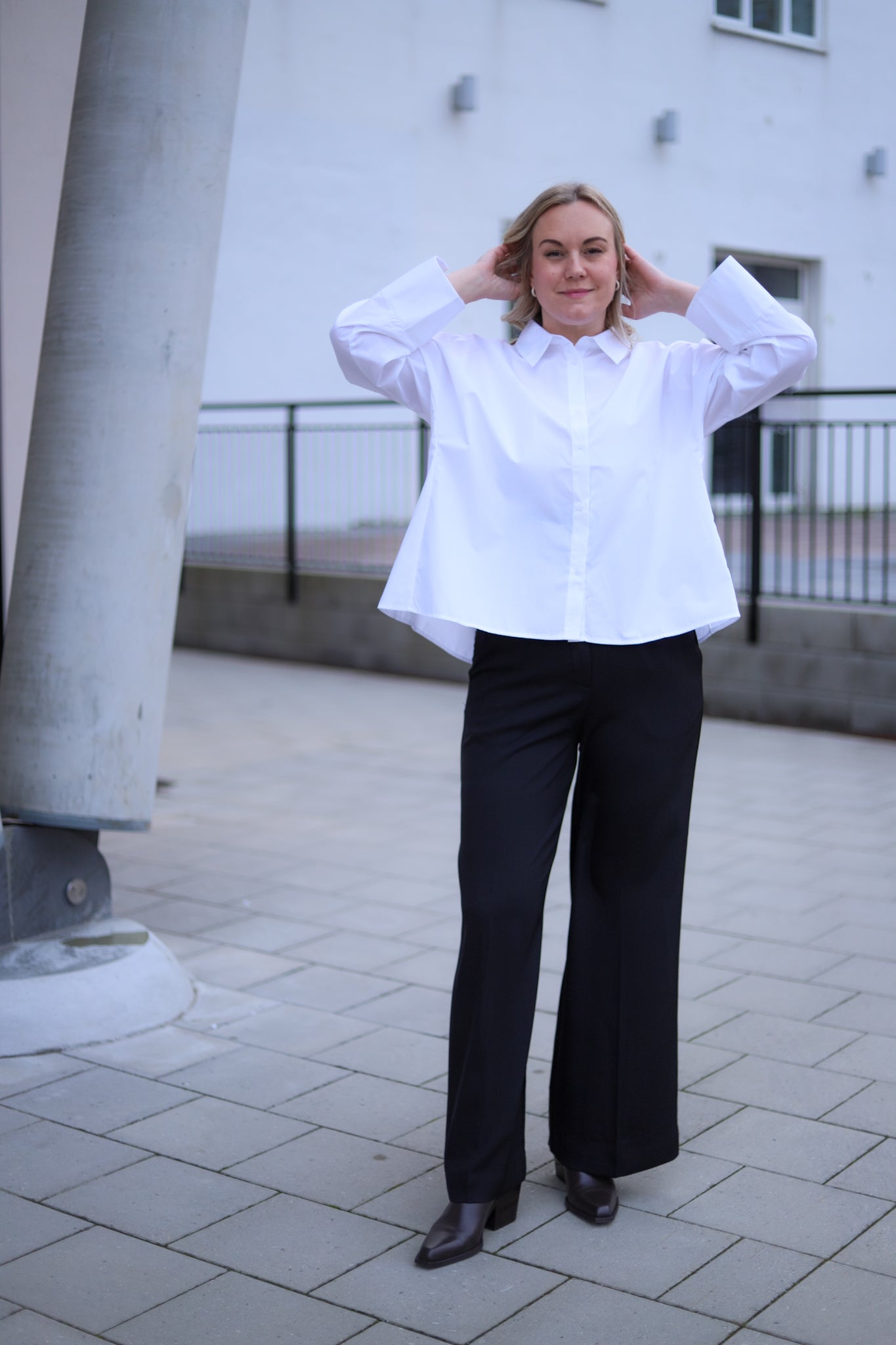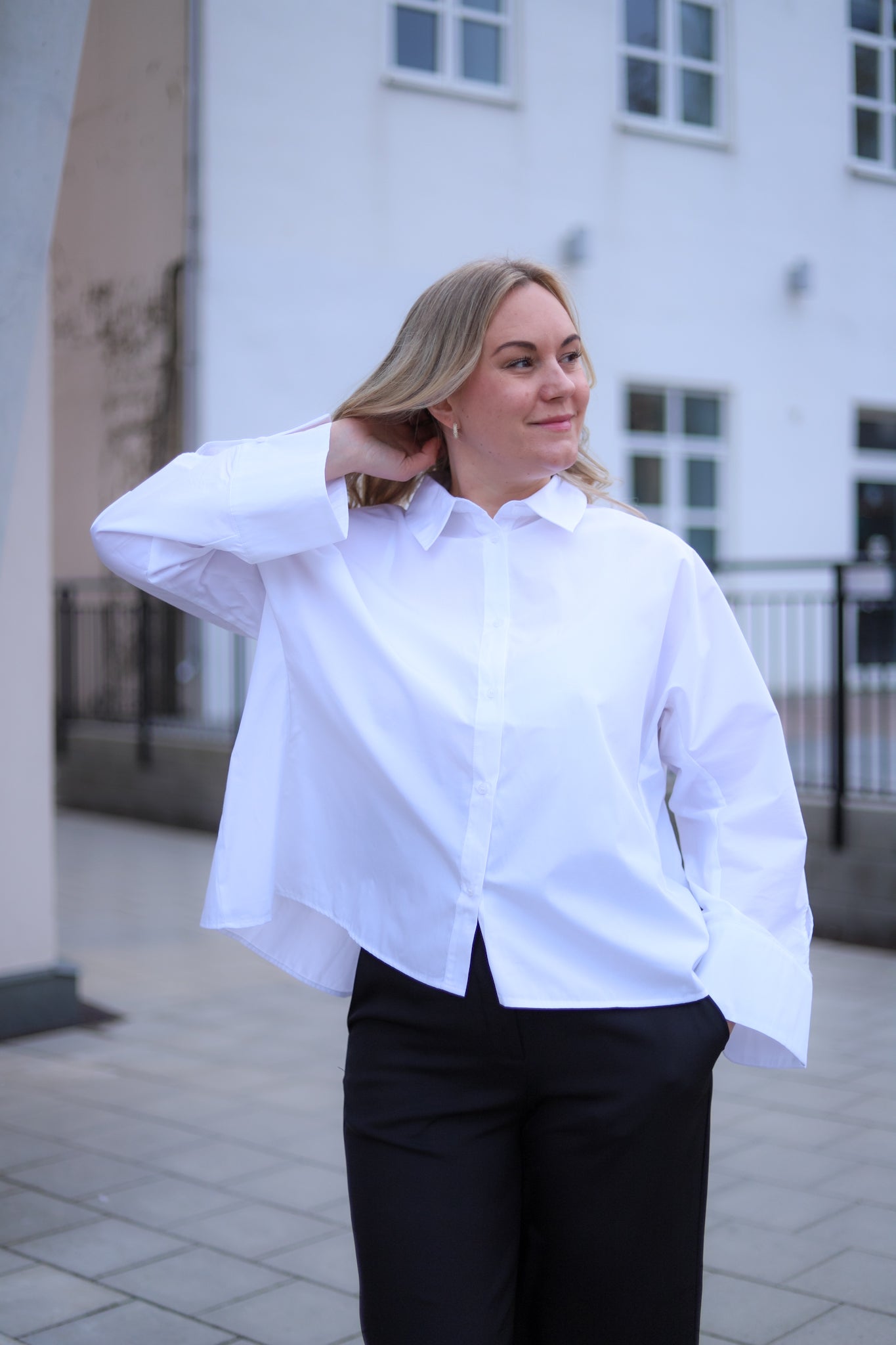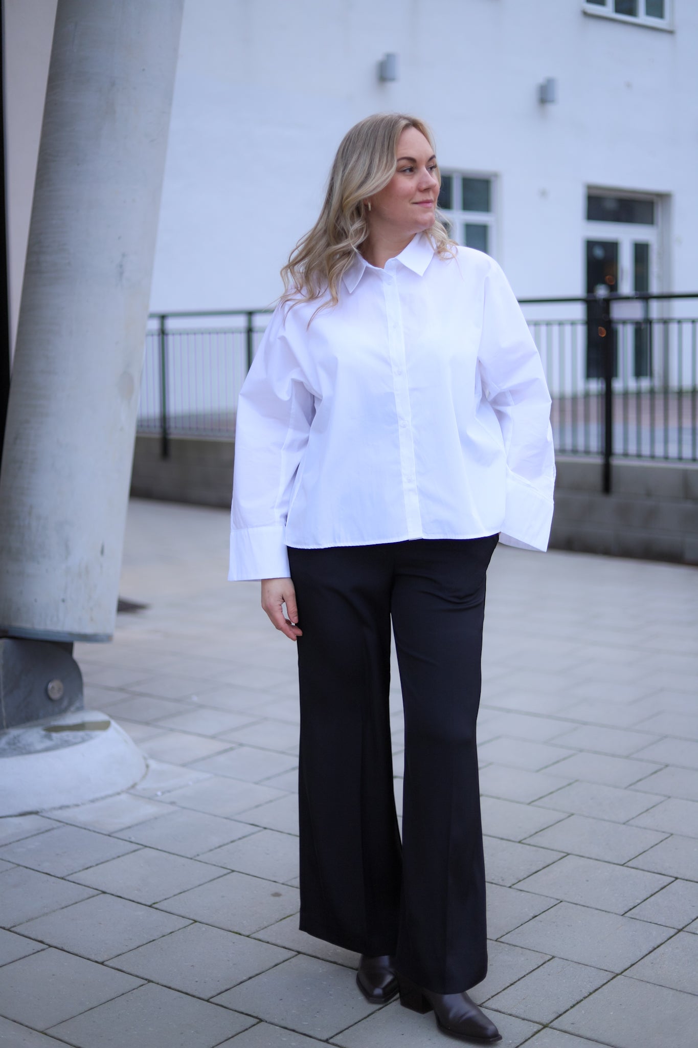 Stilig skjorte i klassisk hvit fra MSCH Copenhagen. Modellen skrår ut med nett lengde og delikat legg i ryggen som skaper pent fall. Den har klassisk skjortekrage med ton-i-ton knappestolpe og lange vide ermer med droppet skulder med brede mansjetter. En tøff skjorte i basegarderoben.