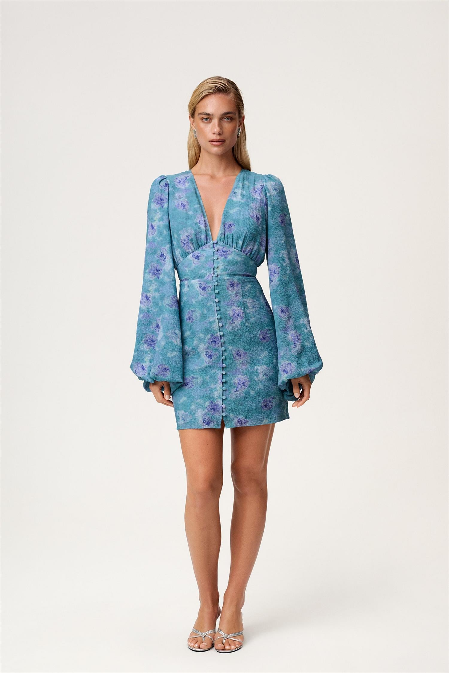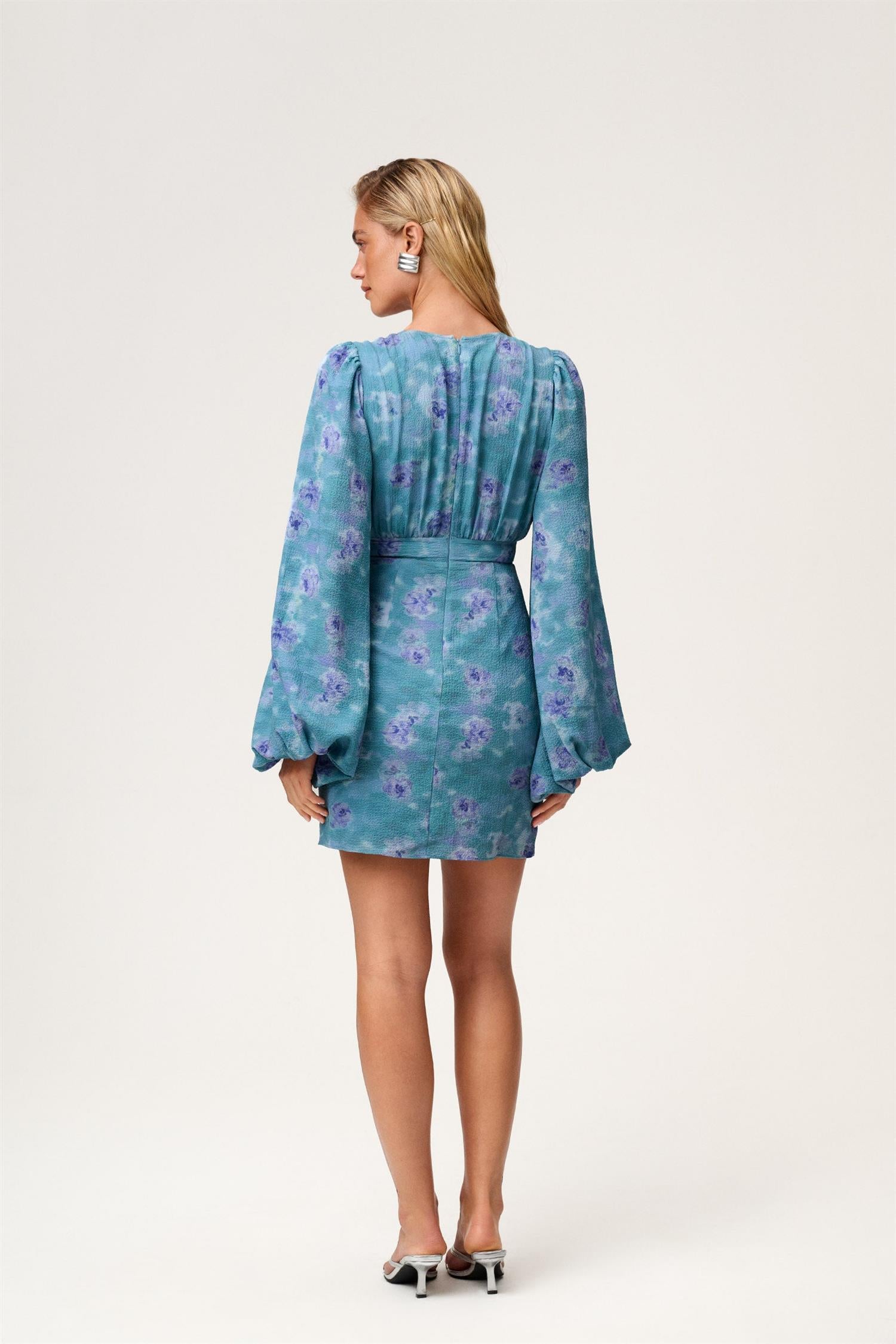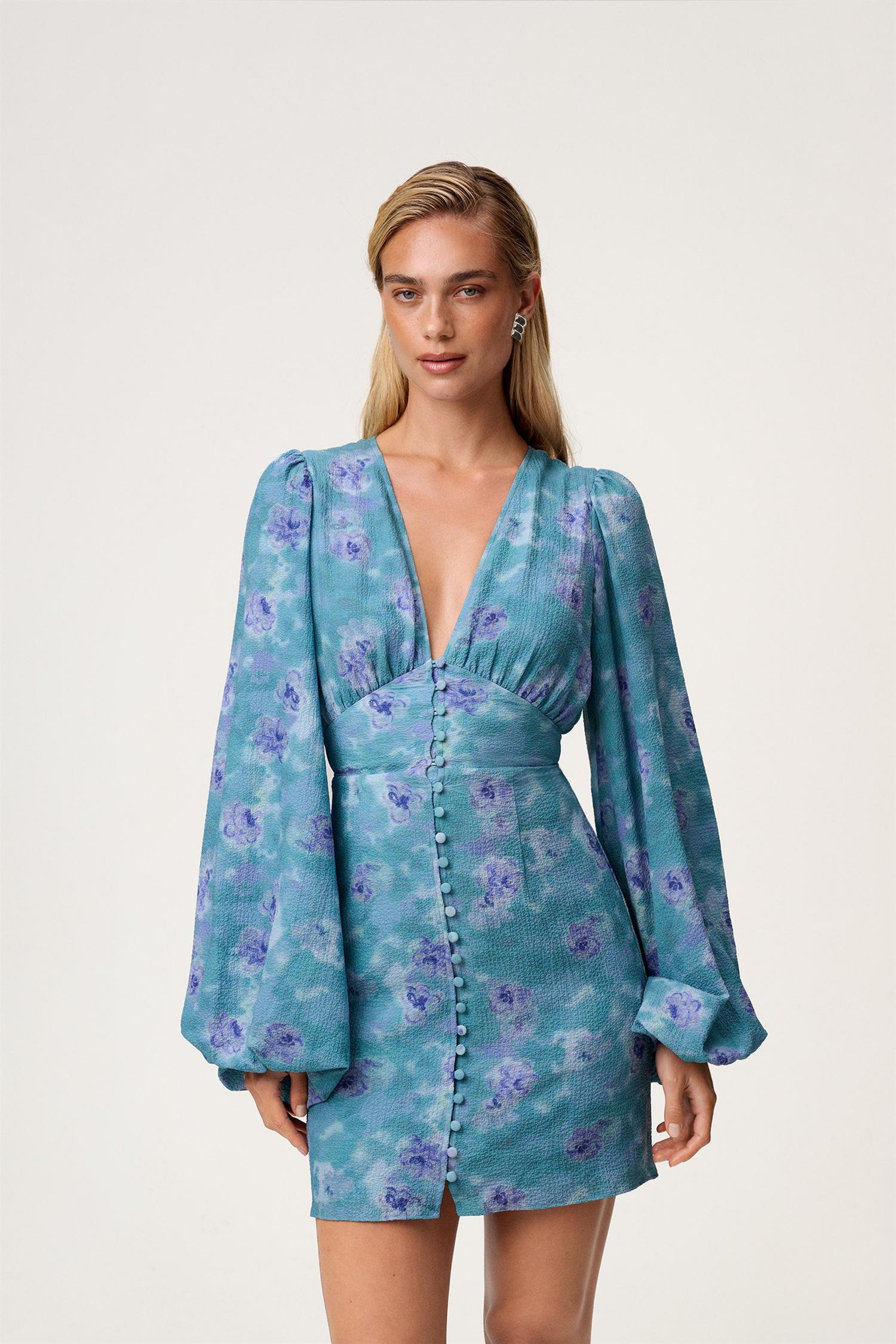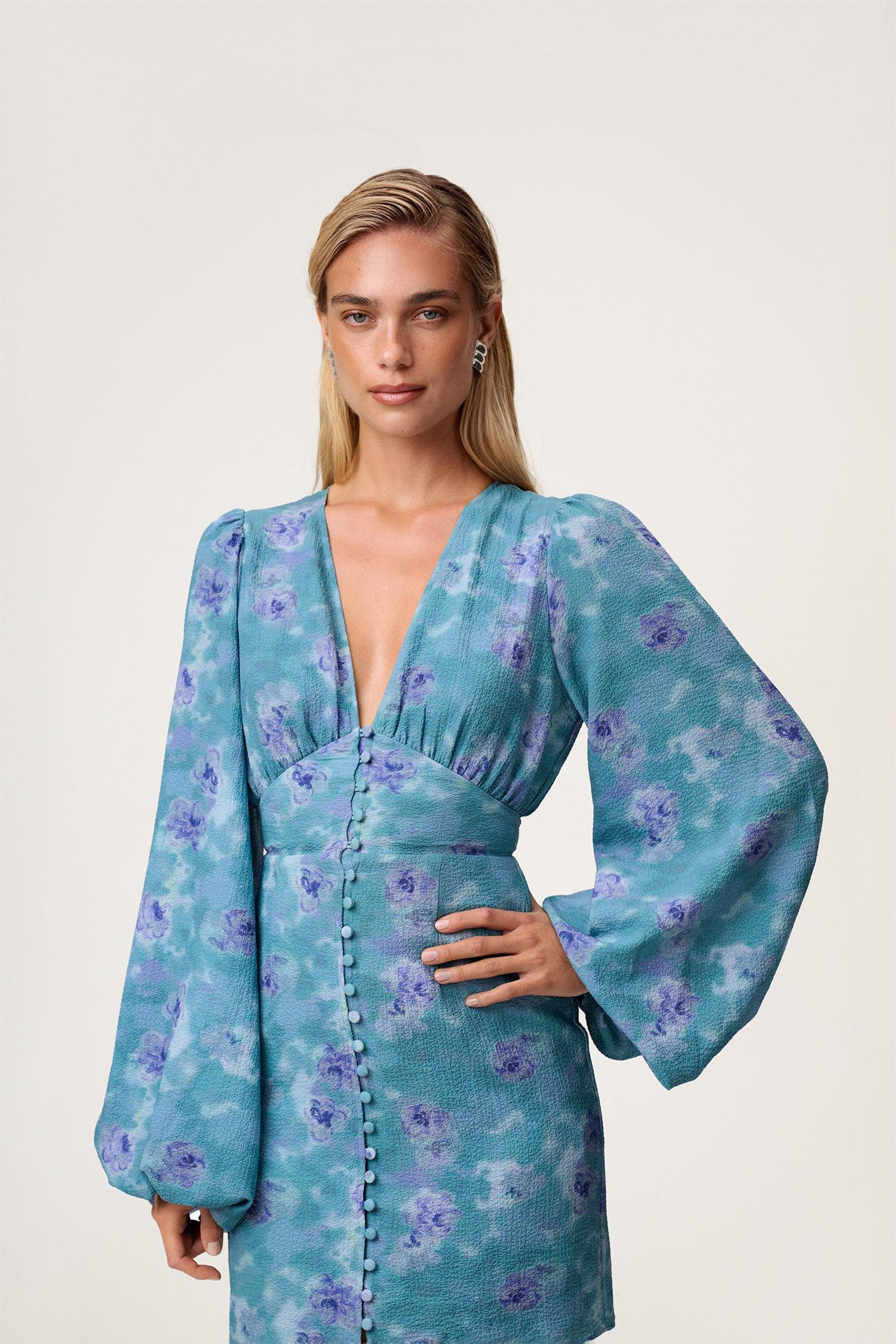 Feminin kjole i blå med delikat blomsterprint i lilla fra Adoore. Modellen er tettsittende med dyp v-hals og har delikate knapper langs fronten. Voluminøse ballongermer med puff i skuldre og strikk i mansjett. Kjolen har lengde til midt på låret, er helforet og lukkes med skjult glidelås bak. En stilig kjole som kan pyntes opp og ned etter anledning.