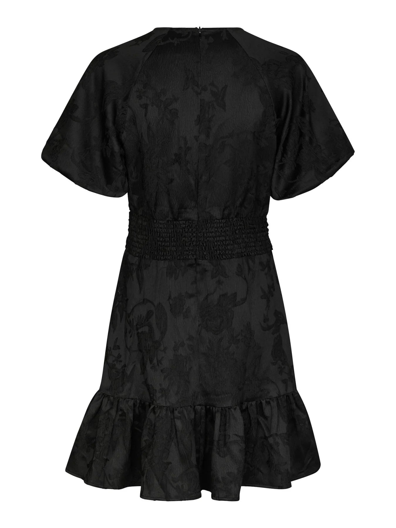 Nydelig minikjole i klassisk sort med ton-i-ton jaquardmønster fra Neo Noir. Modellen er tettsittende i overskoppen med skjørt som skrår ut og avsluttes i elegant volang. Den har lekre draperinger over midje og smock i rygg som skaper perfekt passform. Kjolen har rund hals og elegante puffermer med smock i mansjett. Lukkes med glidelås i ryggen. En perfekt kjole til både hverdags og fest.