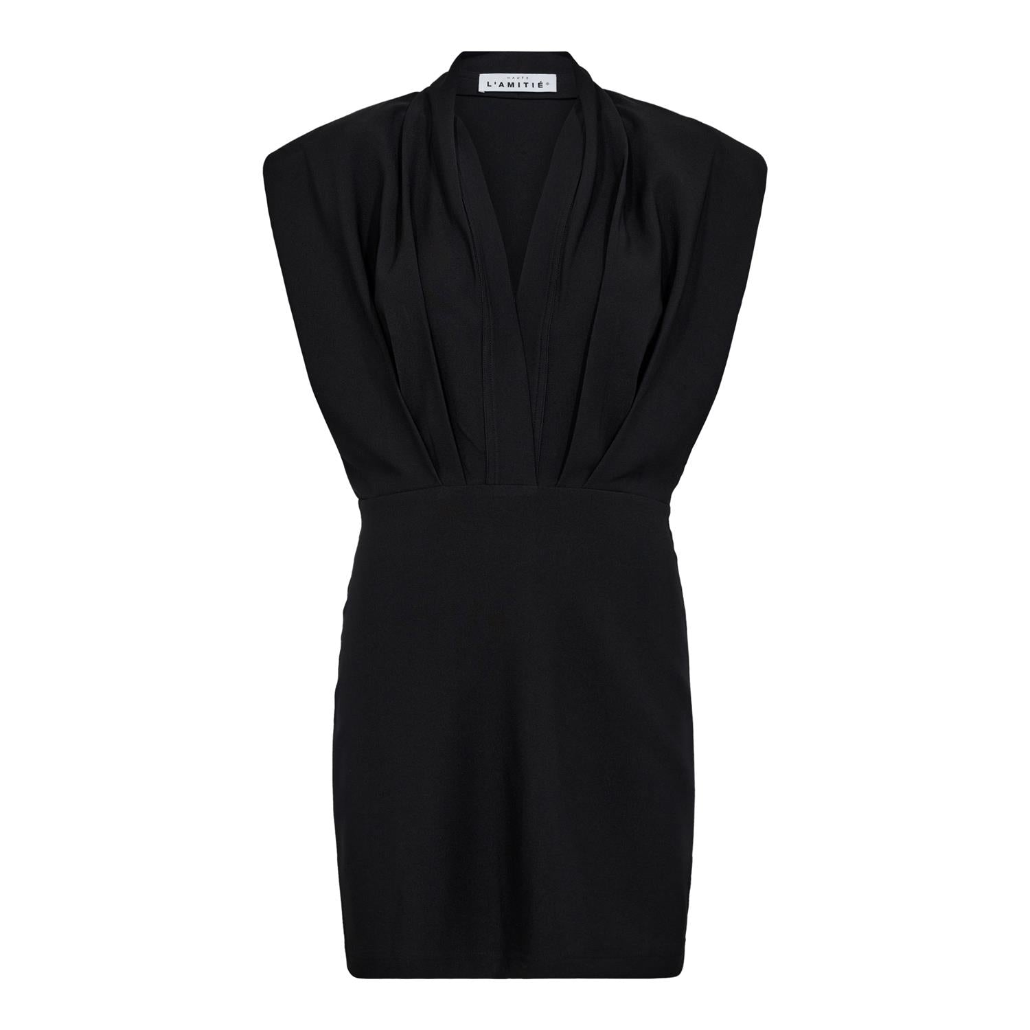 Elegant kjole i klassisk sort fra Haute L'Amitié. Modellen er drapert i front med dyp v-hals og har tettsittende skjørt fra midjen som når til midt på låret. Kjolen er ermløs med vid ermåpning og har lett stretch for flatterene passform og komfort. En klassisker til sesongens festligheter. Lukkning med skjult glidelås i siden.