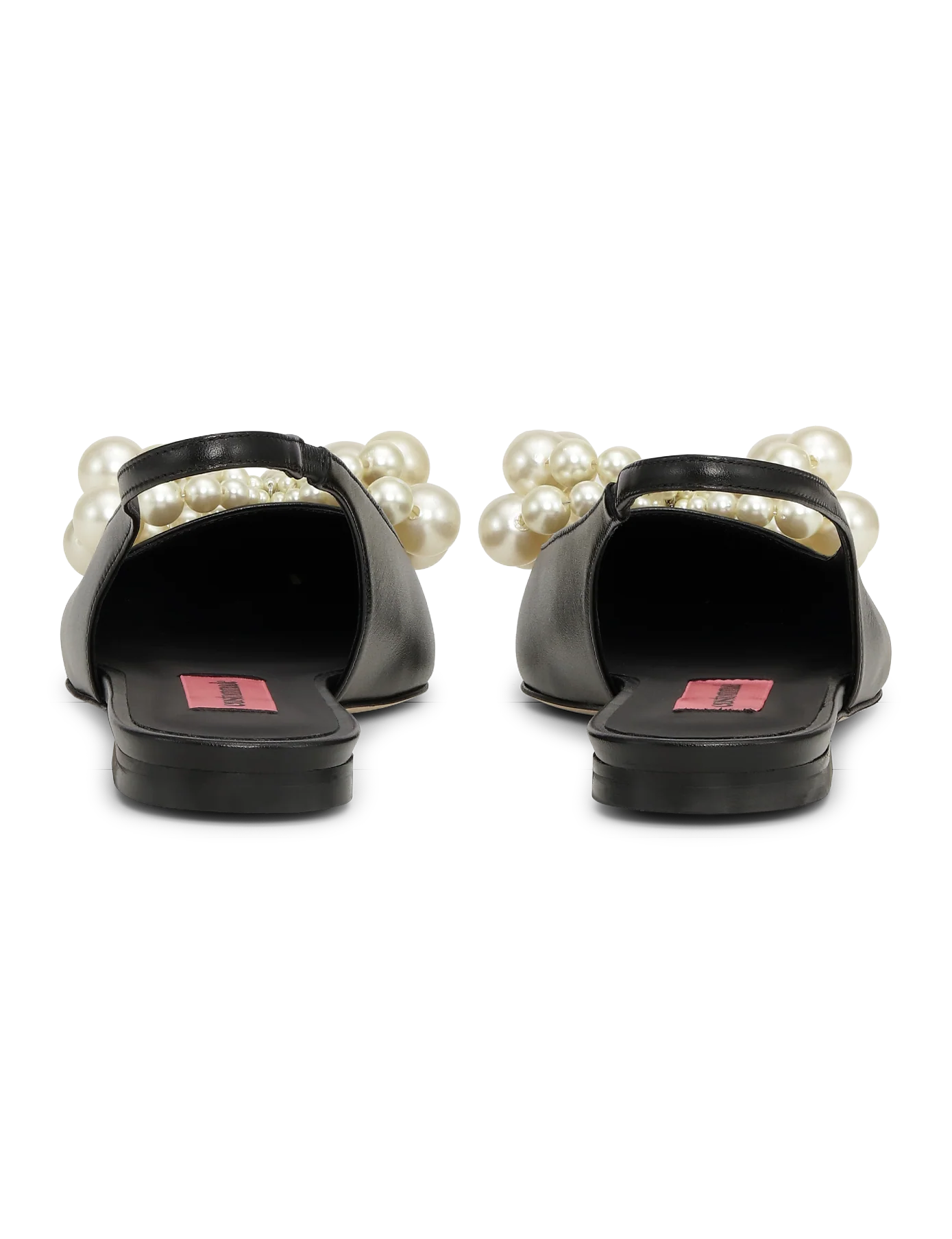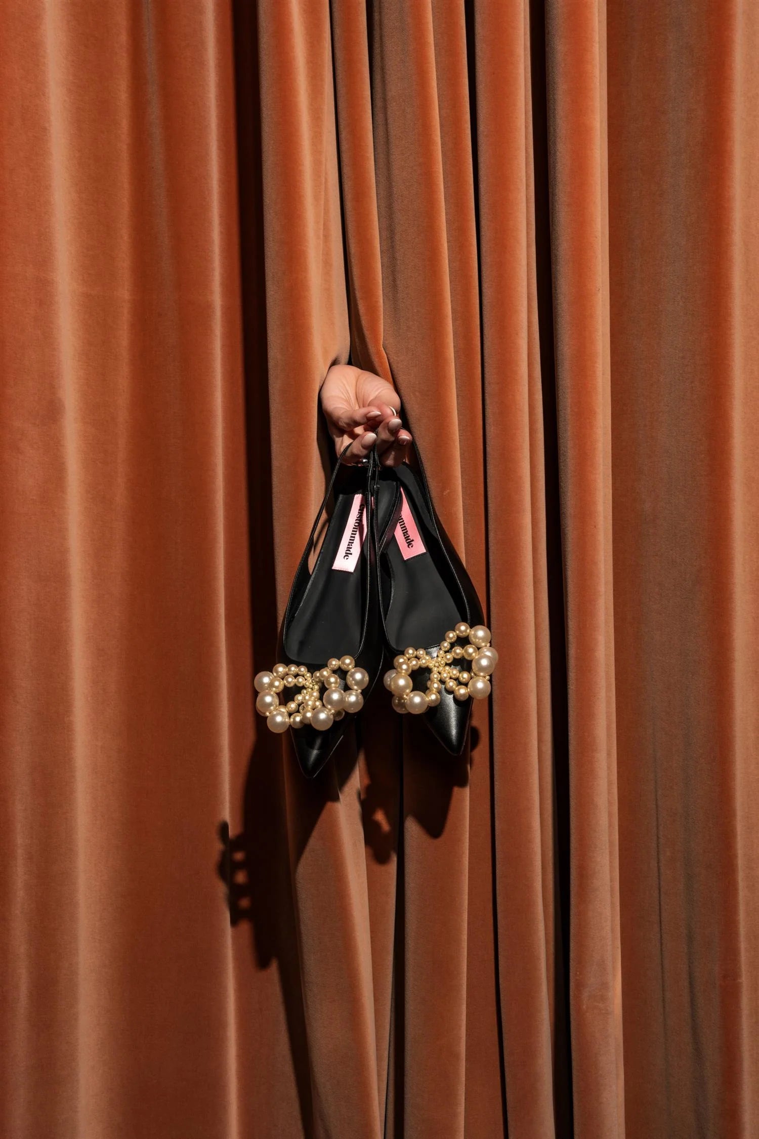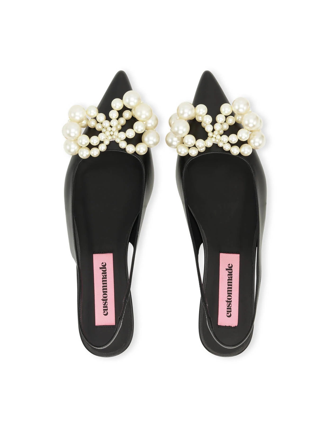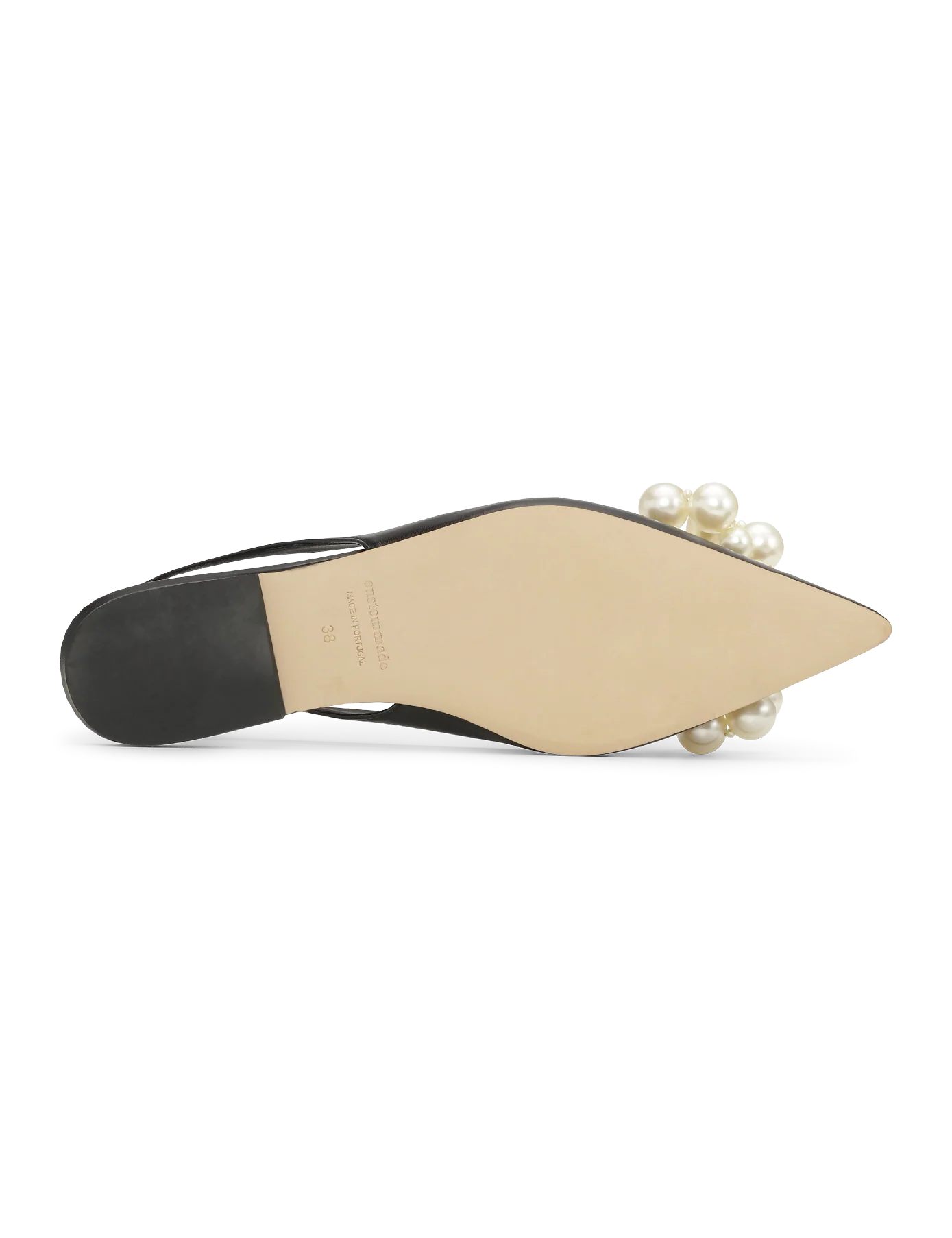 Vakre slingbacks i klassisk sort med burunder såle og delikate perler fra Costummade. Silhuetten er slank og feminin, med en spiss tå som skaper et forlengende uttrykk og gir en sofistikert linje til foten. Perler i ulike størrelser ligger samlet som et smykkeparti over vristen – et iøynefallende design som fanger lyset og fungerer som et naturlig blikkfang. Den myke slingback-stroppen følger hælen uten å stramme, og gir deg komfort gjennom lange dager og sene kvelder. Det flate designet uten hæl gjør skoen til et elegant alternativ for deg som ønsker stil uten høyde, perfekt både til hverdags og spesielle anledninger. Med Fiona får du tidløs eleganse i hver steg!