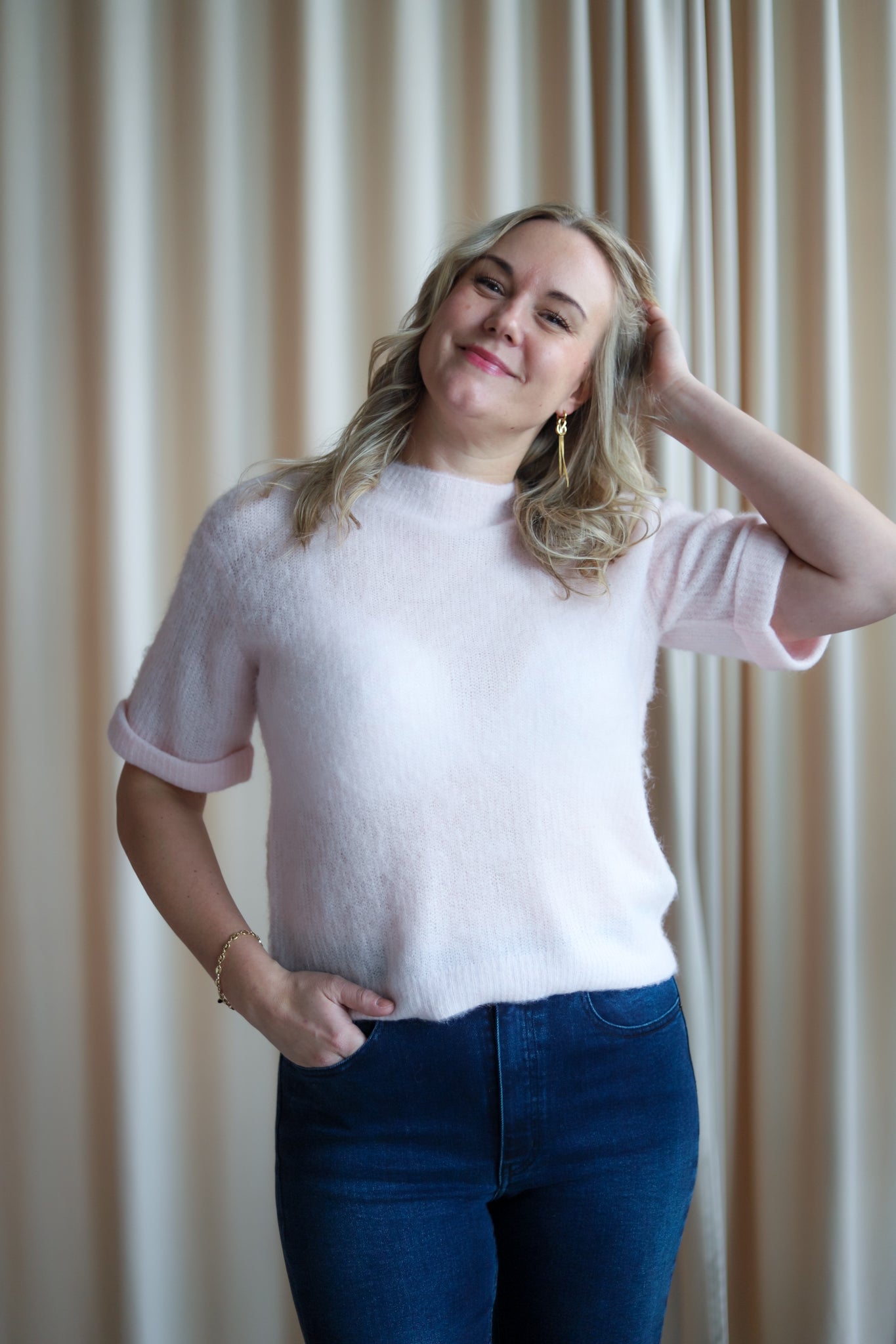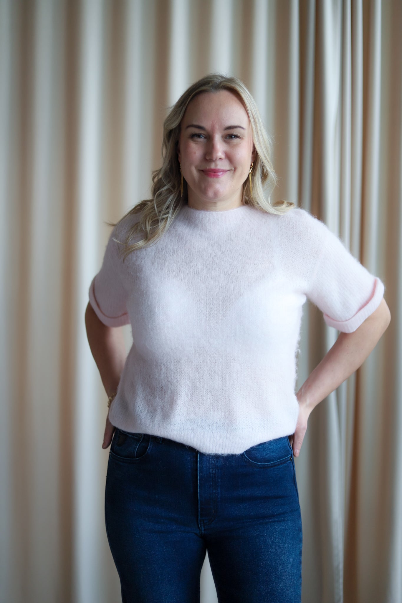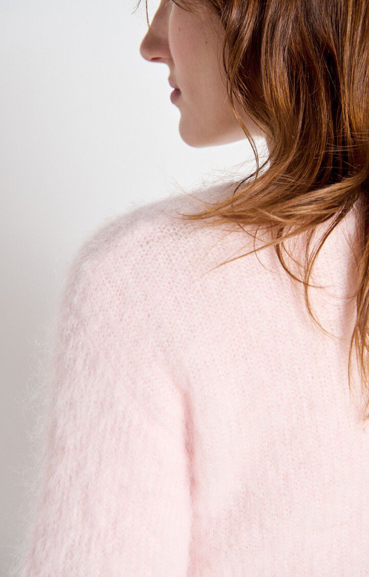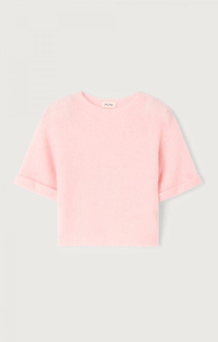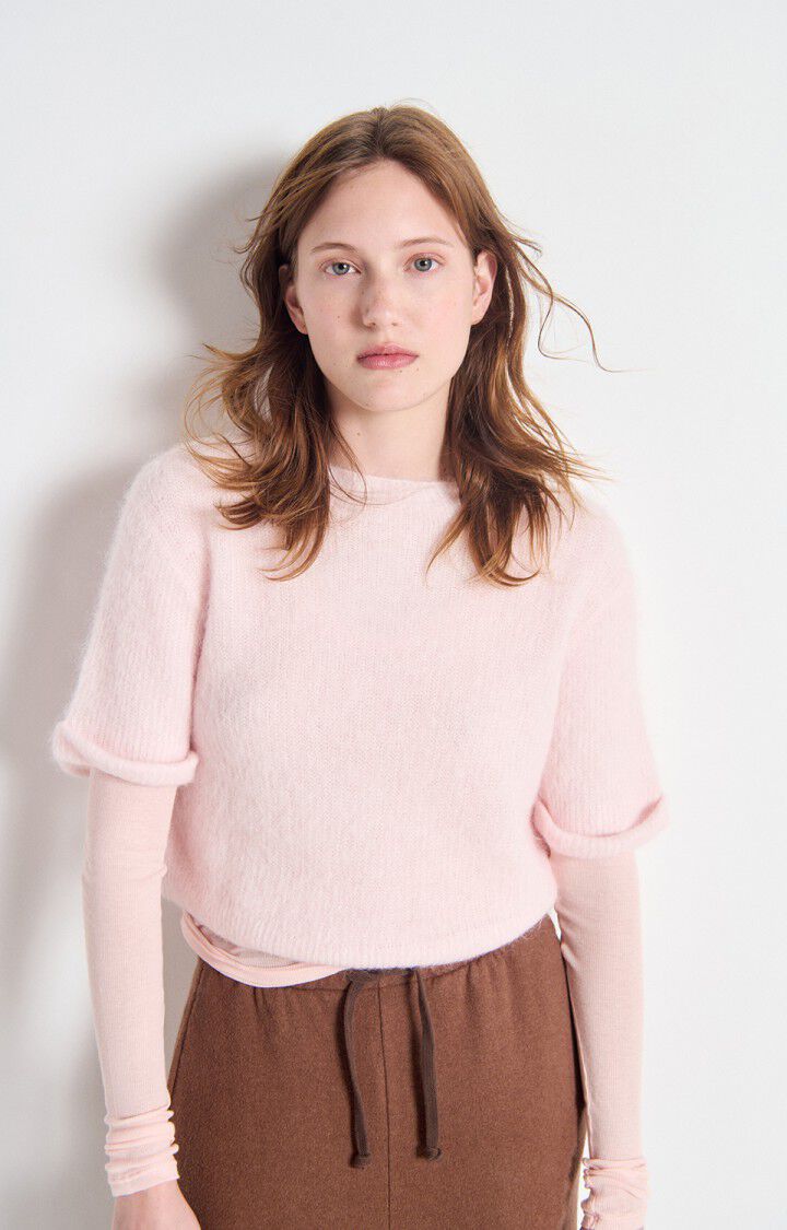 Søt strikk i lys rosa fra American Vintage. Modellen er rett med rund hals og korte ermer med droppet skuldrer. Myk ogdeilgi ribbestrikk som varmer godt.