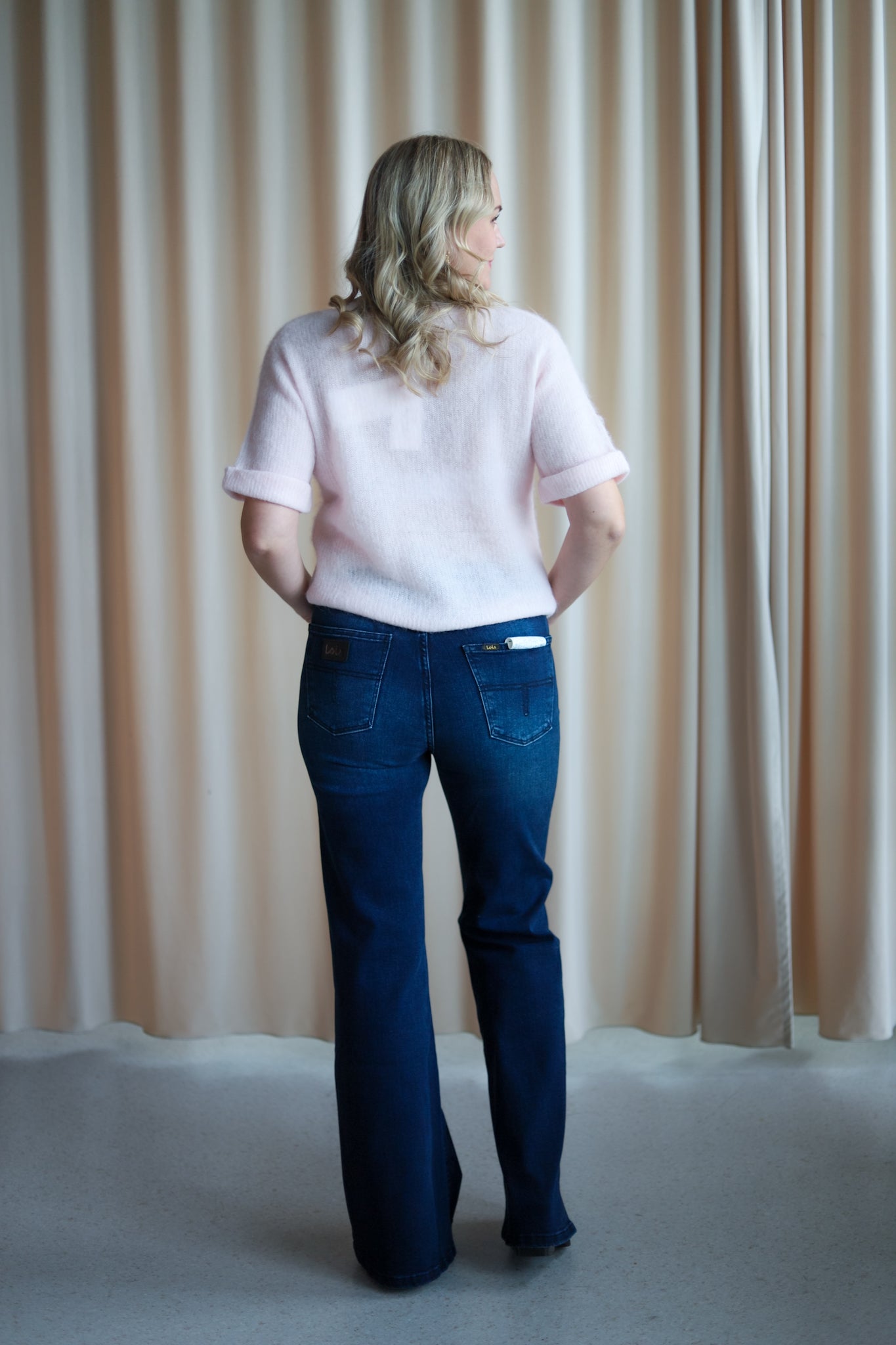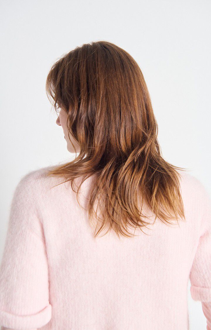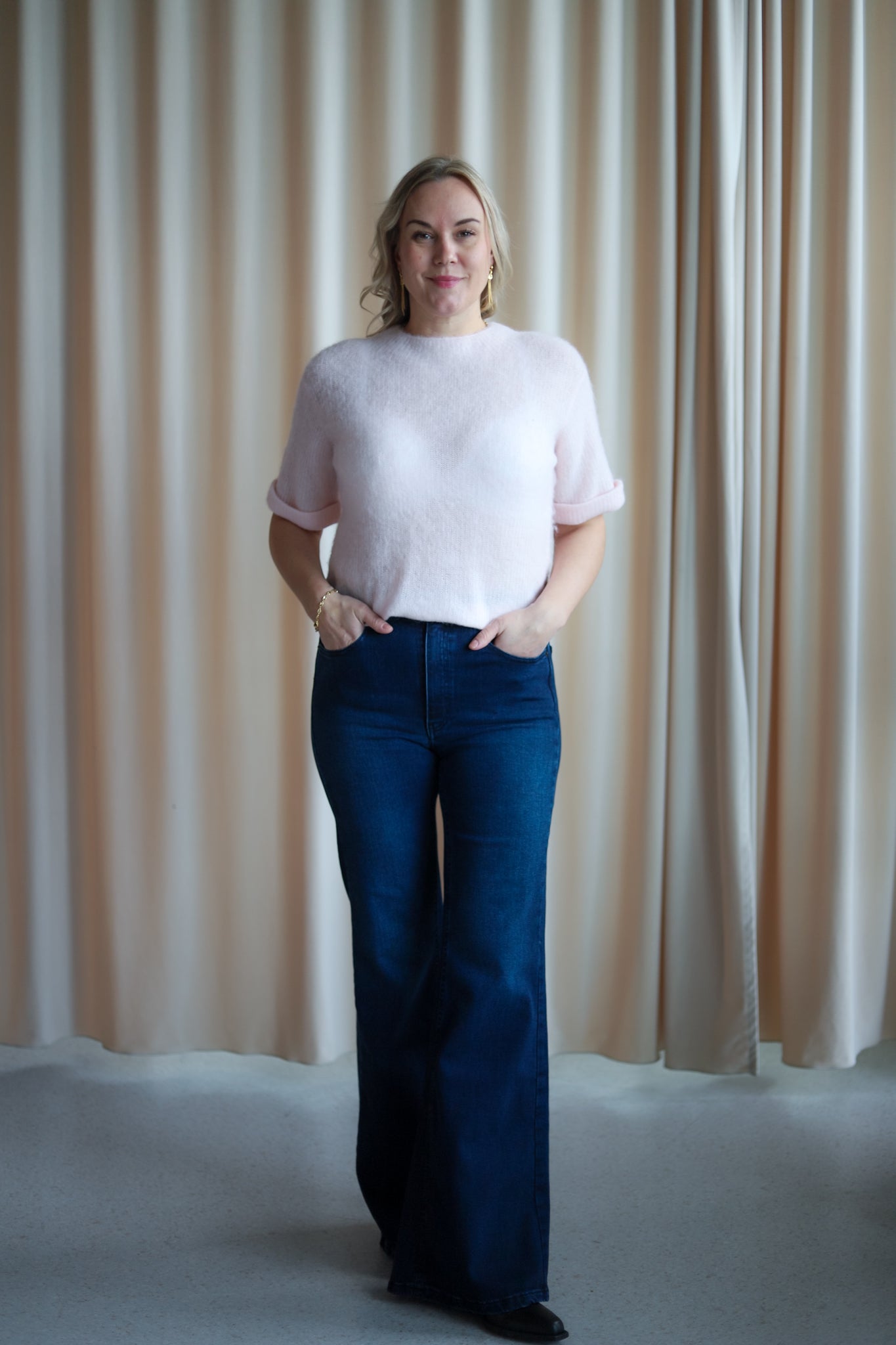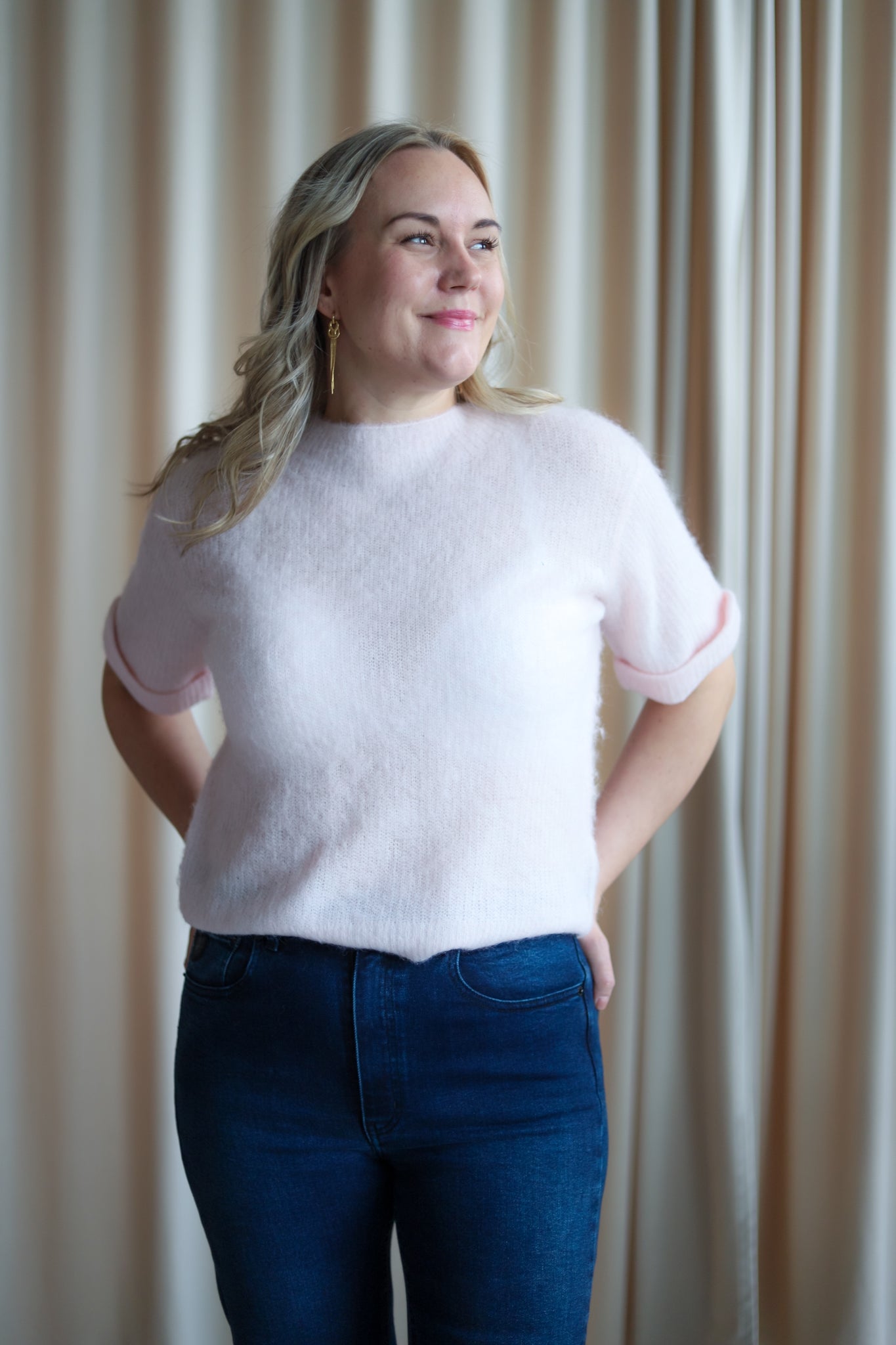 Søt strikk i lys rosa fra American Vintage. Modellen er rett med rund hals og korte ermer med droppet skuldrer. Myk ogdeilgi ribbestrikk som varmer godt.