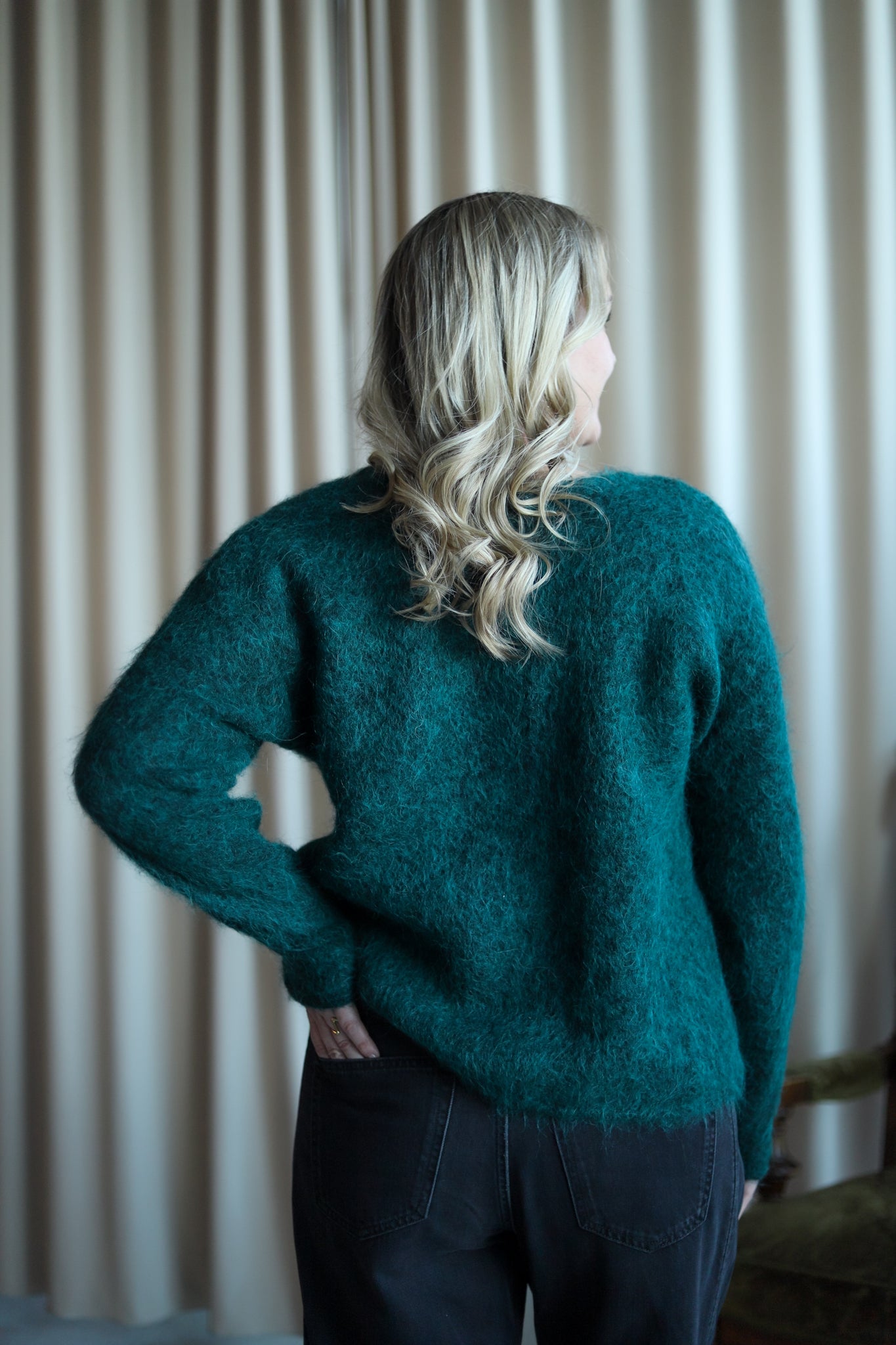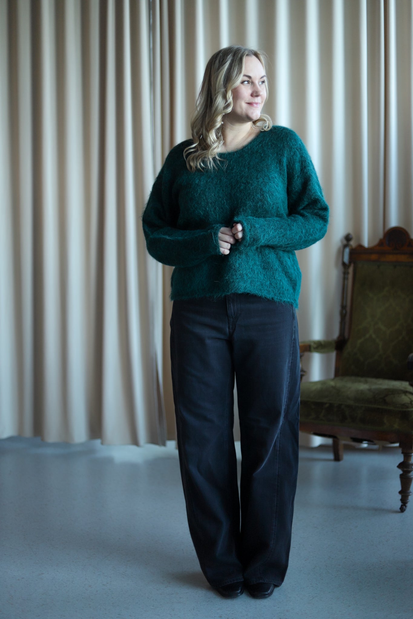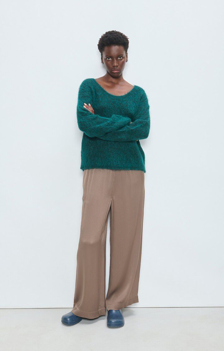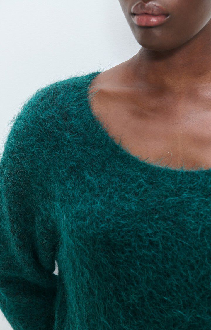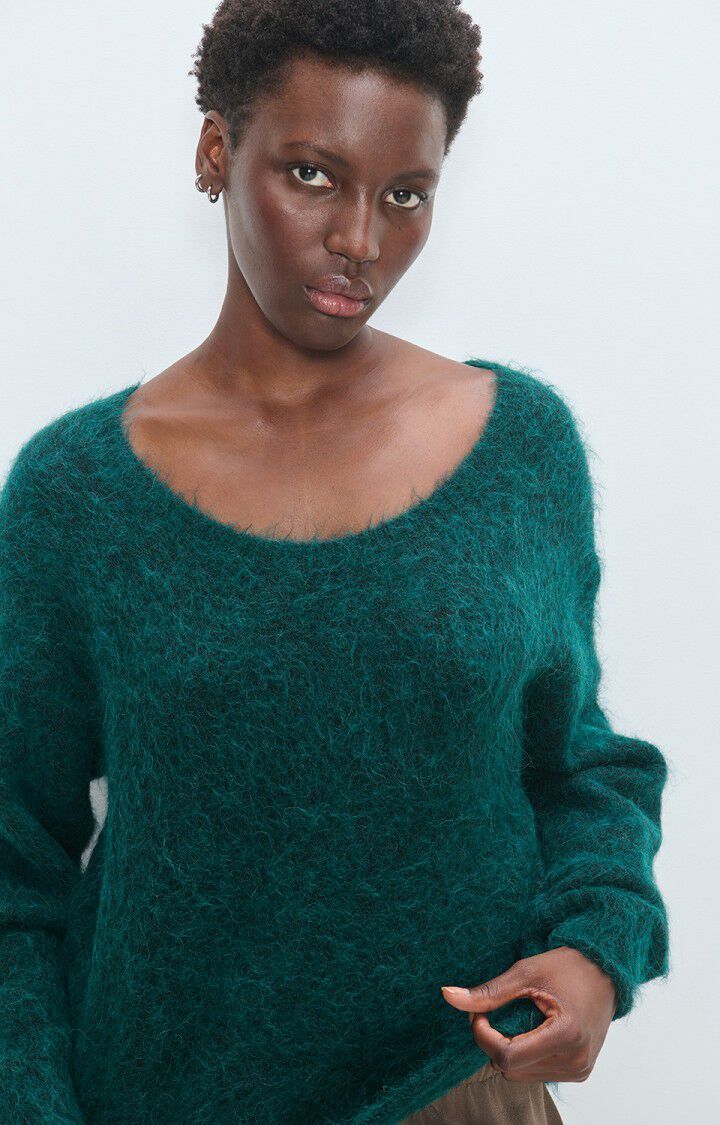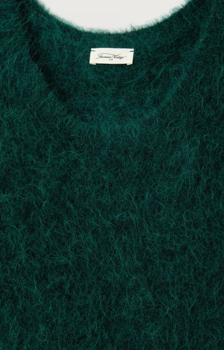 Herlig strikk i mørk grønn fra American Vintage. Modellen er rett med dyp rund hals og lange ermer med droppet skulder. Smal ribbestrikk i hals, hem og mansjett. Deilig kvalitet med fluffy uttrykk.