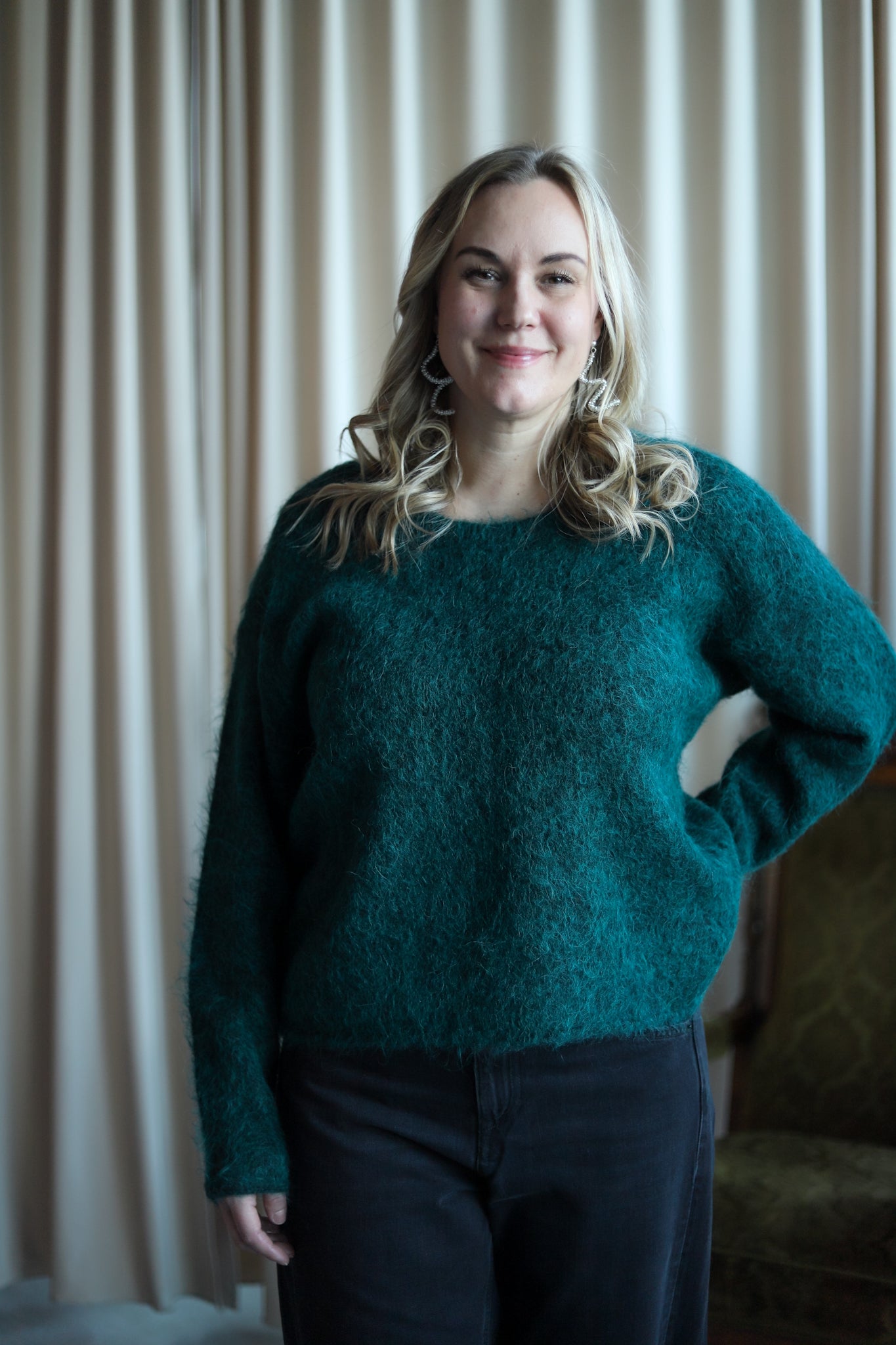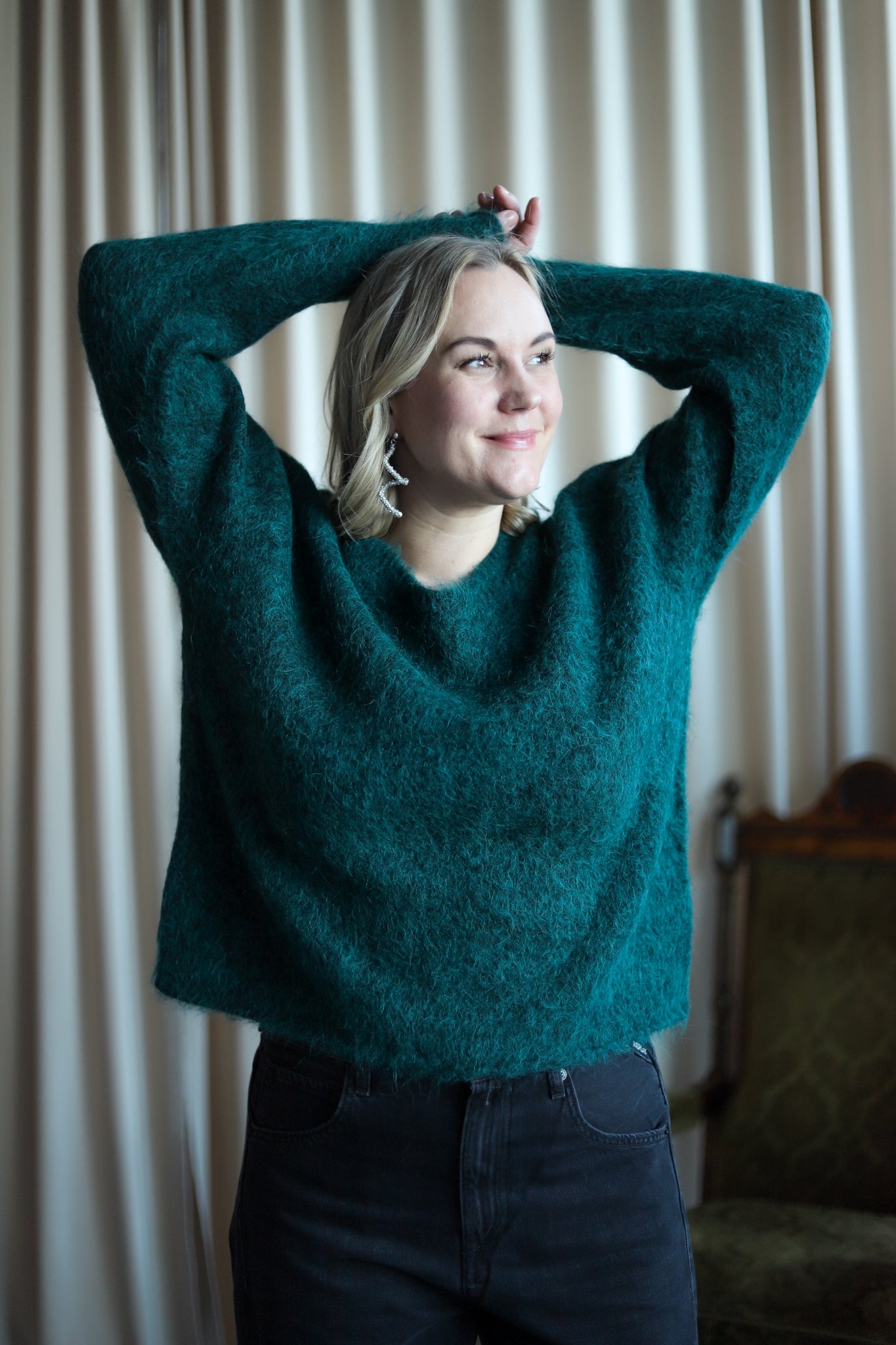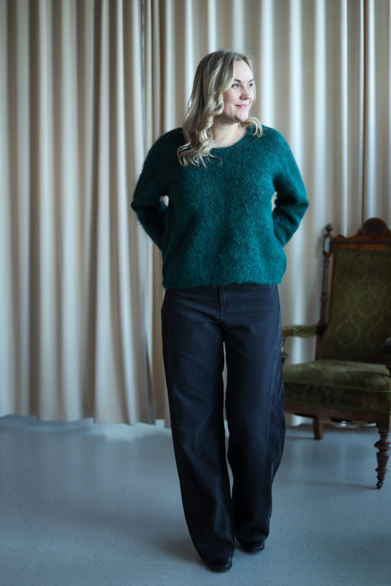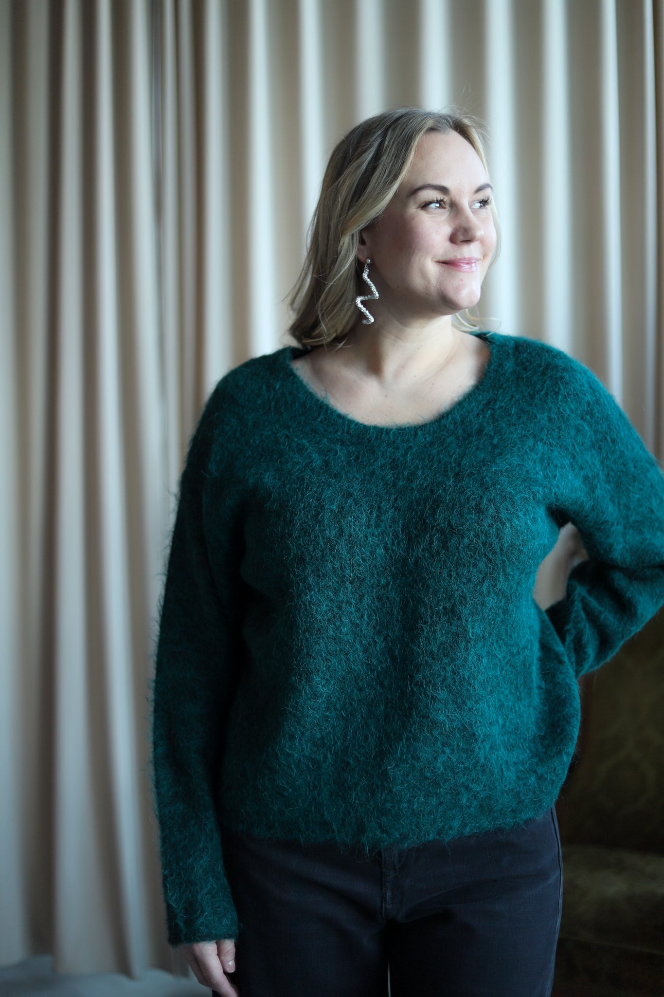 Herlig strikk i mørk grønn fra American Vintage. Modellen er rett med dyp rund hals og lange ermer med droppet skulder. Smal ribbestrikk i hals, hem og mansjett. Deilig kvalitet med fluffy uttrykk.