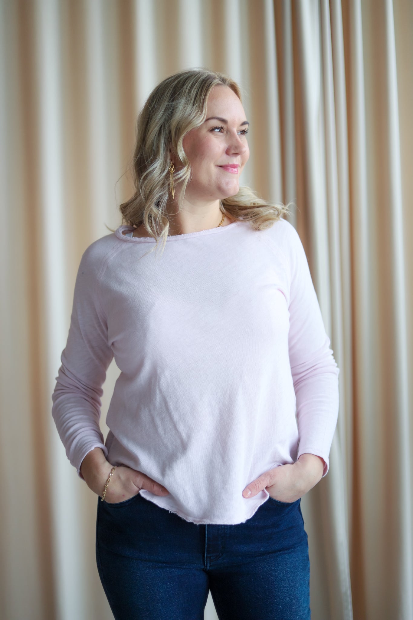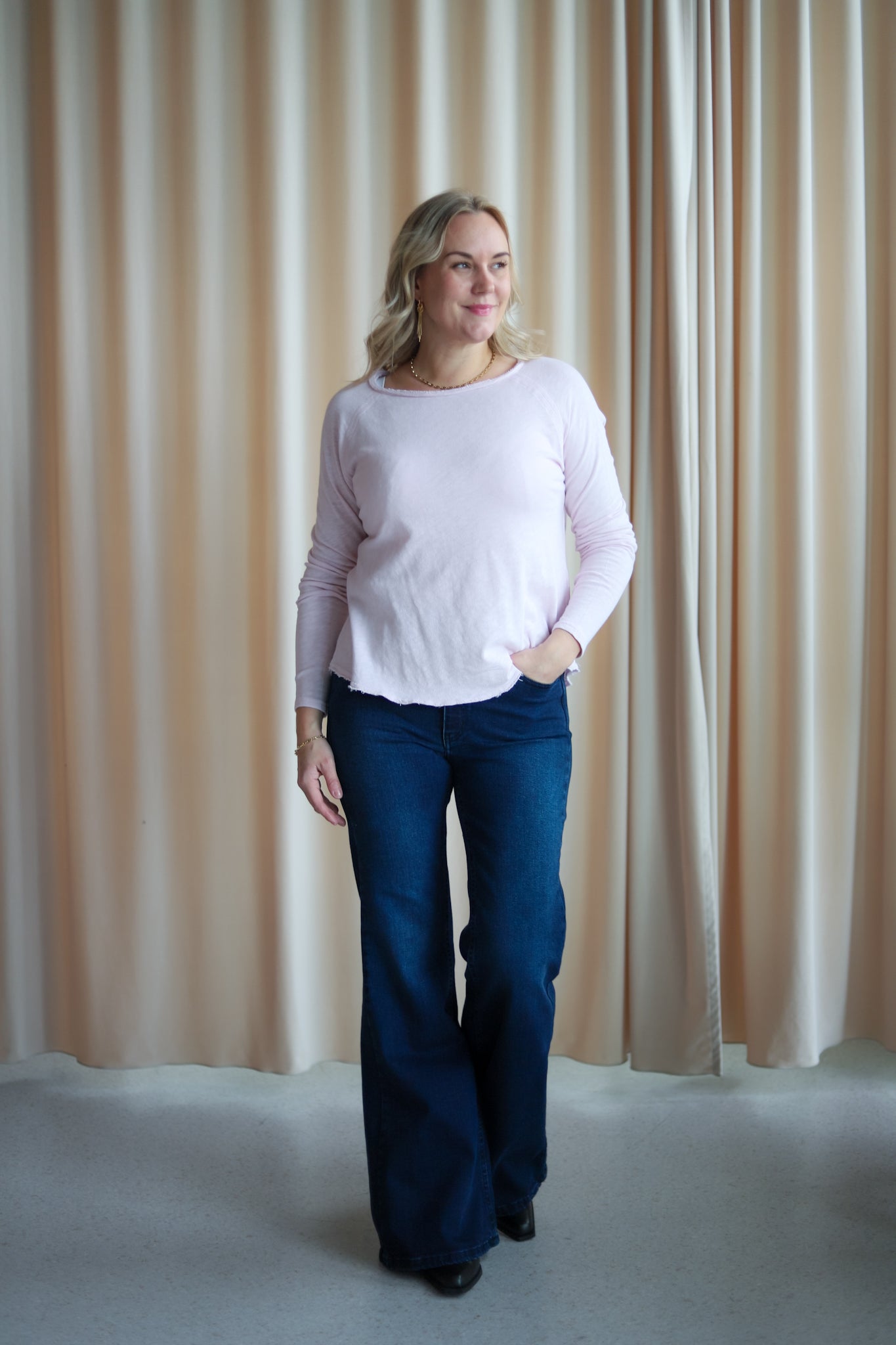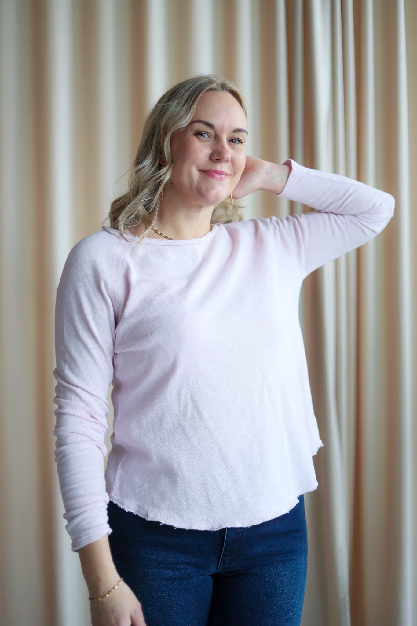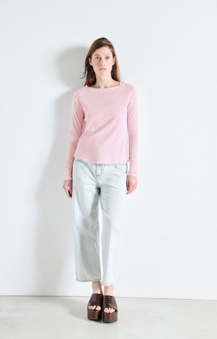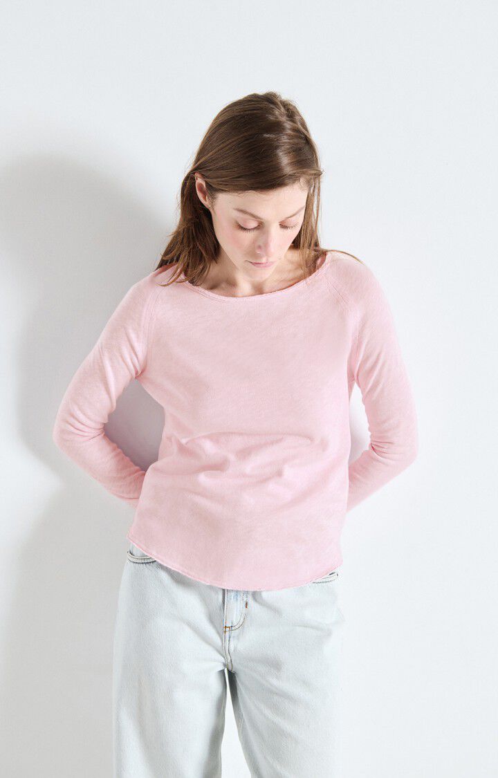 Perfekt basic langermet genser med råkanter fra American Vintage. Deilig myk og passe tykk bomullskvalitet med fin struktur i stoffet. Feminin modell med båthals, raglanermer, lett innsving og buet hem. Her i lys rosa. En flott basic genser til hverdagen - perfekt til jeans!