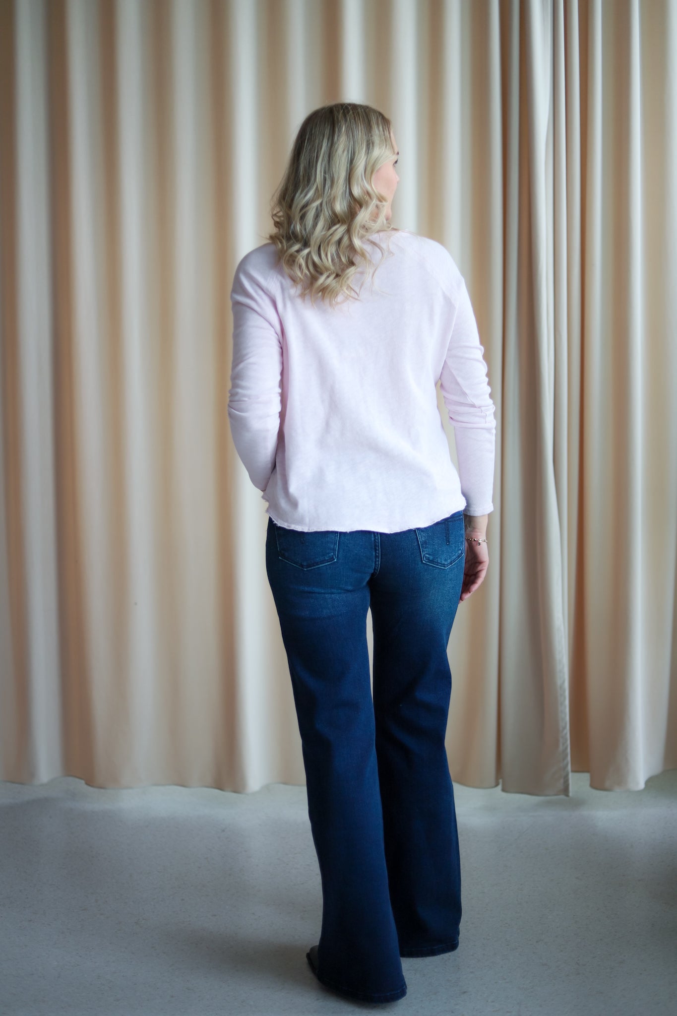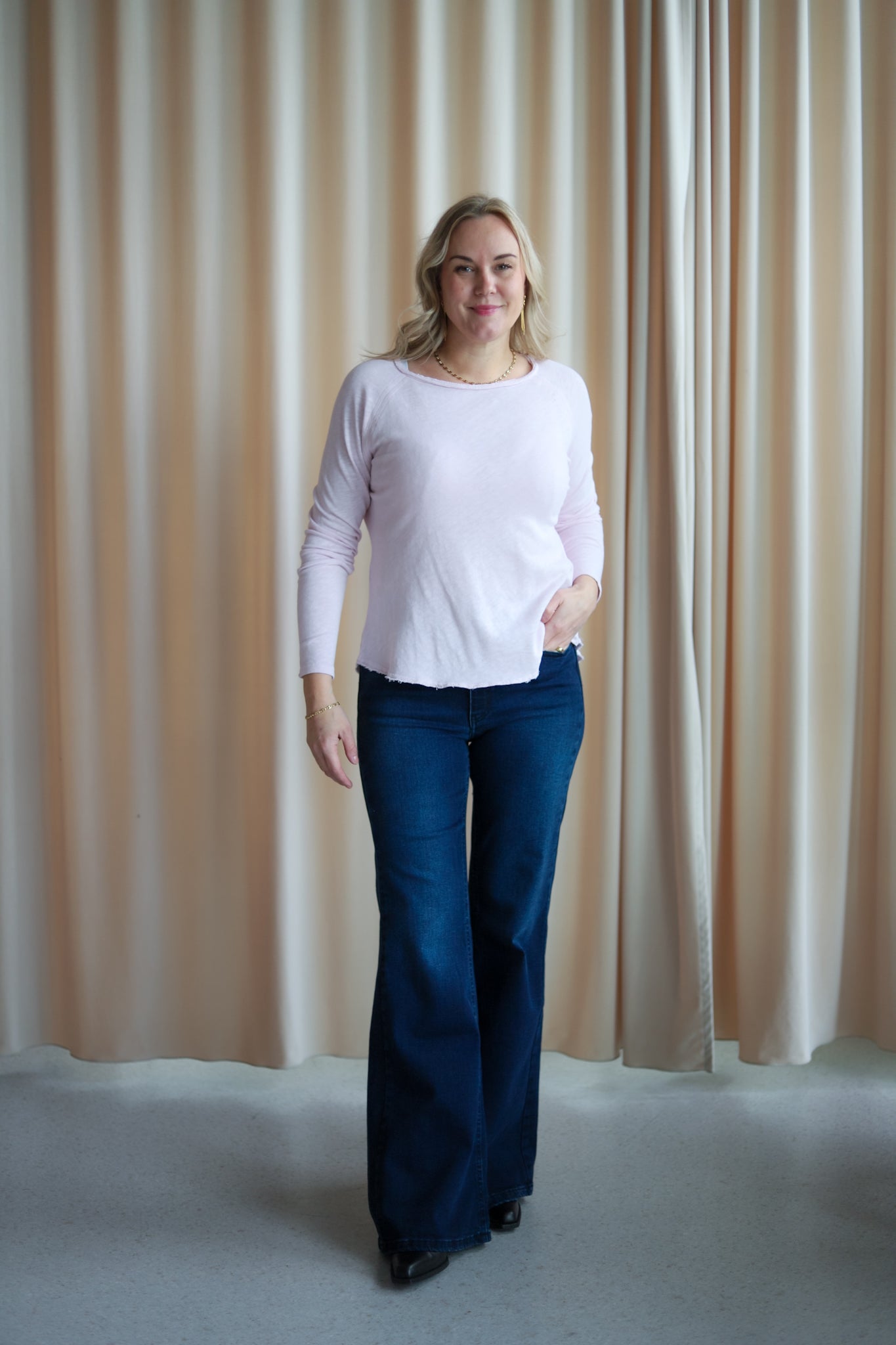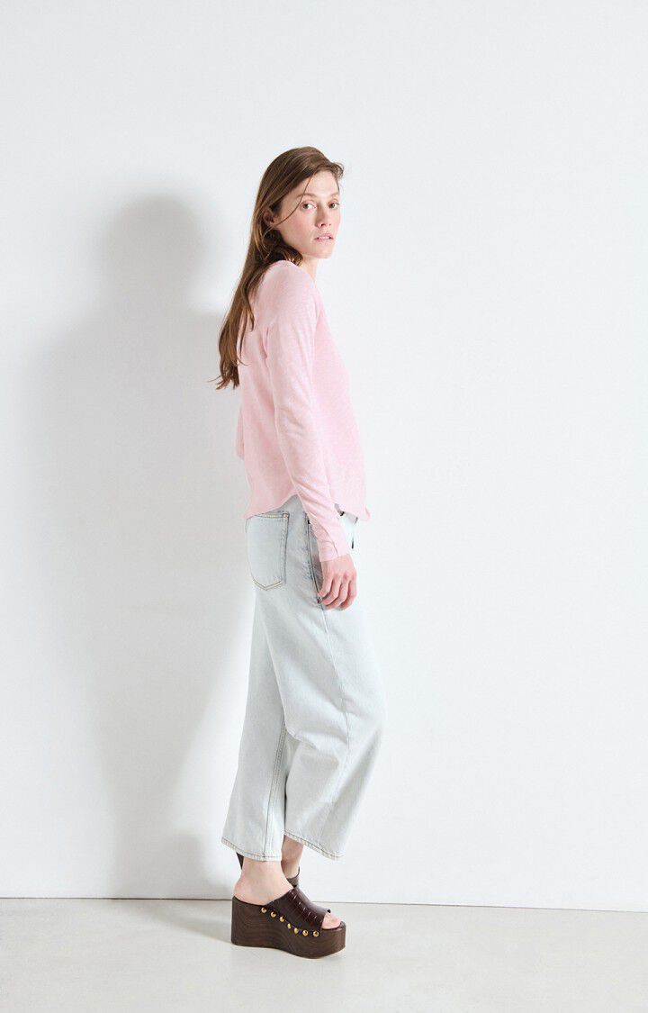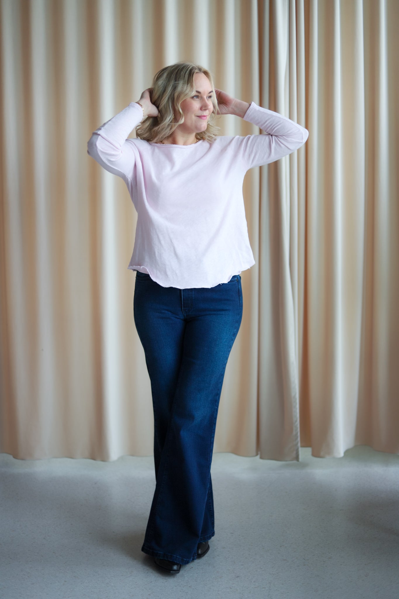 Perfekt basic langermet genser med råkanter fra American Vintage. Deilig myk og passe tykk bomullskvalitet med fin struktur i stoffet. Feminin modell med båthals, raglanermer, lett innsving og buet hem. Her i lys rosa. En flott basic genser til hverdagen - perfekt til jeans!
