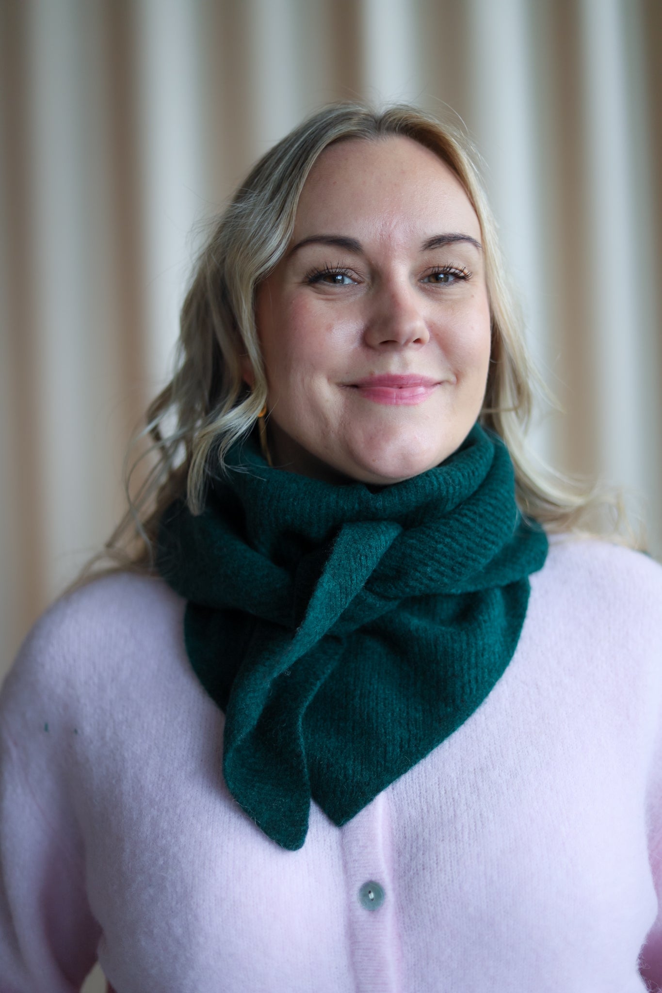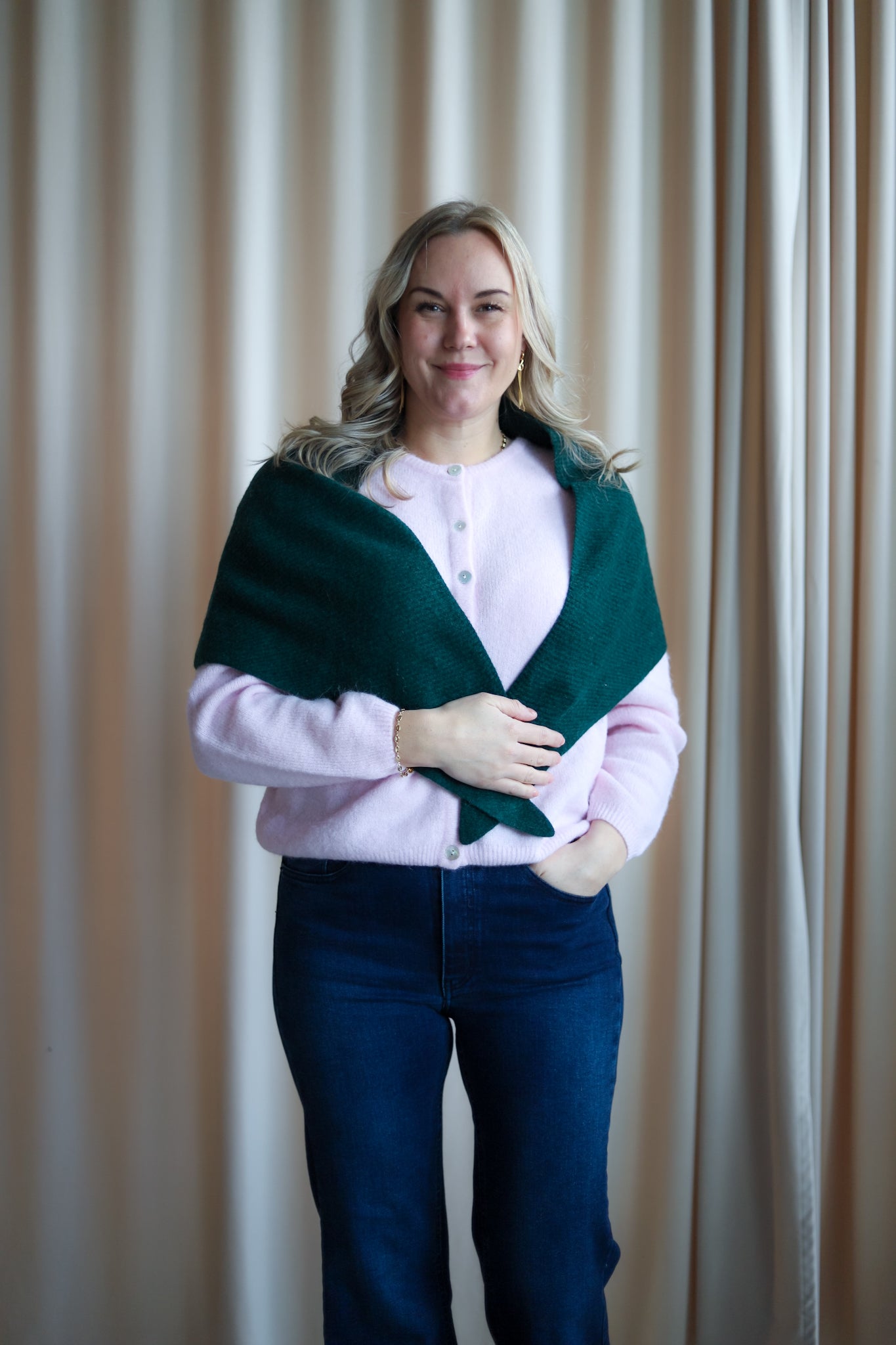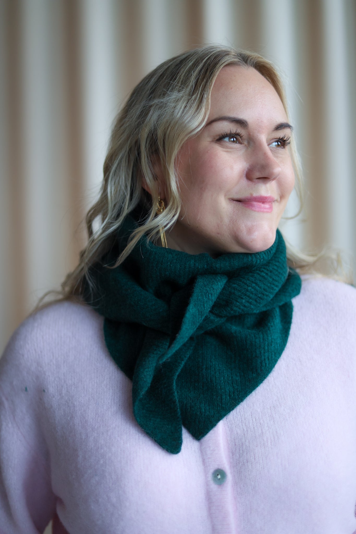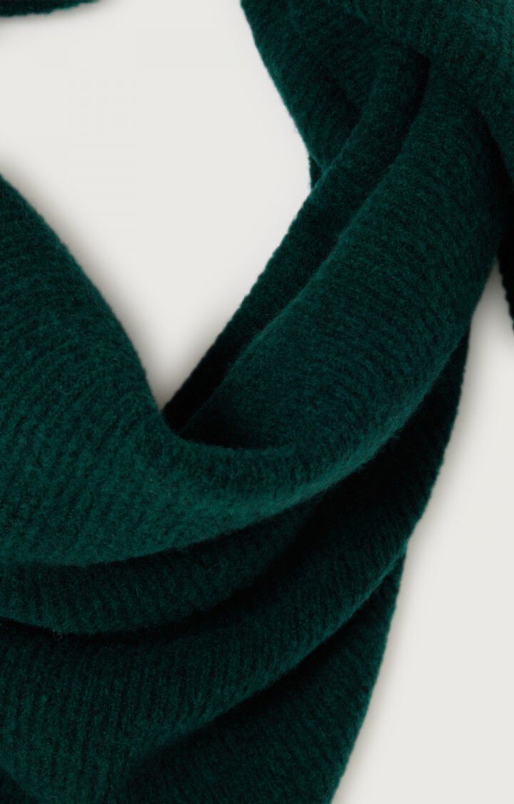 Deilig trekantskjerf i grønn og sortmelert fra American Vintage. Myk ullblanding som er ribbestrikket og føles nydelig mot huden.