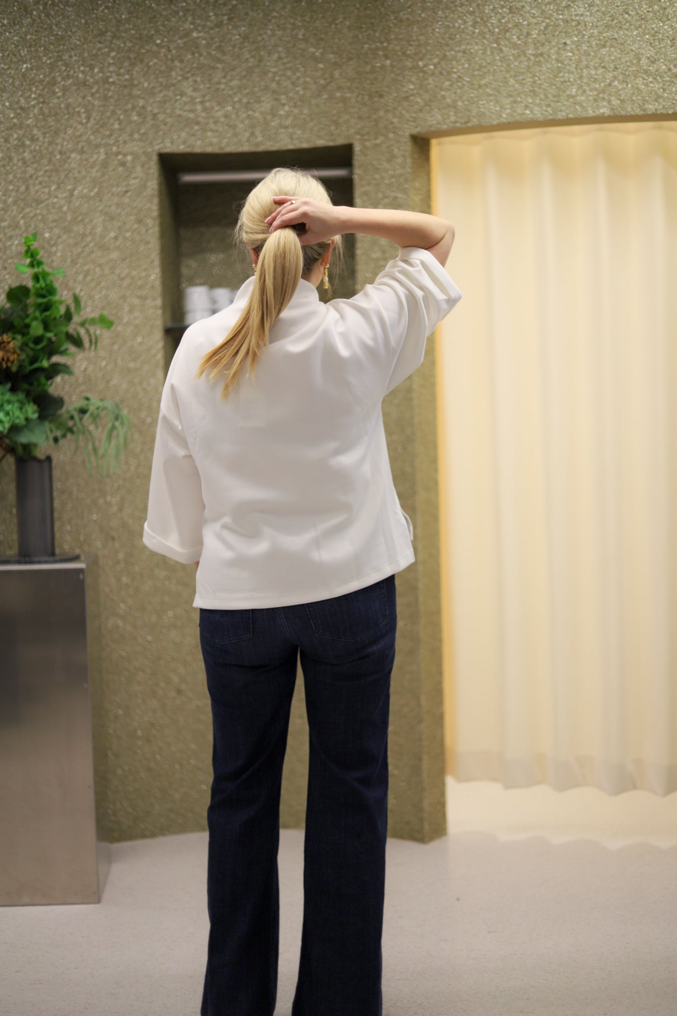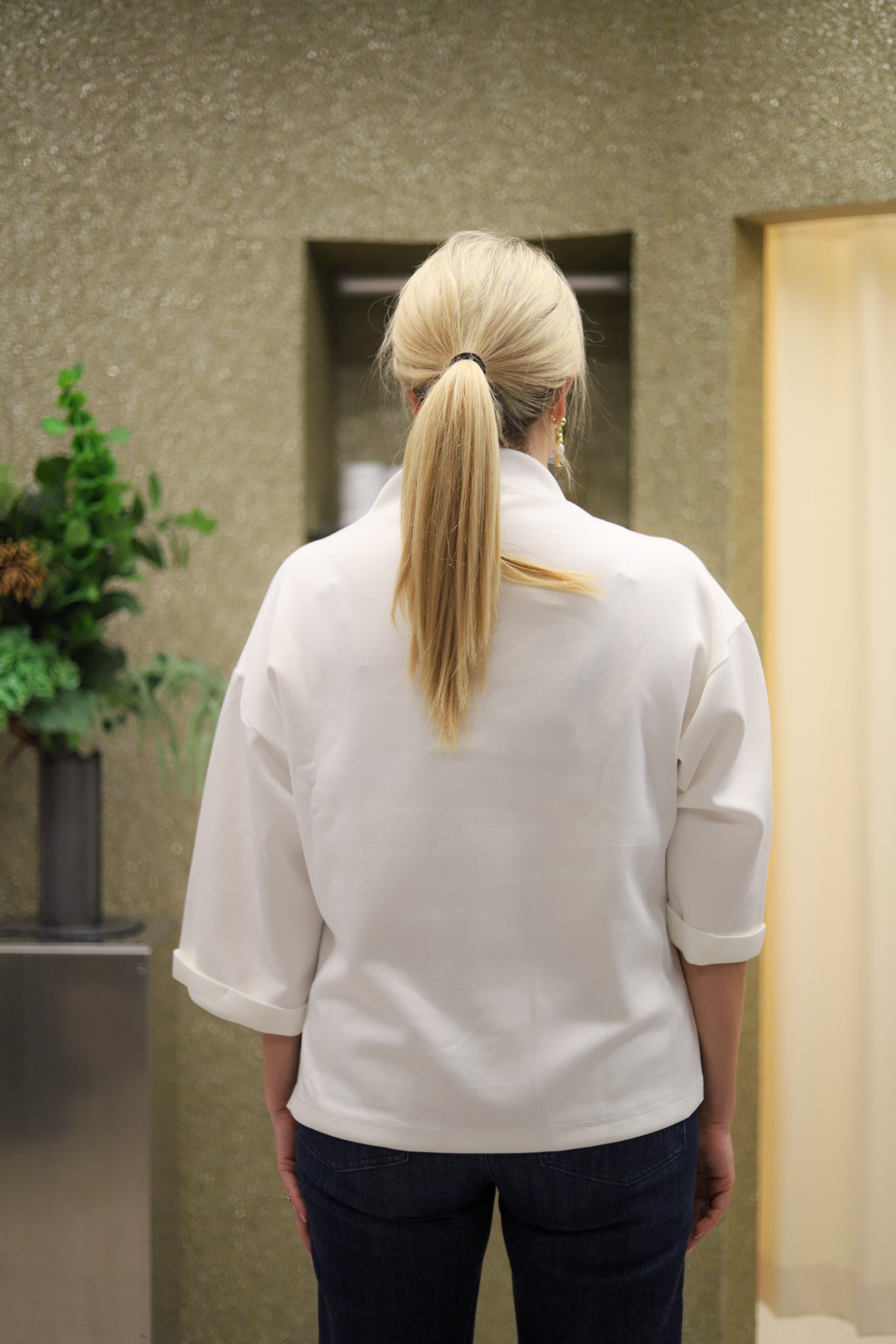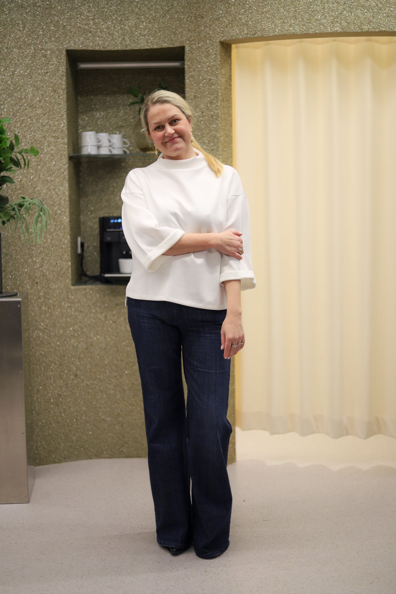 Stilren topp i off-white fra Iben. Tidløs modell med rett passform og nett hoftelengde. Vid semihøy hals og vide trekvartlange ermer med droppet skulder og delikat oppbrett i mansjett. Det perfekte hverdagsplagget som passer til alt. Laget av en tykk viskosejersey av premiumkvalitet, den gir en luksuriøst myk følelse som føles behagelig mot huden.