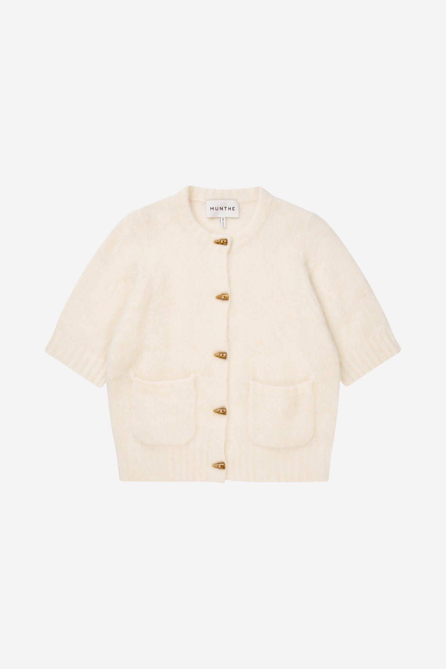 Cardigan i kremhvit med søte imiterte hornknapper og en elegant børstet overflate fra Munthe. Nydelig myk kvalitet med rund hals og knappestolpe i front. Designet med albulange ermer og to fine lommer foran. Bruk den alene, over en skjorte eller under en blazer!