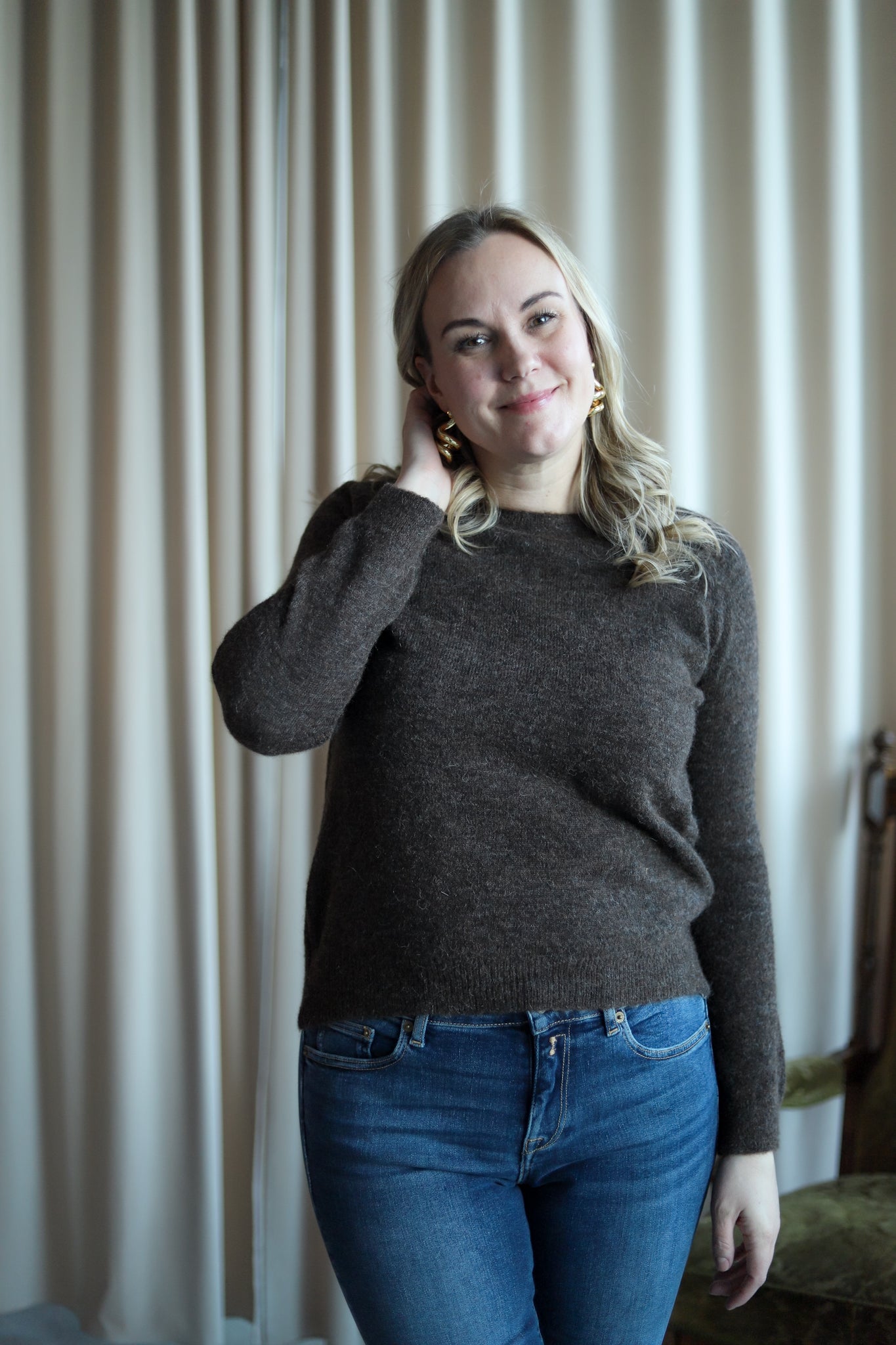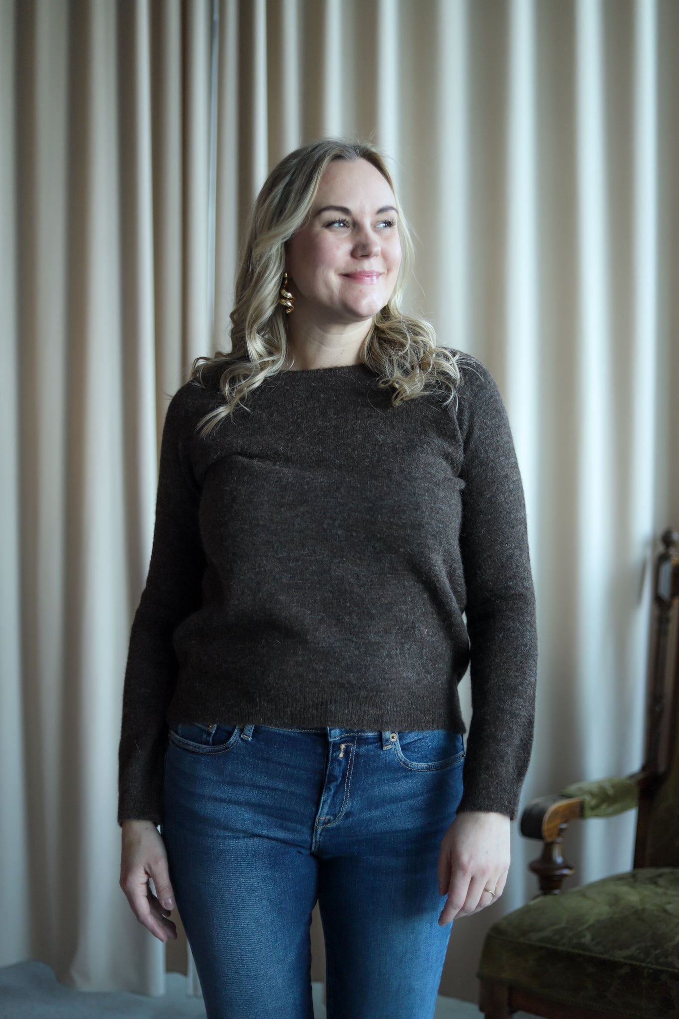 Bestselgeren Fiona fra Arnie Says er tilbake i sesongens farger. Deilig strikket genser i en flott mørk brun melert farge. En klassisk strikk med raglanermer og regulær nett fasong. Glattstrikket med smal ribb langs alle kanter. Deilig myk ullblanding som er passe tykk og ikke bygger for mye. En perfekt basic genser til helårsgarderoben!