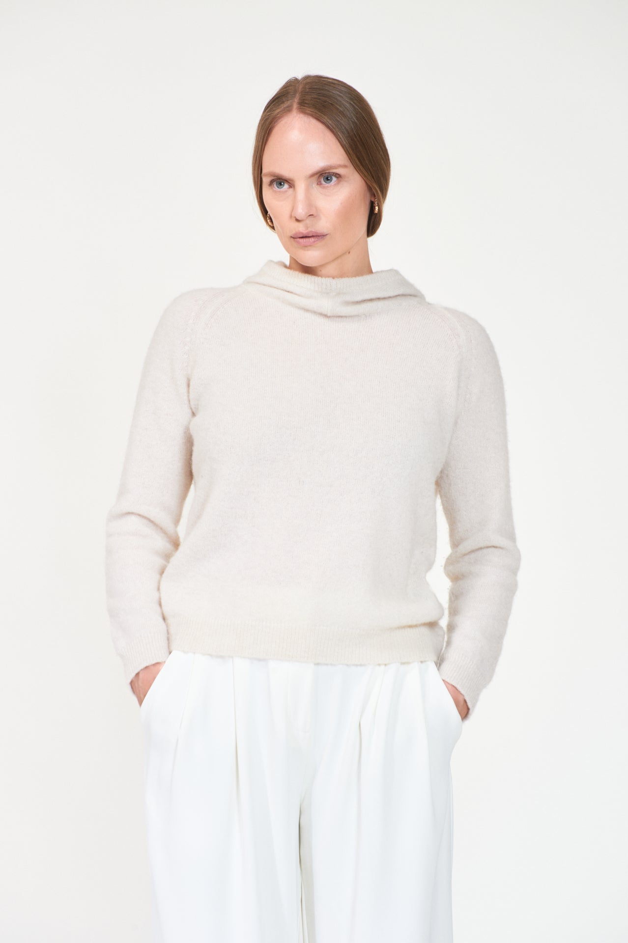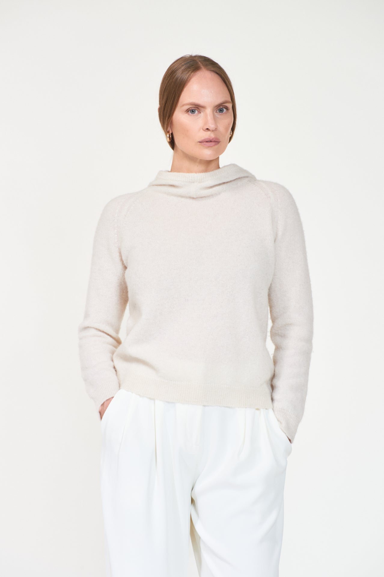 Strikket hoodie i delikat offwhite farge fra Arnie Says. En avslappet variant av bestselgeren Fiona – Vero er en hettegenser i den samme myke og slitesterke alpakkablandingen. Modellen har raglanermer, ribbestrikkede kanter og en ledig passform som gjør den like komfortabel som anvendelig. En hverdagsfavoritt med et tidløst uttrykk!