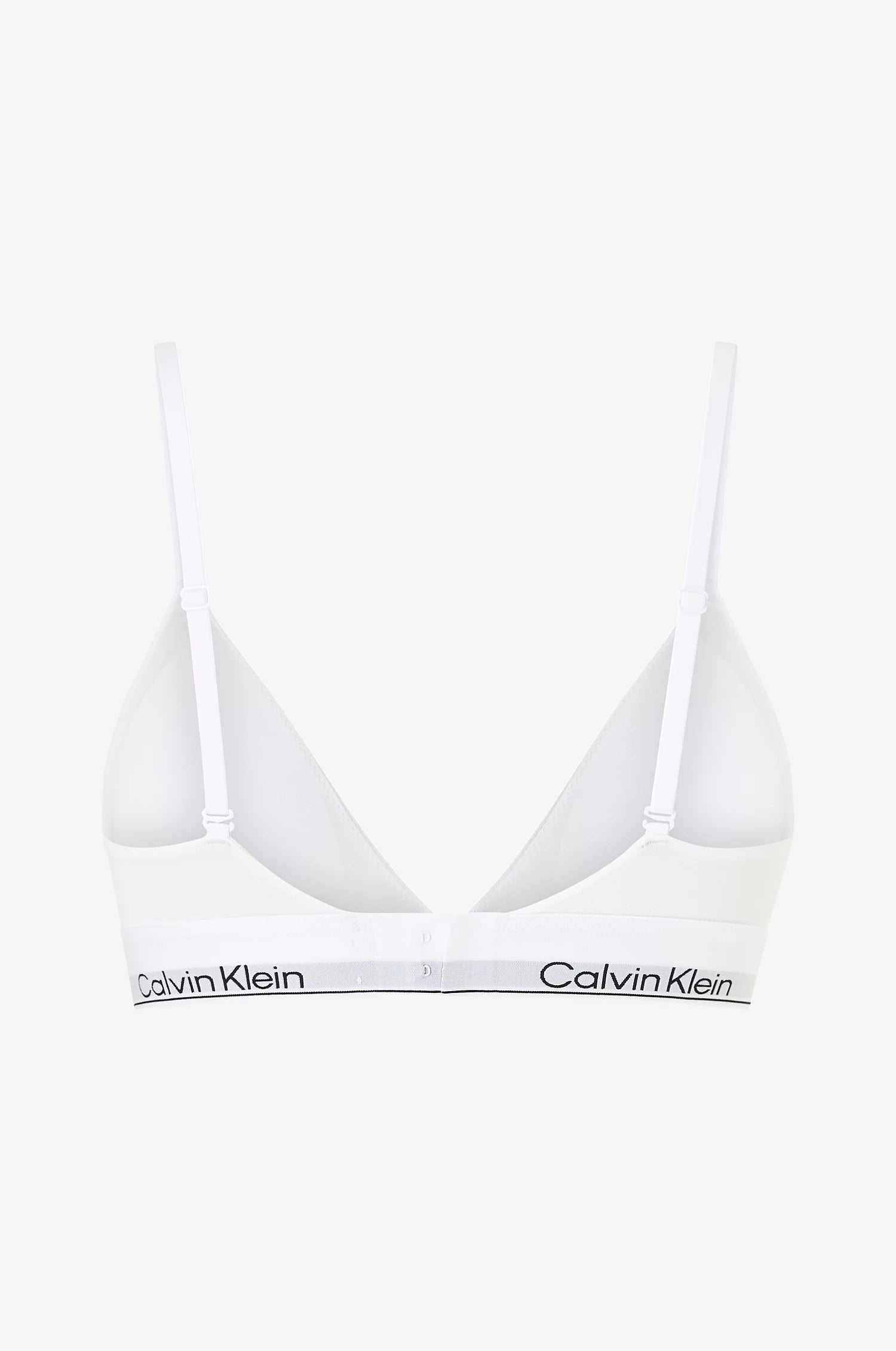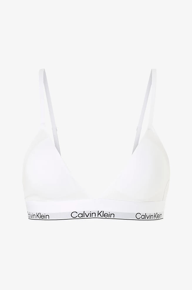 Deilig bralette med trekantform i myk bomullsblanding fra Calvin Klein. Modellen har sømløse kopper, justerbare stropper som kan endres til et kryss på ryggen og elastisk regulerbar hem med logokant i hvit og sort. Behagelig og pustende materiale. Her i klassisk hvit.