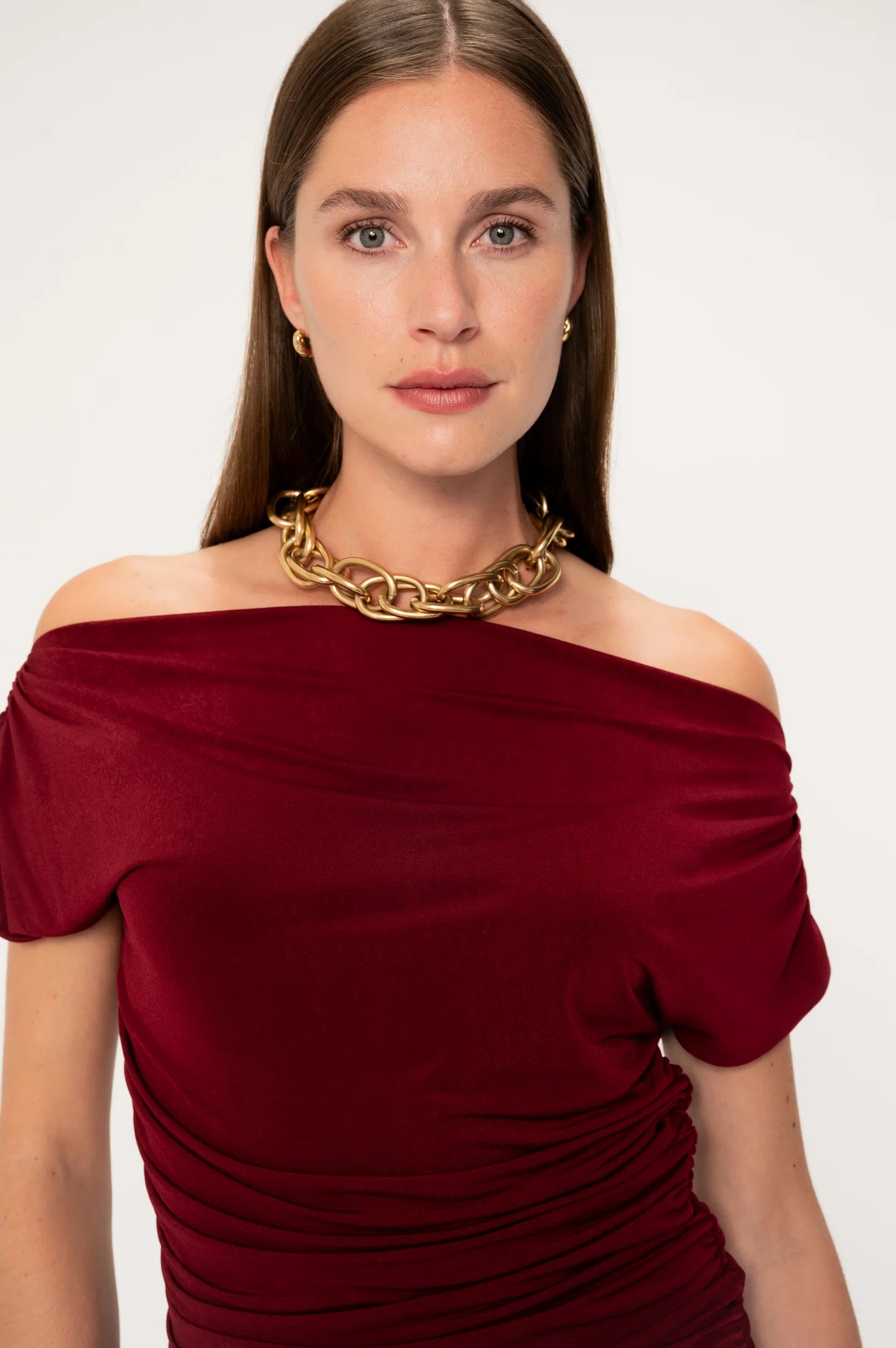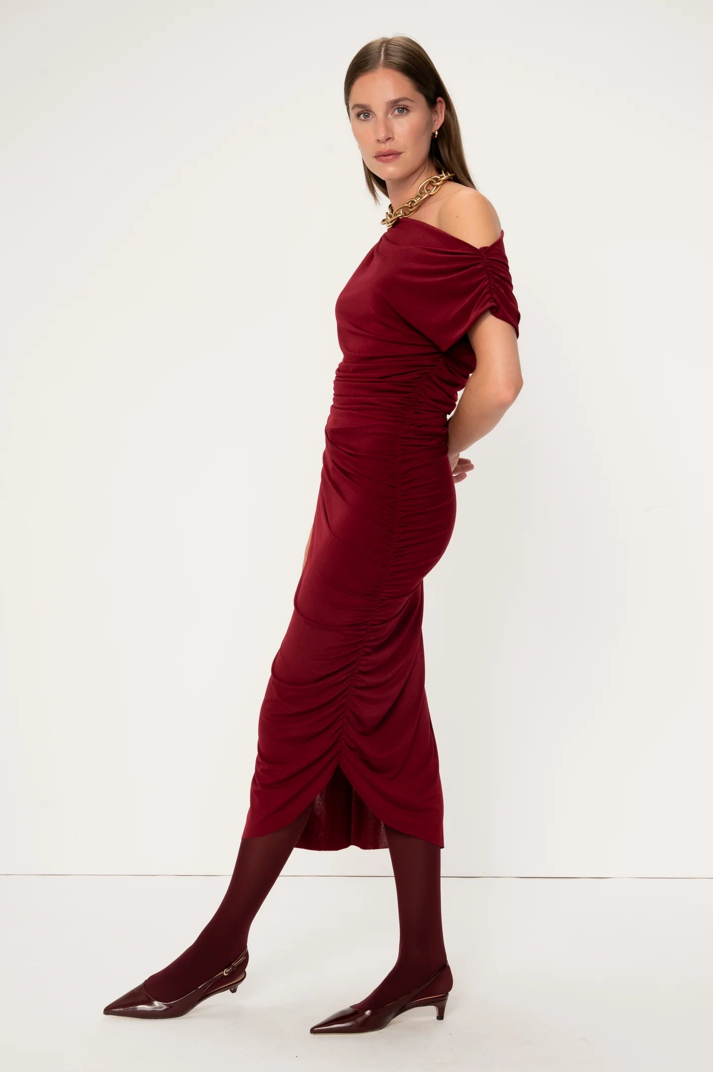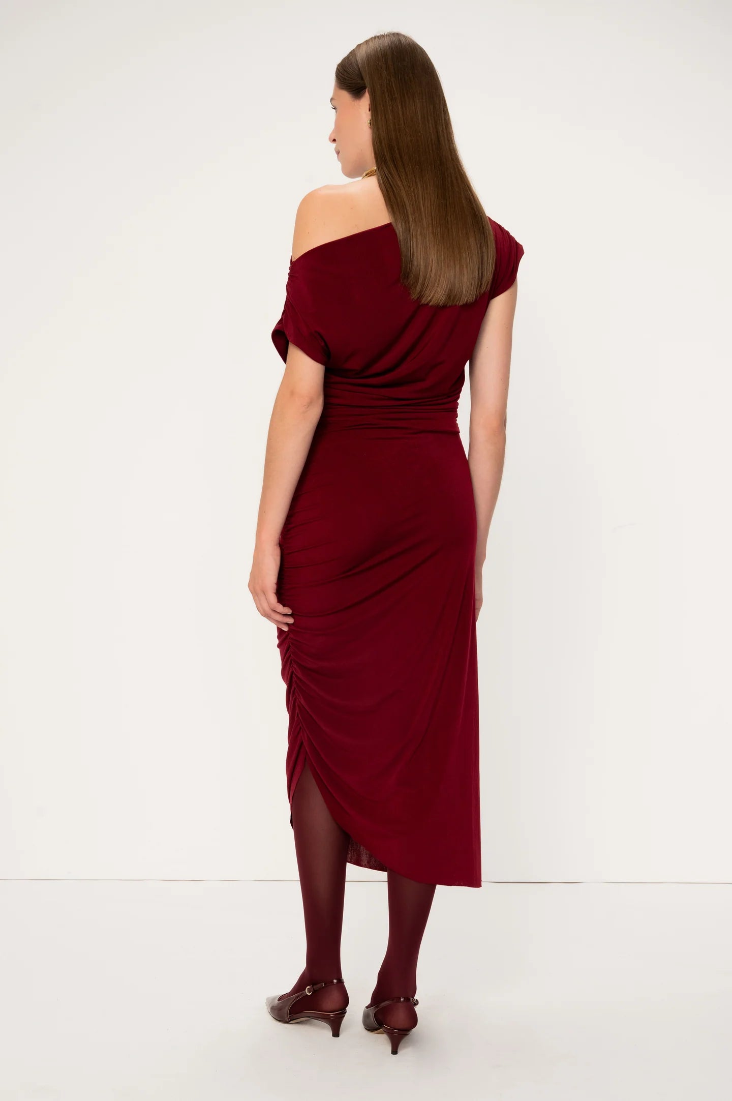 Asymmetrisk midikjole i nydelig rød fra Viveh. Modellen sitter tett rundt midjen og hoftene, med en drapert og avslappet passform øverst. Den brede båthalsutringningen gir flere stylingalternativer, slik at du kan bruke den enten på eller utenfor skulderen. De elegante draperinger skaper et elegant design som fremhever kurvene og konturene dine. Kjolen er laget av mikropolyester som er lett, har herlig stretch og er krøllebestandig. En tidløs kjole som vil glede garderoben din i mange år.