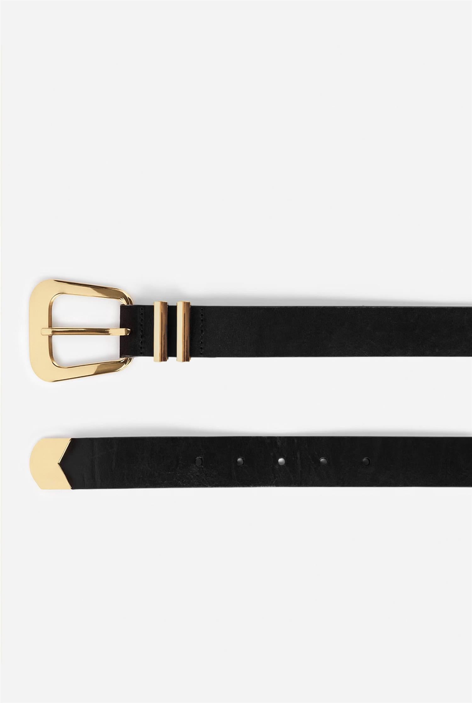 Stilig belte i sort skinn med elegant metallspenne i gull fra Camilla Pihl. Det er designet for tidløs eleganse, og gir løft til ethvert antrekk.