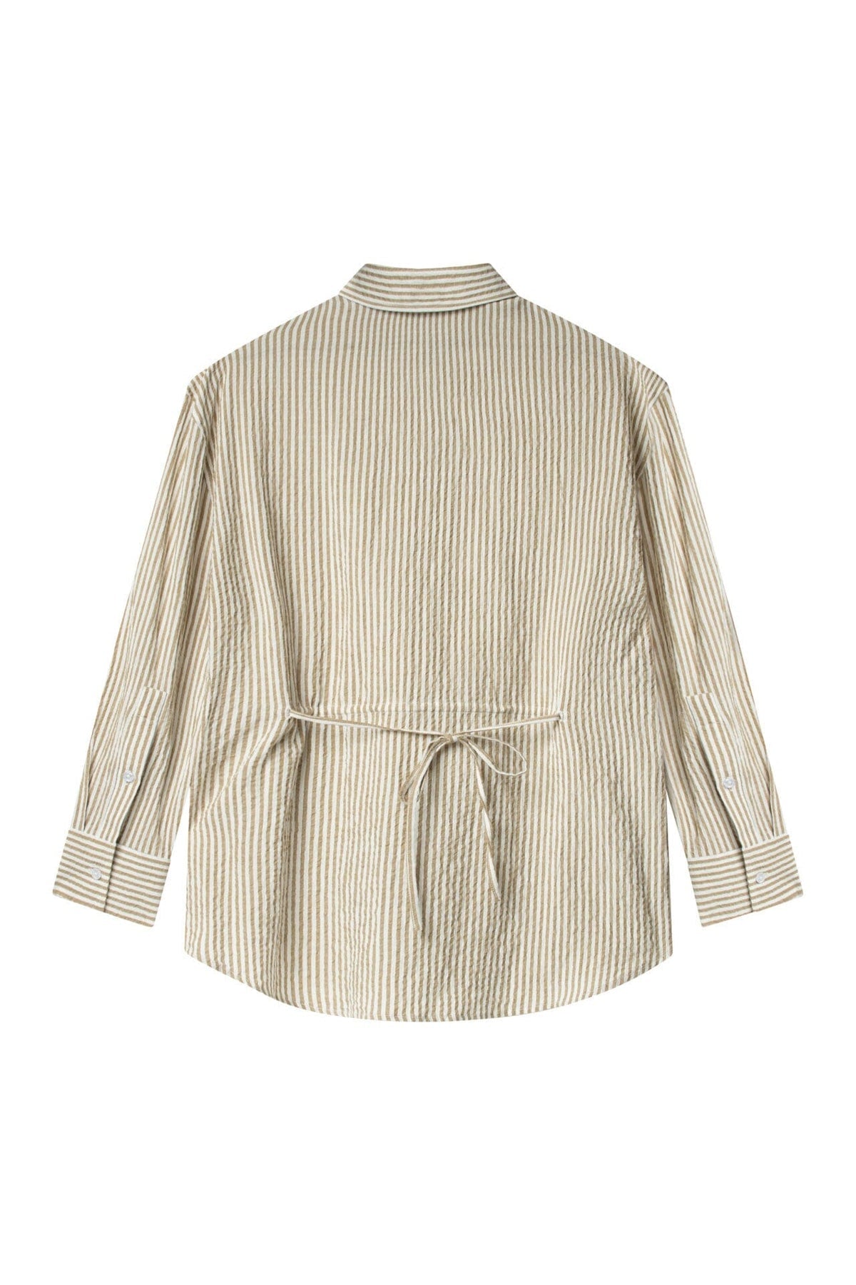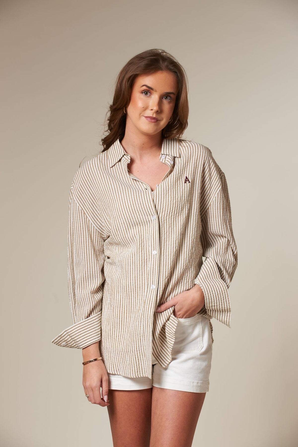 En luftig seersucker-skjorte i hvit og beige striper fra Arnie Says. Modellen er rett med klassisk skjortekrage og knepping i front. Den har lange ermer med droppet skulder og knapper i mansjett. Smalt belte er sydd inn i ryggen for en mer feminin passform, dette kan knytes foran eller bak etter ønske. Klassiske tynne striper og lett rynket tekstur gir et tidløst uttrykk,med en liten brodert «A» på brystet. Den er laget myk i i bomull som holder deg sval. En allsidig skjorte som passer til både shorts, jeans og penbukser.