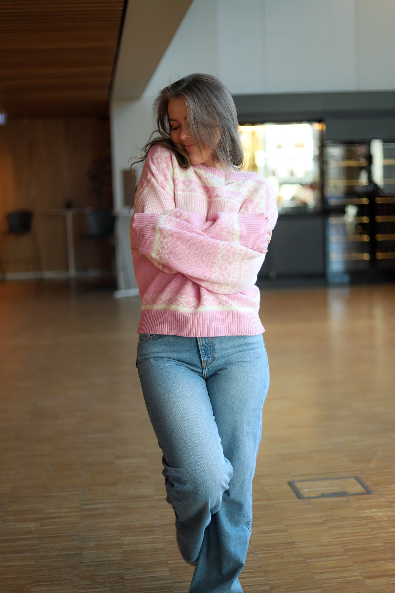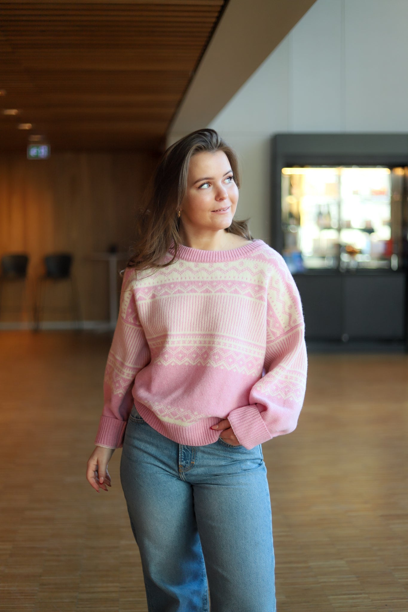 Nydelig mønstret strikk i lys rosa og off-white fra Arnie Says. Modellen er rett med pen hoftelengde, rund hals og lange ermer med droppet skulder. Ribbestrikk i hals, hem og mansjett. En søt strikk i varm og god ullmix.