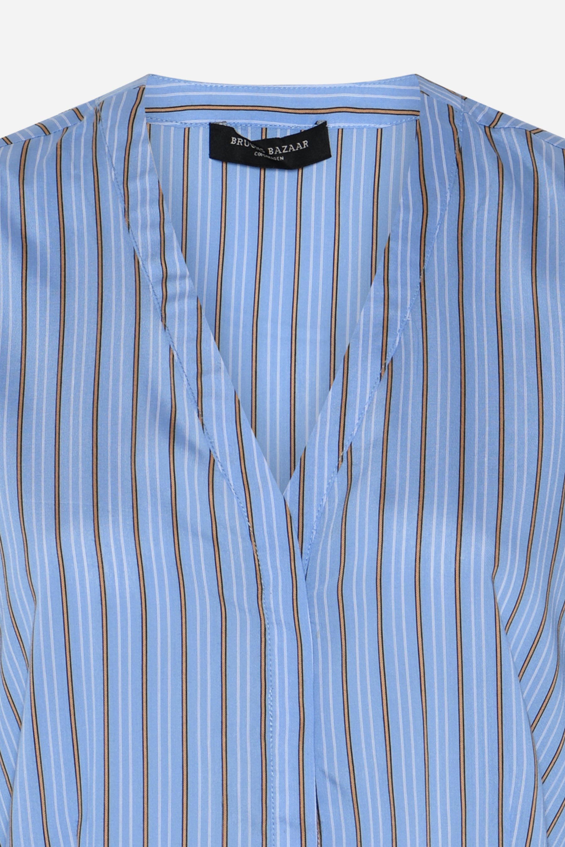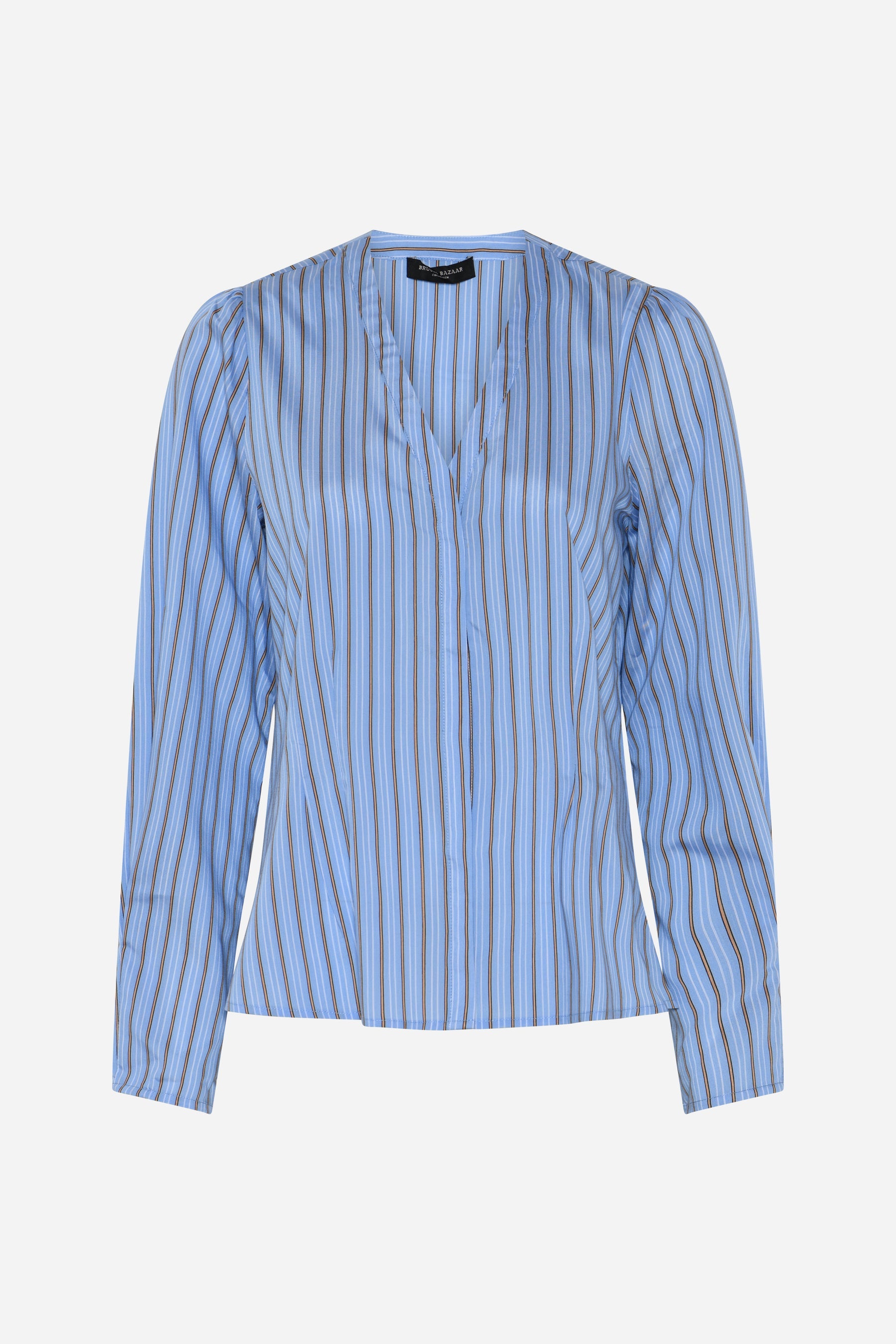 Elegant skjorte i himmelblå med striper i off-white og lys brun fra Bruuns Bazaar. Modellen er feminin med lett innsvingt midje, V-hals og pen hoftelengde. Den har lange ermer med lett puff i skuldre som skrår lett inn mot mansjett. Style den med bukser og floafers til hverdagsbruk, eller med skjørt og hæler til festlige anledninger.