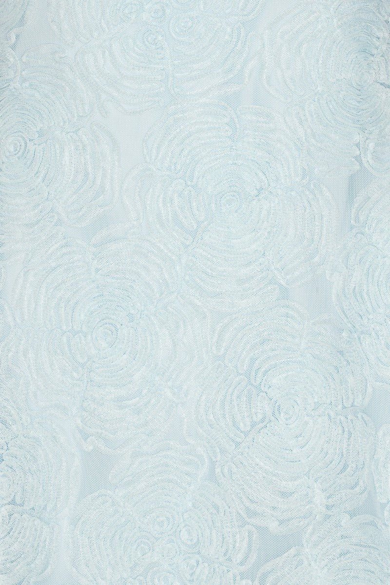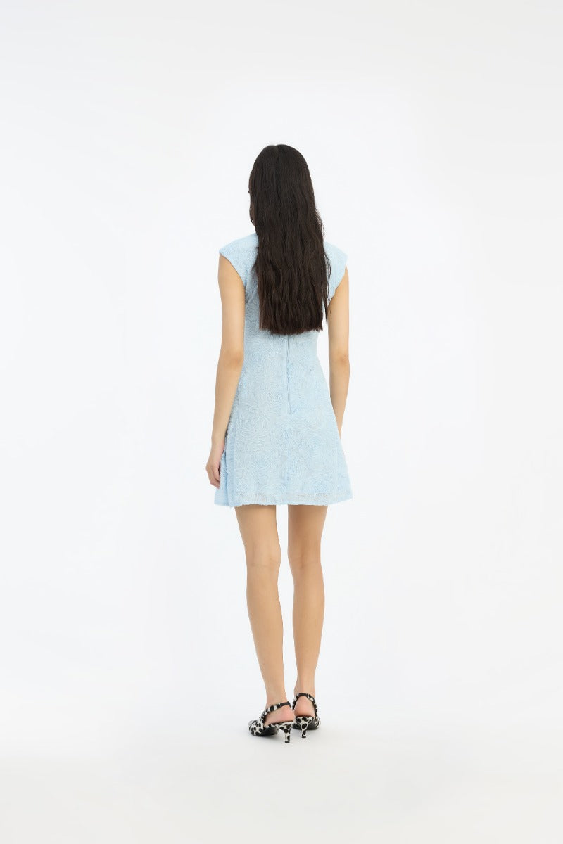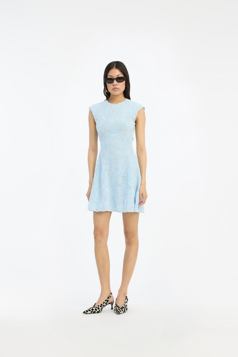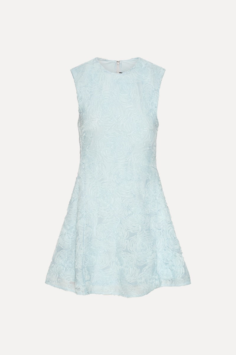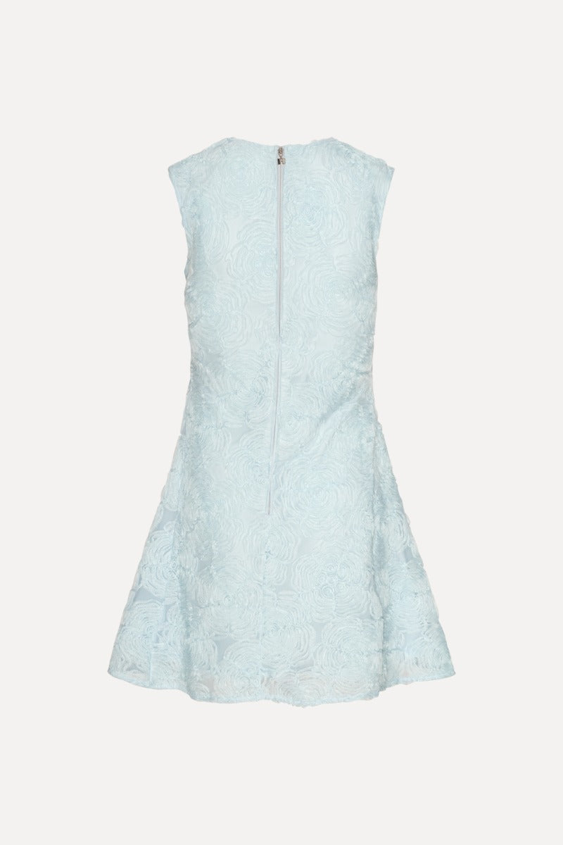 Nydelig minikjole i lys blå og 3D blomsterprint ton-i-ton fra Rotate. Ermløs kjole med elegant rund hals. Modellen sitter tett i overkropp, har markert midje og et voluminøst skjørt med lengde til midt på låret. Behagelig stretchy meshkvalitet som er tynt fóret. Lukking med skjult glidelås i ryggen. En nydleig kjole til sesongens garderobe.