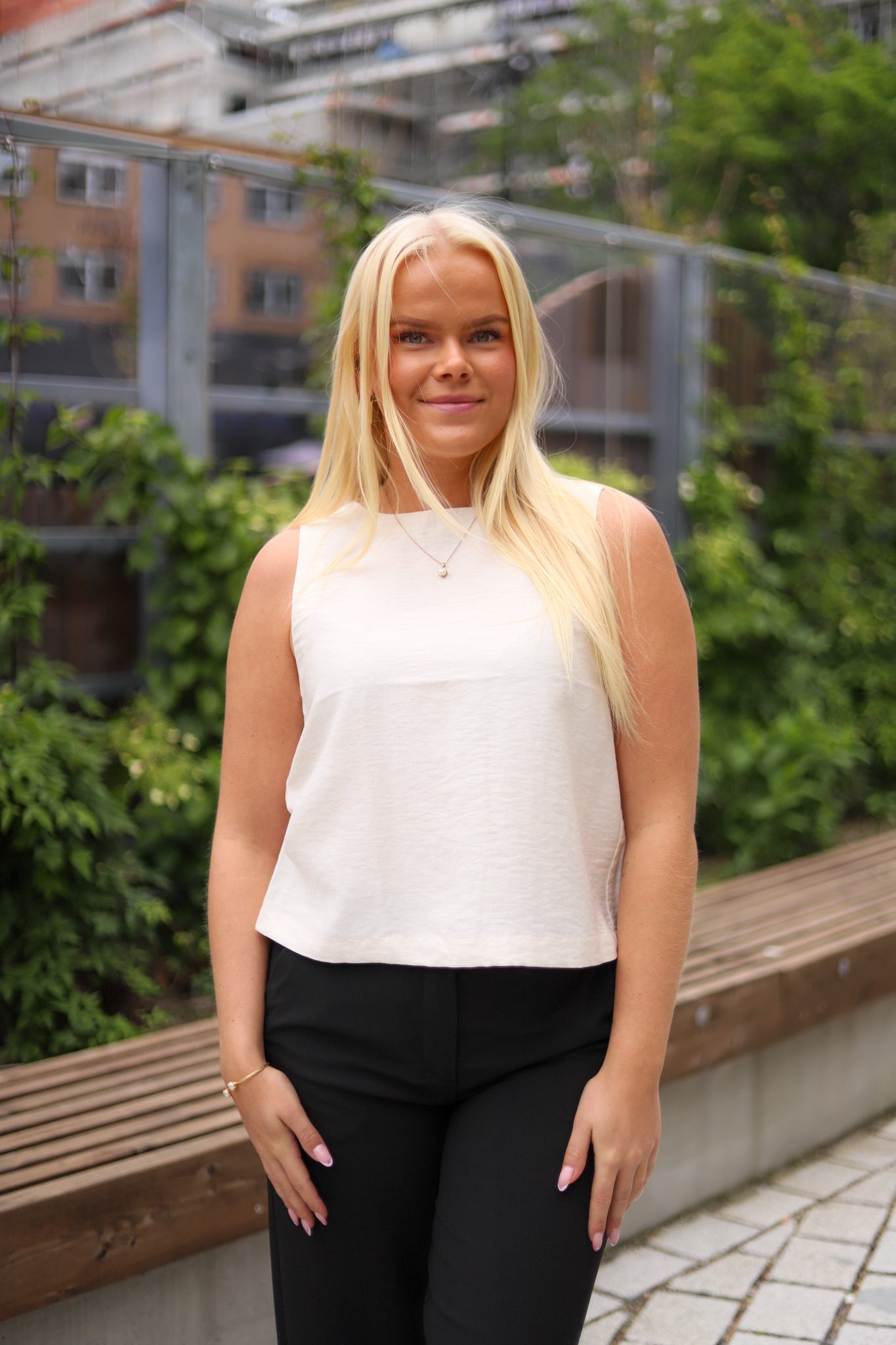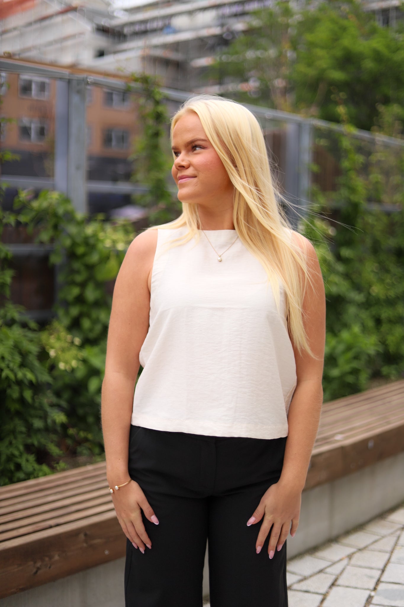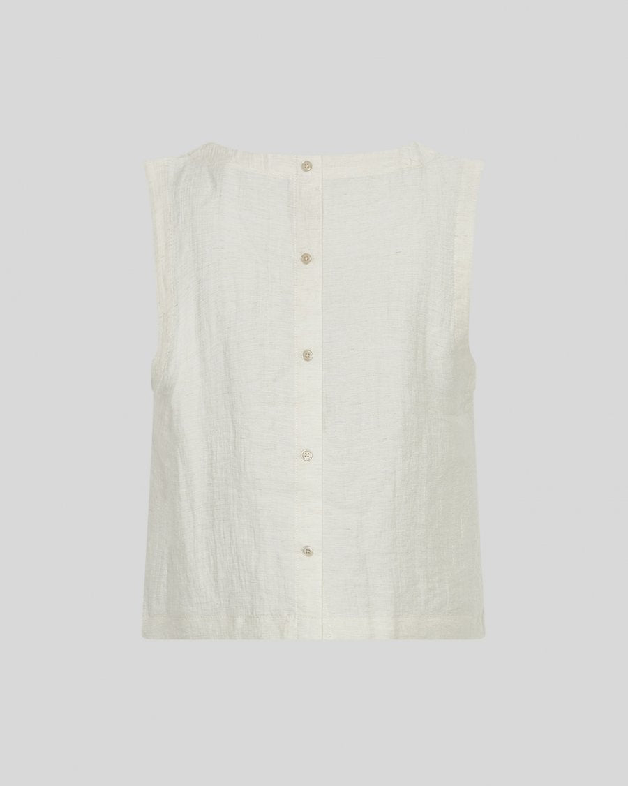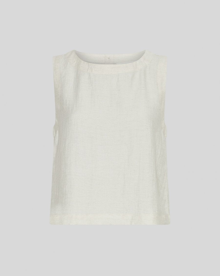 Tidløs topp i lys sandfarge fra MSCH Copenhagen. Modellen har tankstropper og rund hals og skrår lett ut med nett lengde. Delikat knappestolpe i ryggen. Lett materiale som er pustende og perfekt for varme dager. Anvendelig topp til alle anledninger.