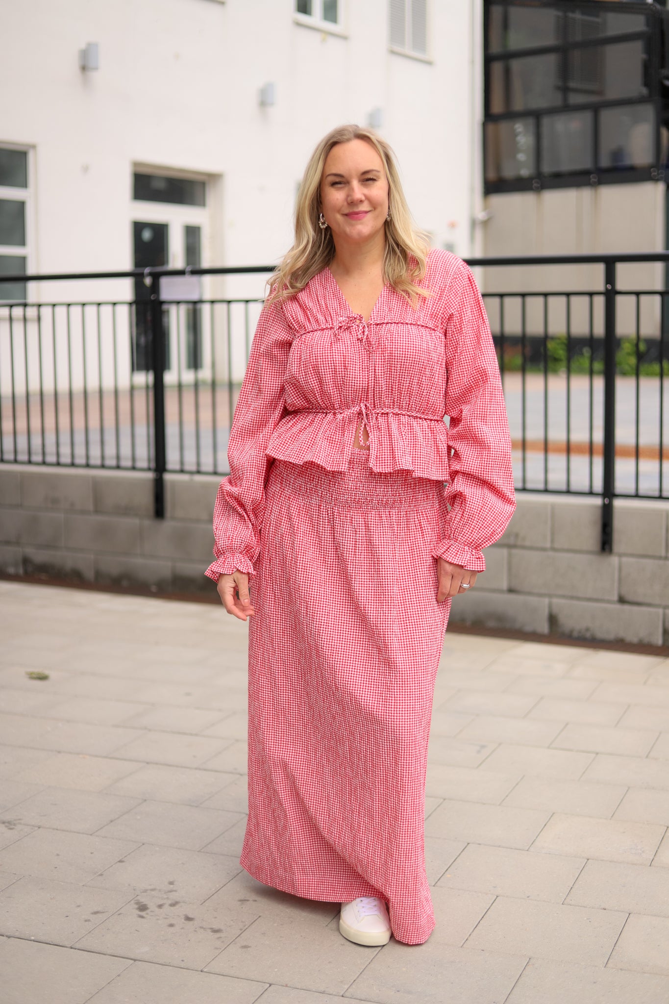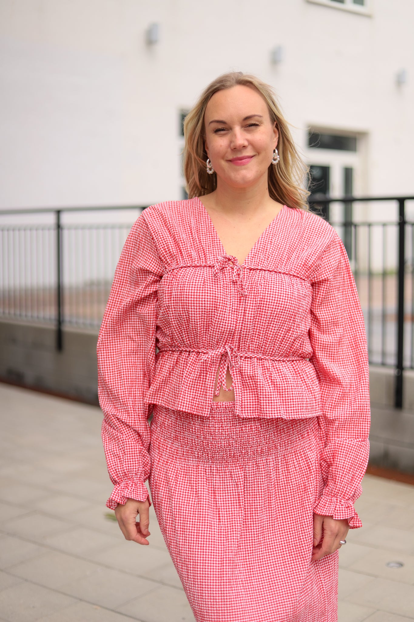 Søt smårutet bluse i rød og hvit fra Once Untold. Modellen er nett med v-hals, lett croppet lengde og knytebånd over brystet og i livet for en feminin fasong. Lange ermer med lett volum og knapper i smal mansjett. Deilig lett og luftig seersucker kvalitet. Den perfekte hverdagsblusen med lekre detaljer.