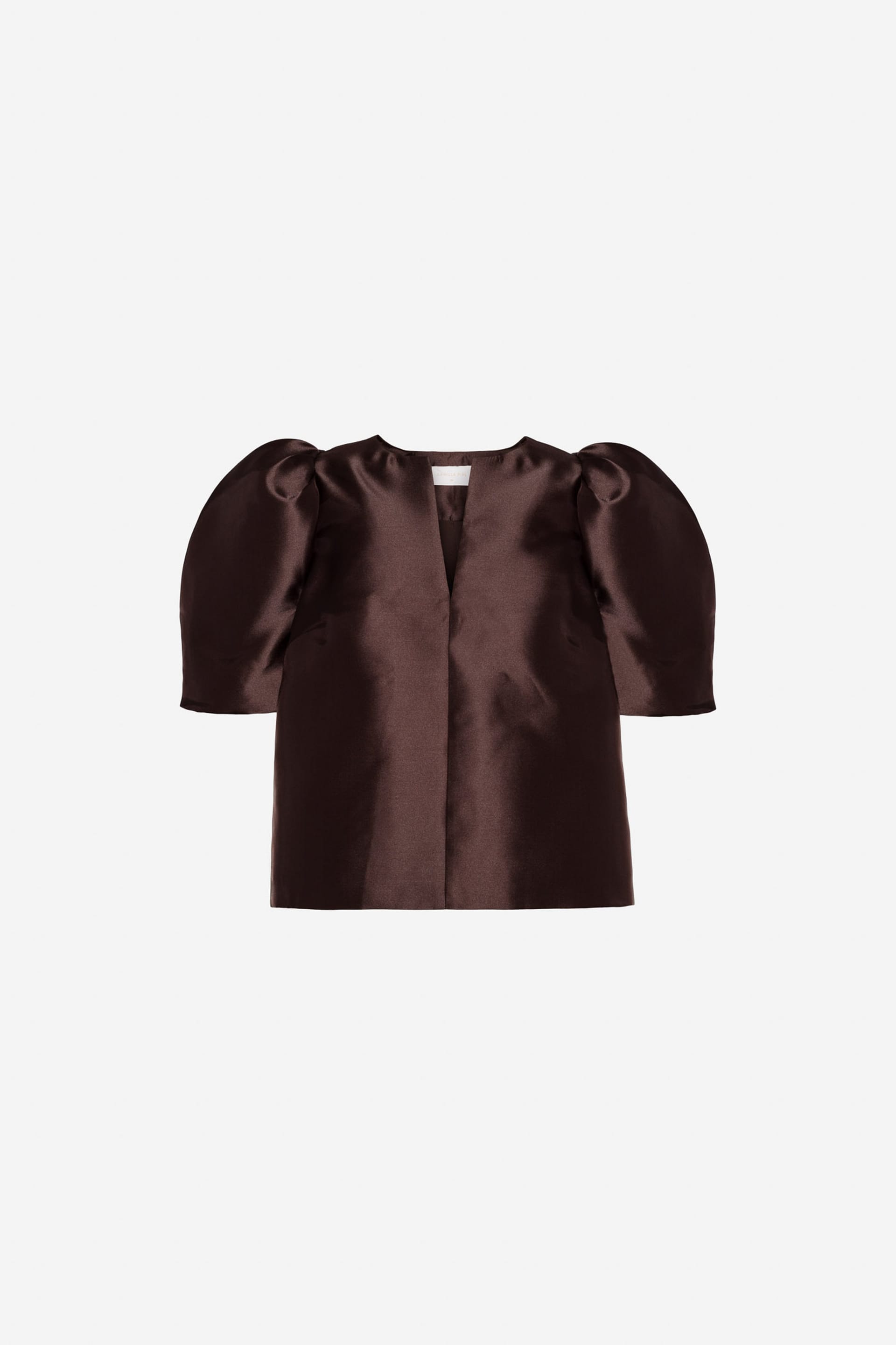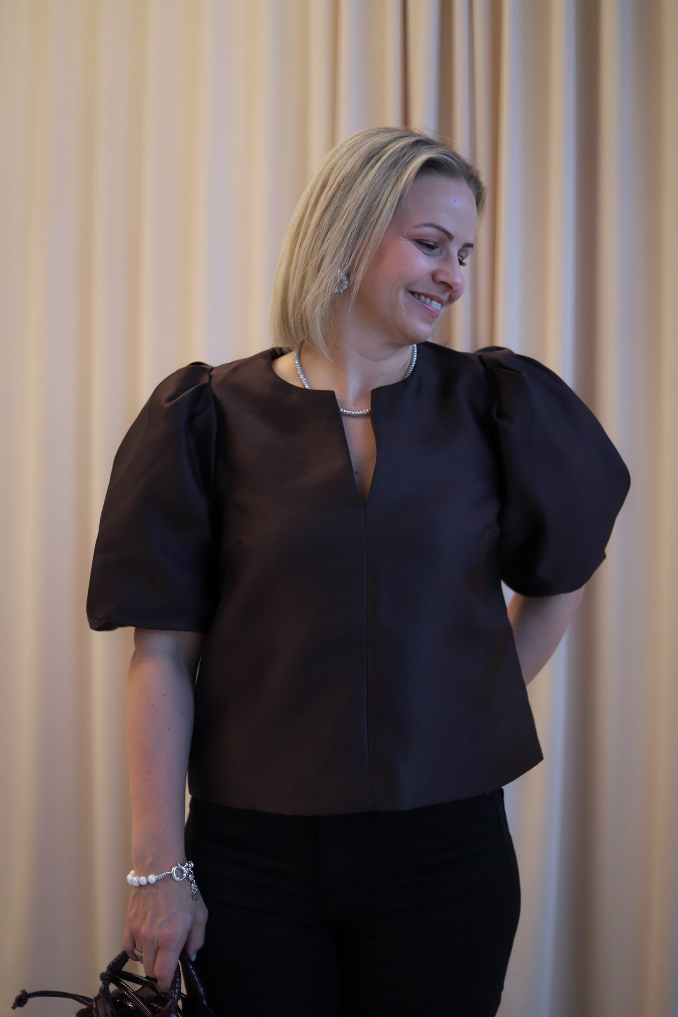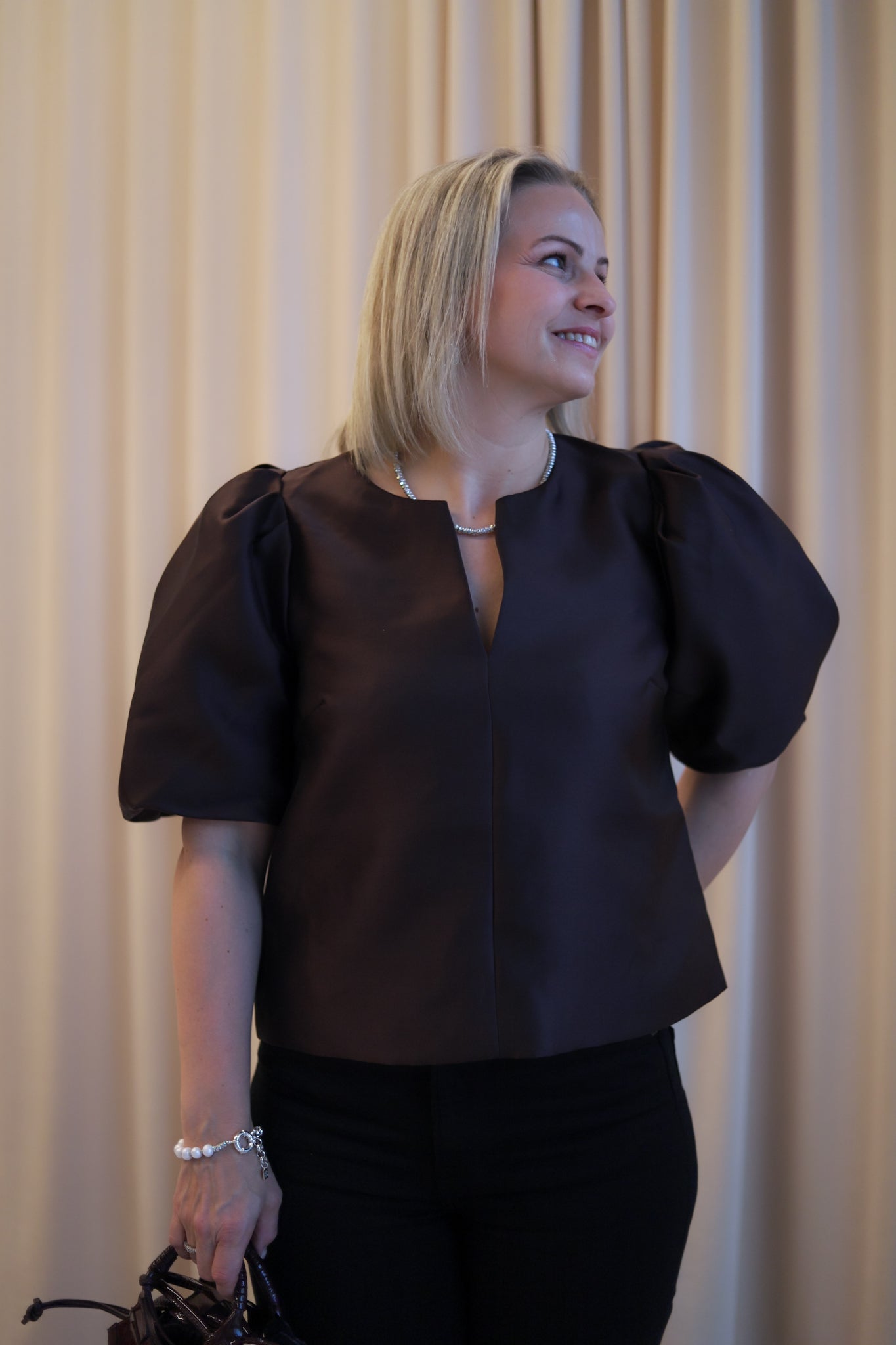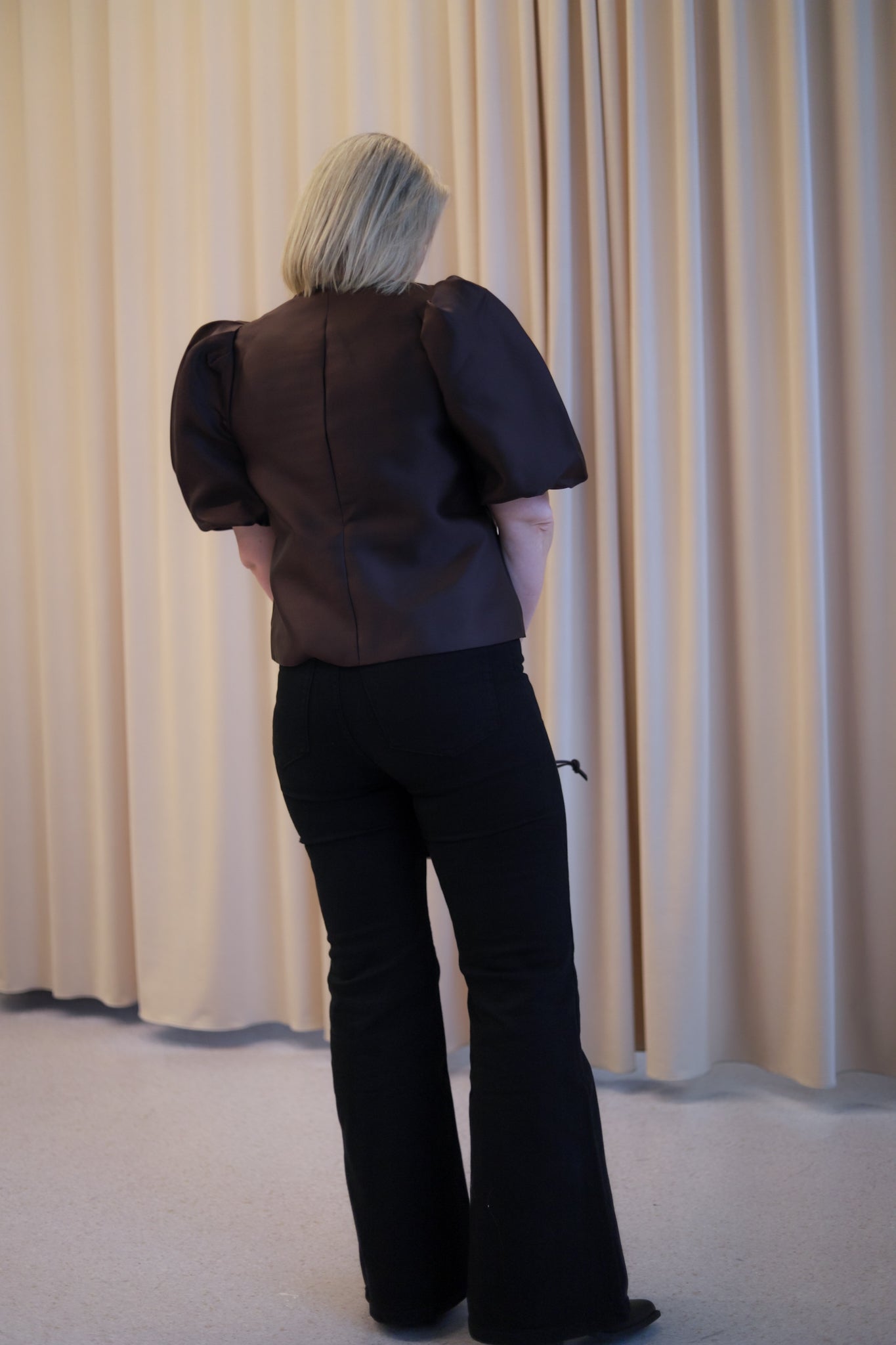 Vakker topp i mørk brun med lett shiny kvalitet fra Camilla Pihl. Modellen er rett med smal V-hals og voluminøse, korte ermer. En meget flatterende topp med pen lengde. Perfekt til hverdags og sesongens festligheter.