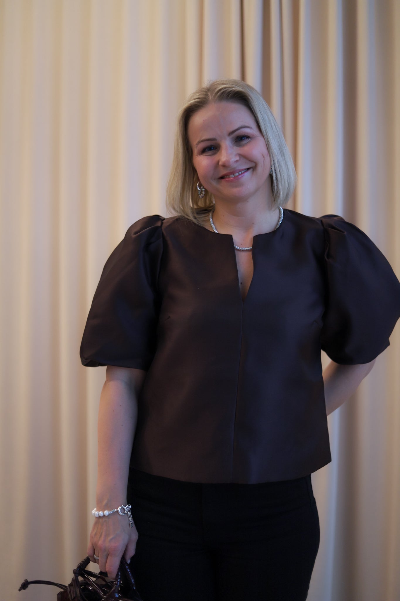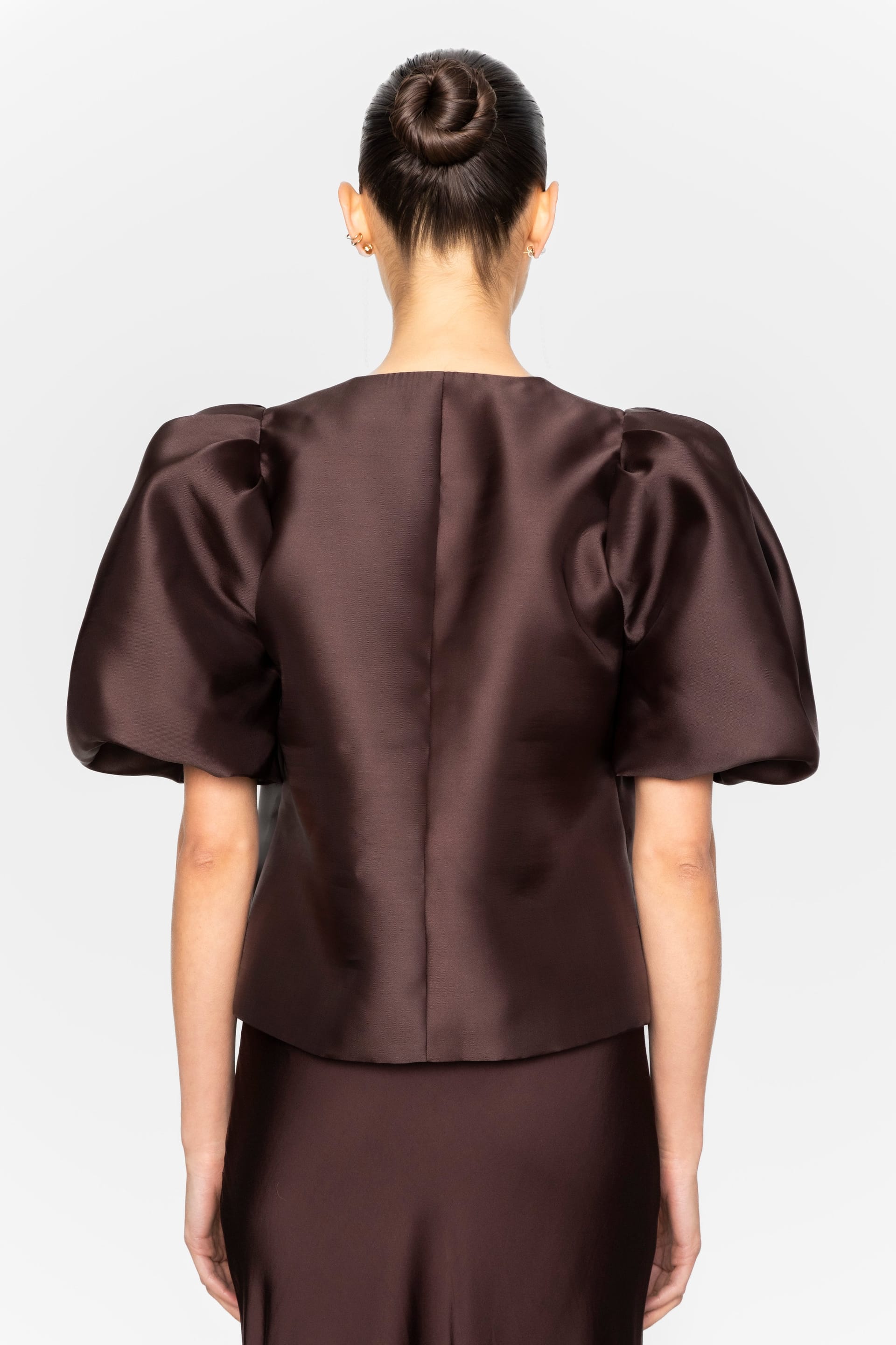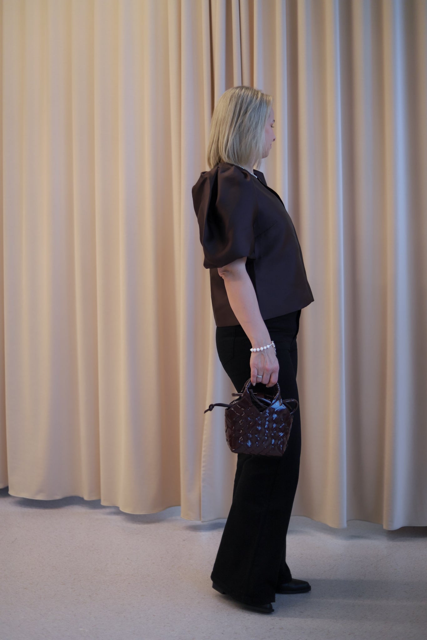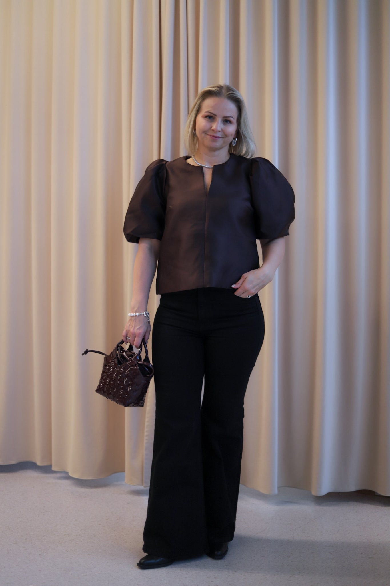 Vakker topp i mørk brun med lett shiny kvalitet fra Camilla Pihl. Modellen er rett med smal V-hals og voluminøse, korte ermer. En meget flatterende topp med pen lengde. Perfekt til hverdags og sesongens festligheter.