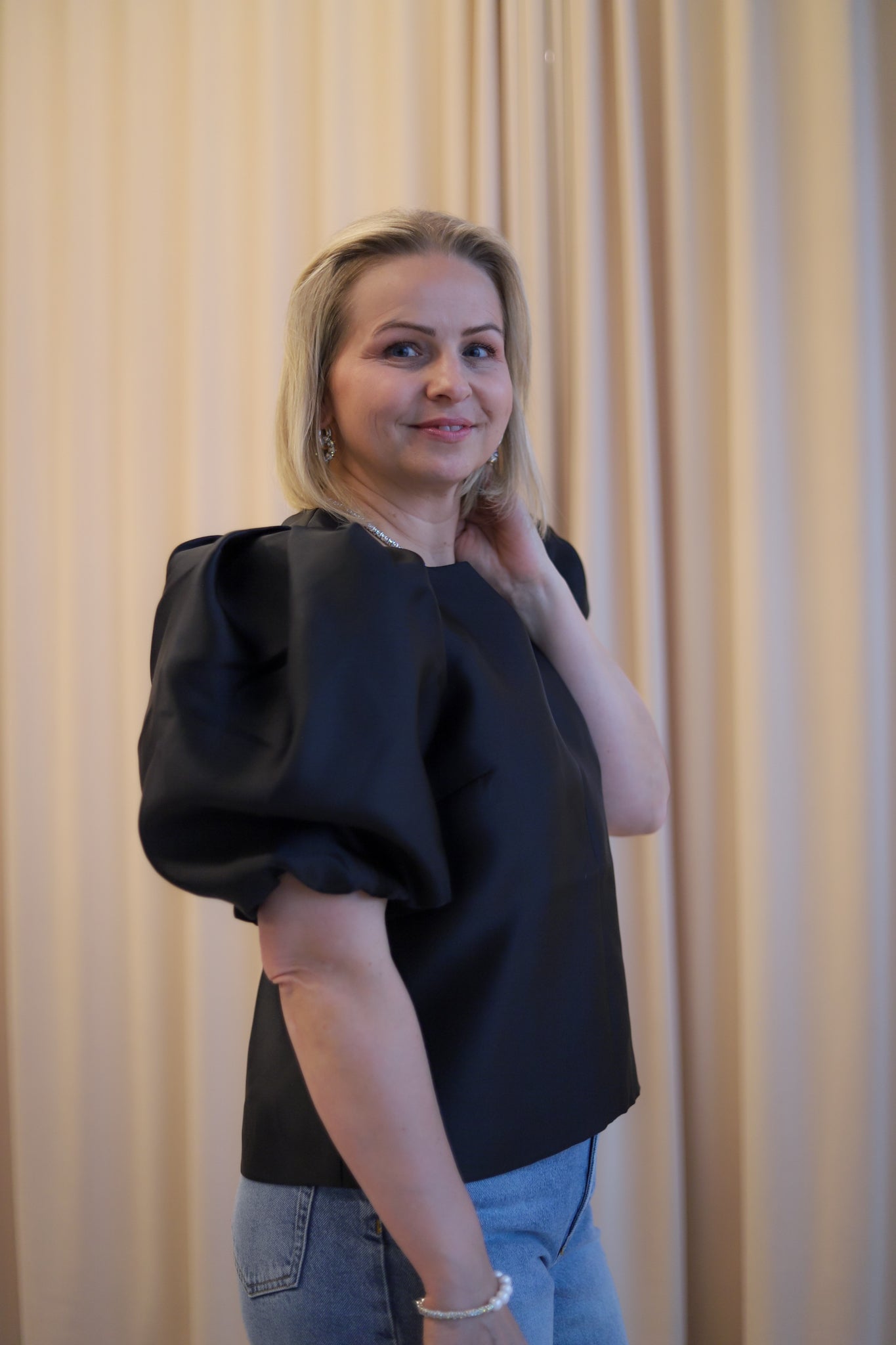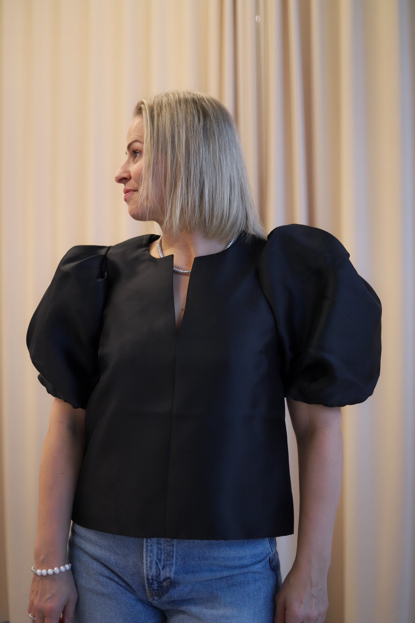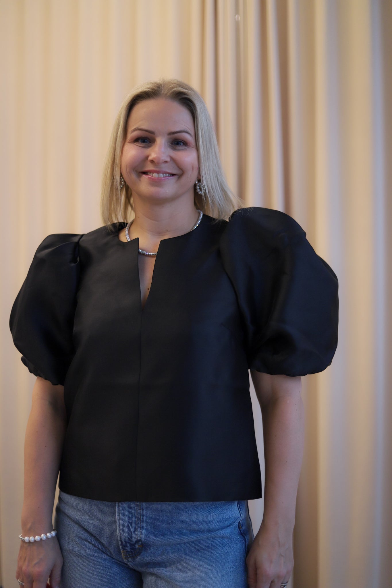 Vakker topp i klassisk sort med lett shiny kvalitet fra Camilla Pihl. Modellen er rett med smal V-hals og voluminøse, korte ermer. En meget flatterende topp med pen lengde. Perfekt til hverdags og sesongens festligheter.
