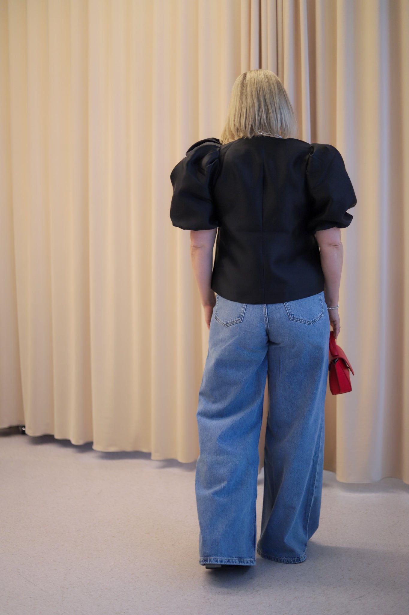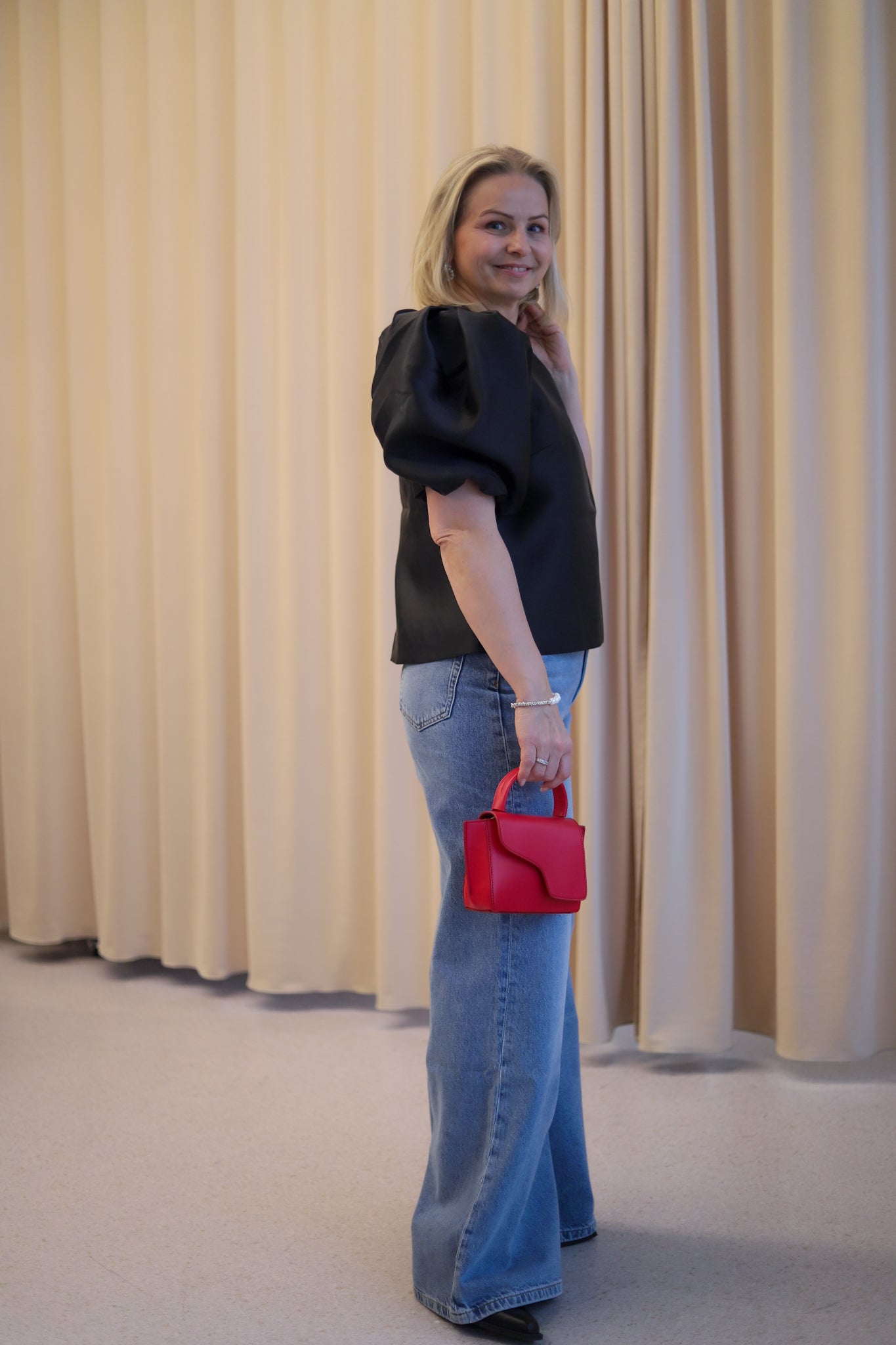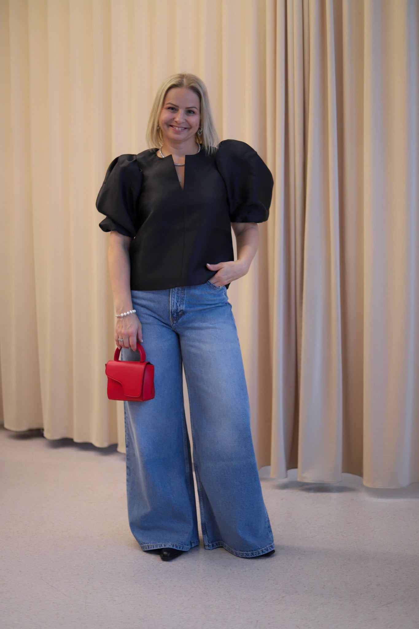 Vakker topp i klassisk sort med lett shiny kvalitet fra Camilla Pihl. Modellen er rett med smal V-hals og voluminøse, korte ermer. En meget flatterende topp med pen lengde. Perfekt til hverdags og sesongens festligheter.