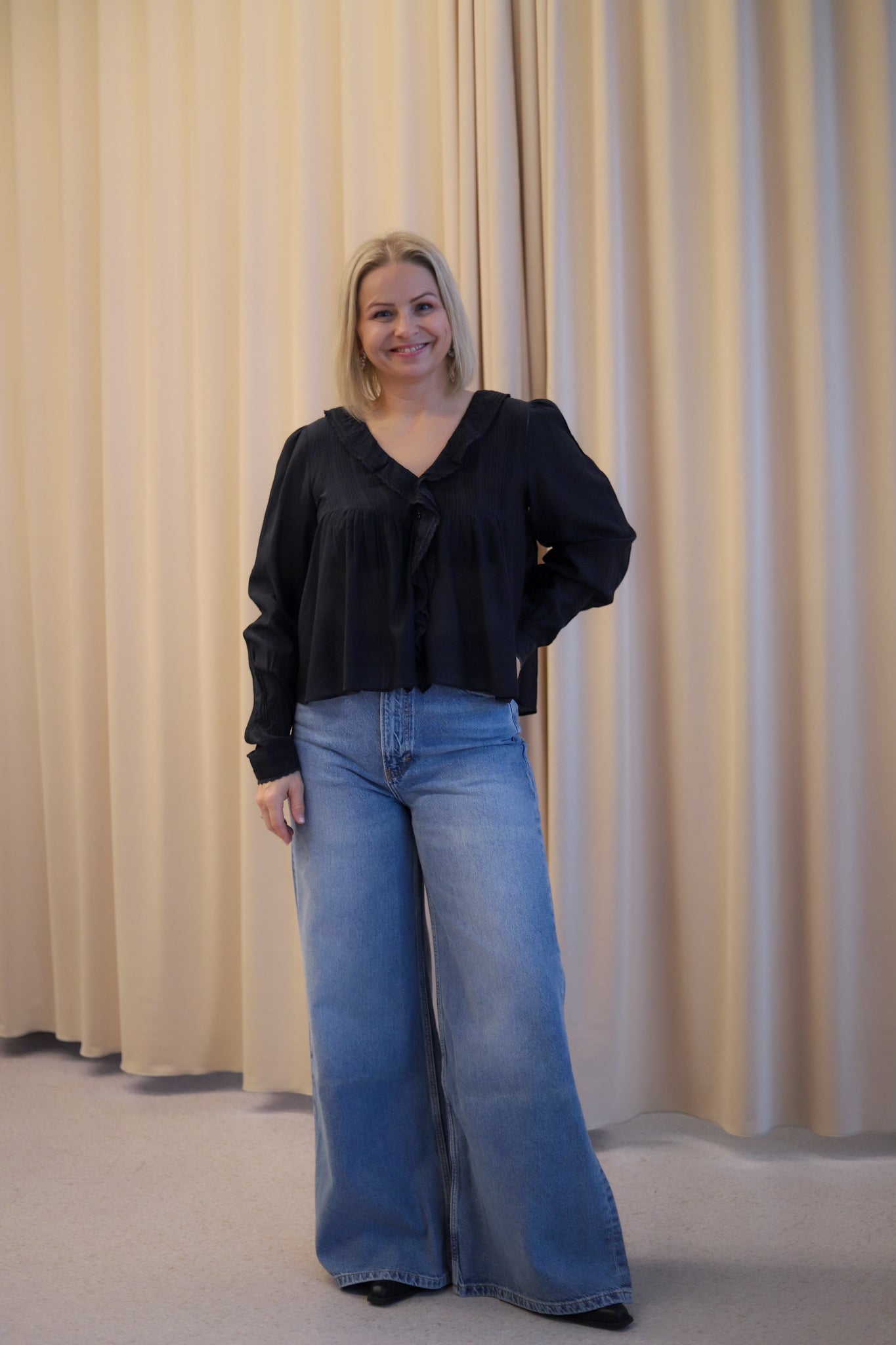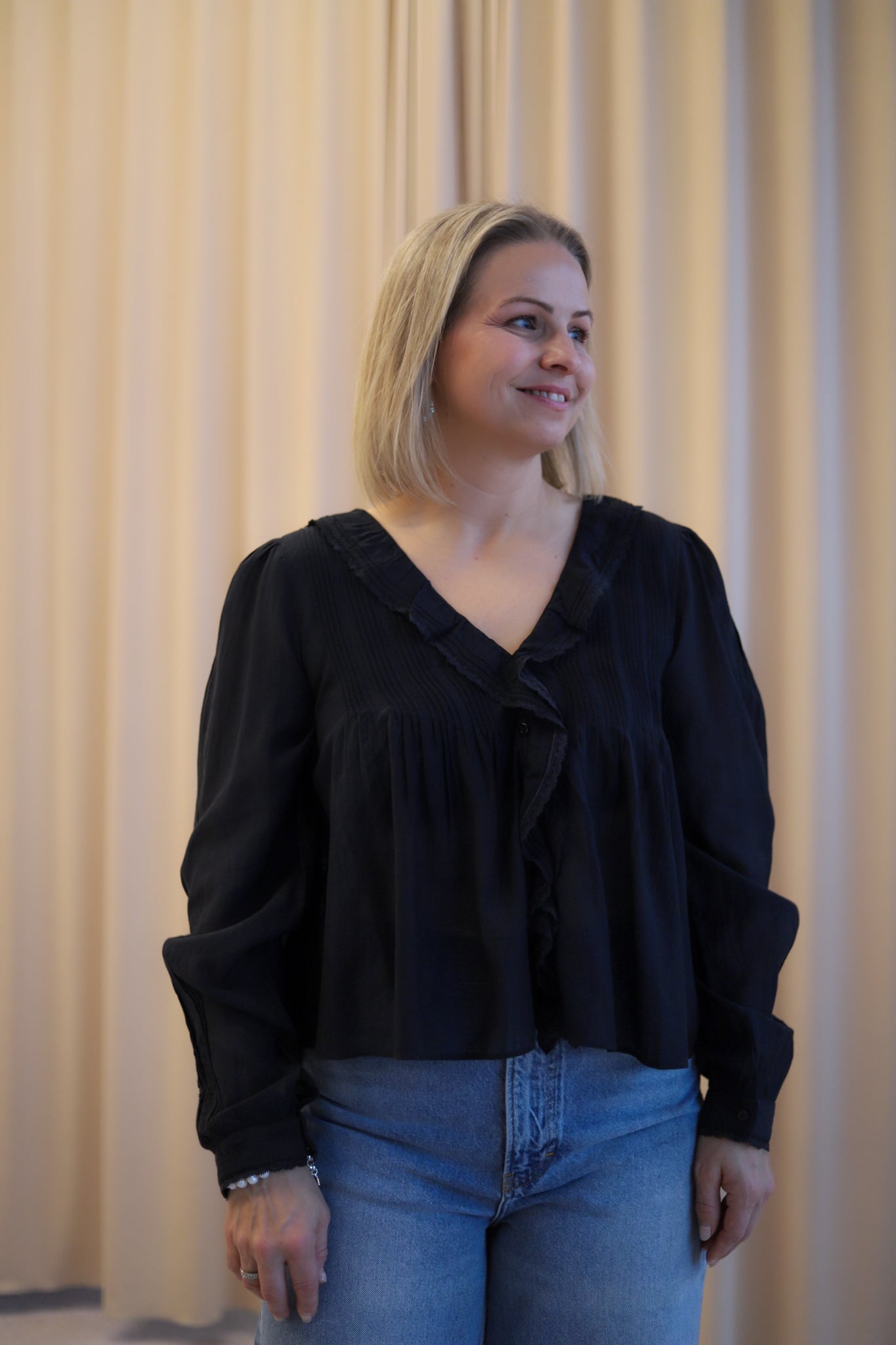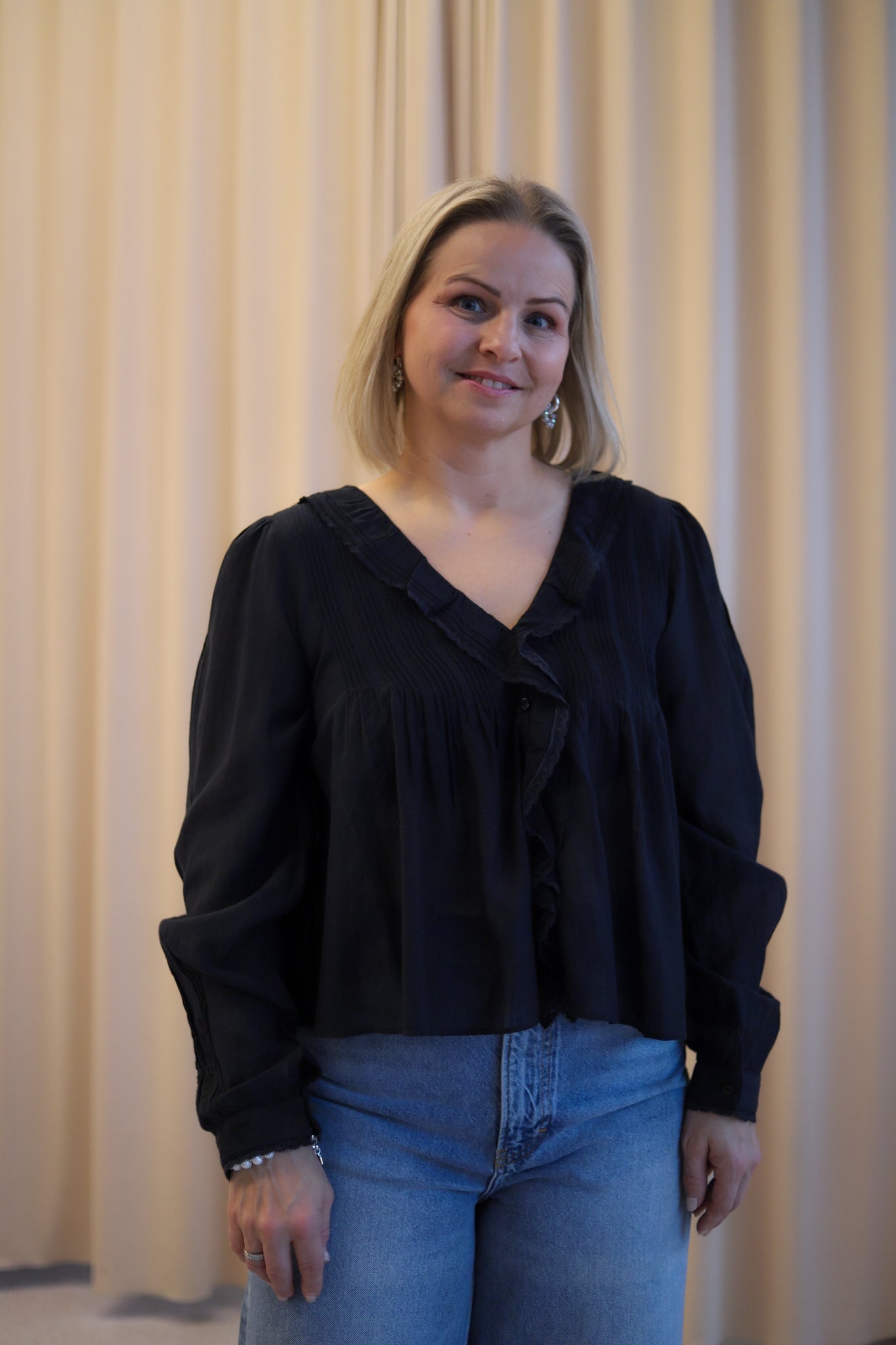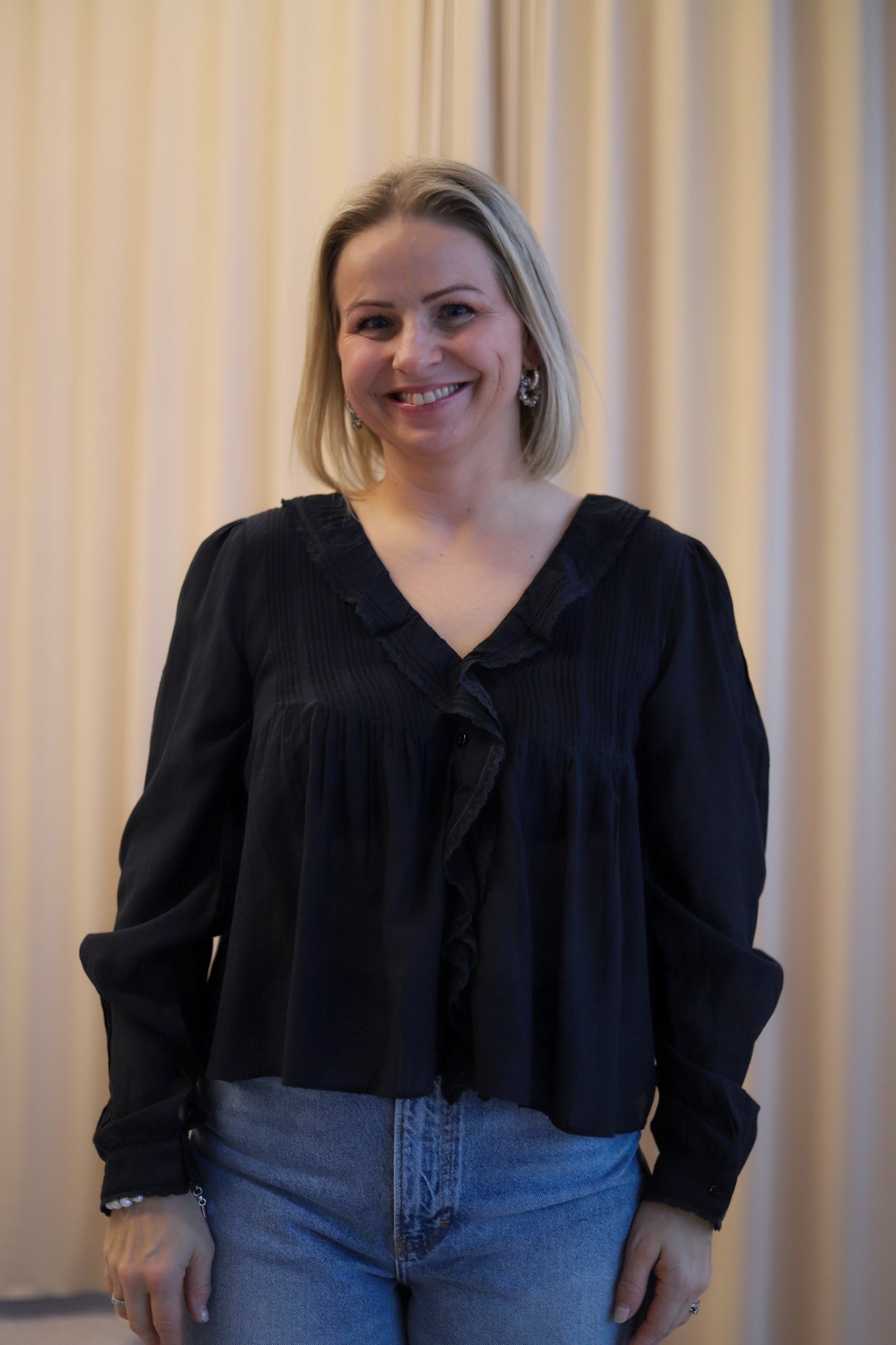 Lekker bluse i klassisk sort fra Pia Tjelta. Modellen skrår litt ut med nett lengde. V-hals med rysjer og lange ermer. Blusen har folder som gir den vidde, blonder og små broderidetaljer på ermene og rysjer. Laget av en behagelig bomullsviskose. Lett hverdagstopp!