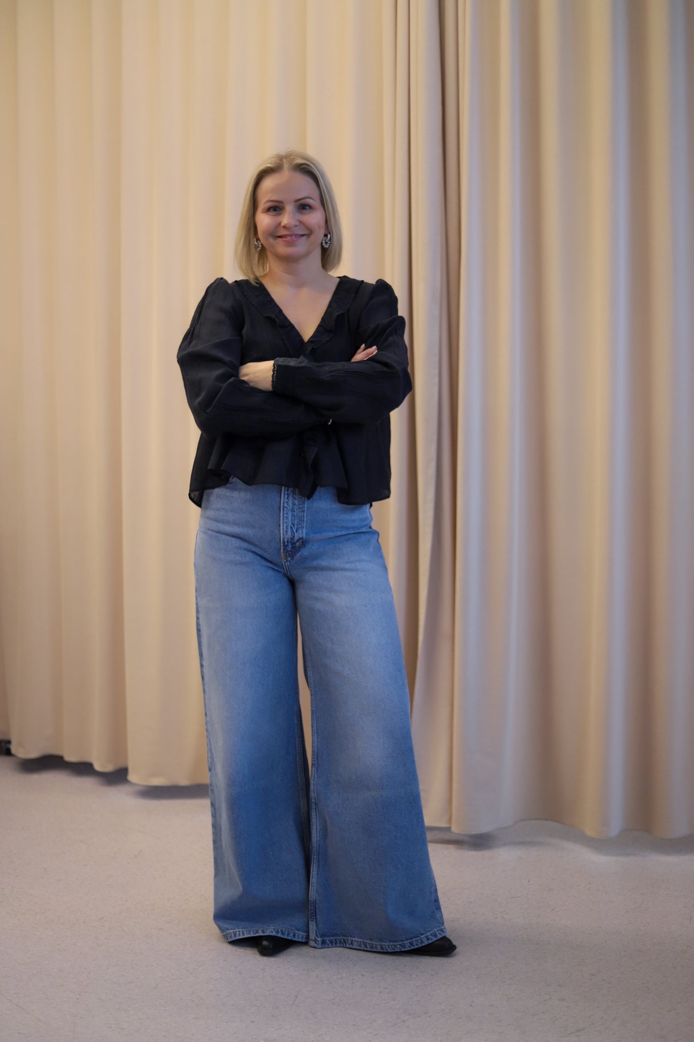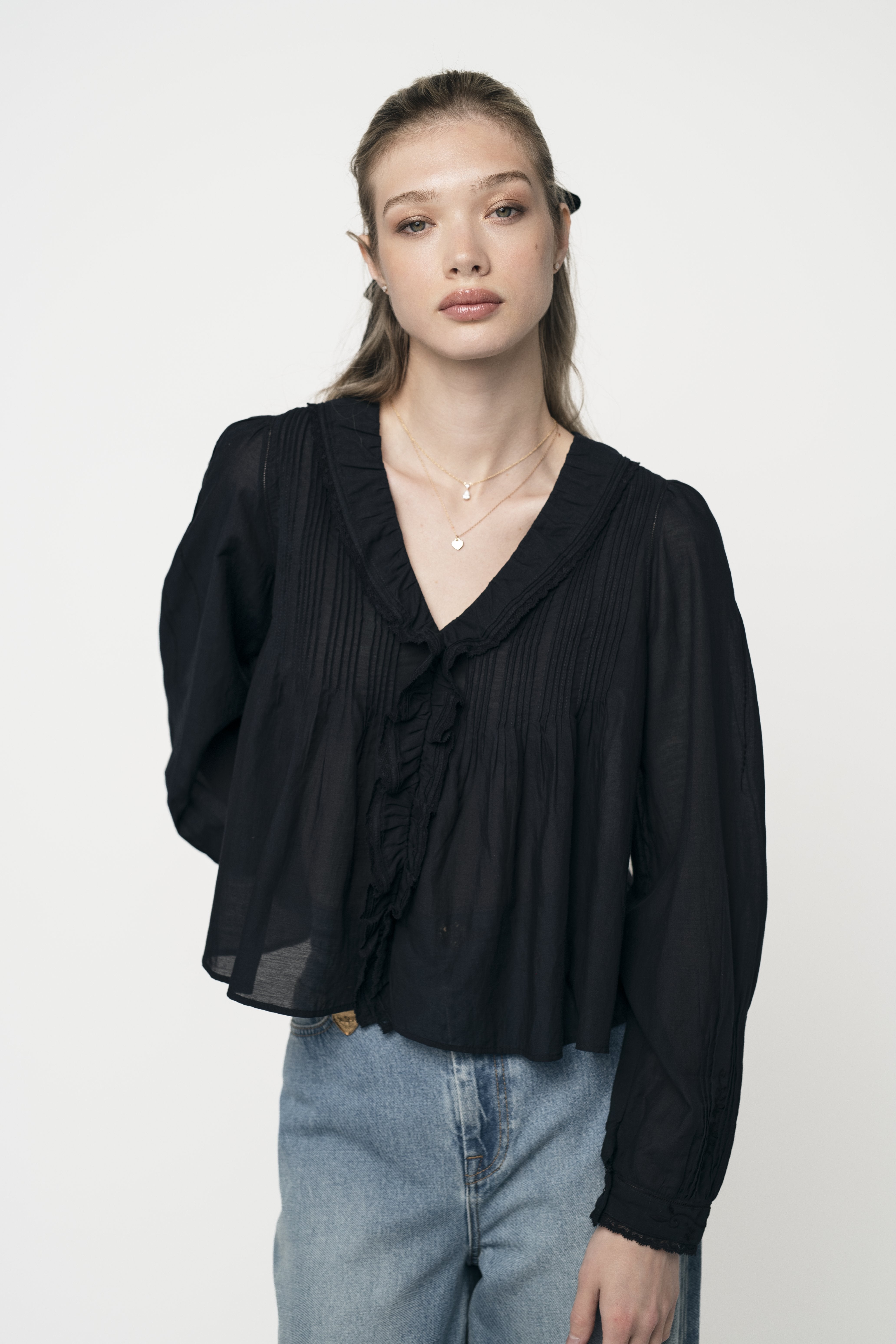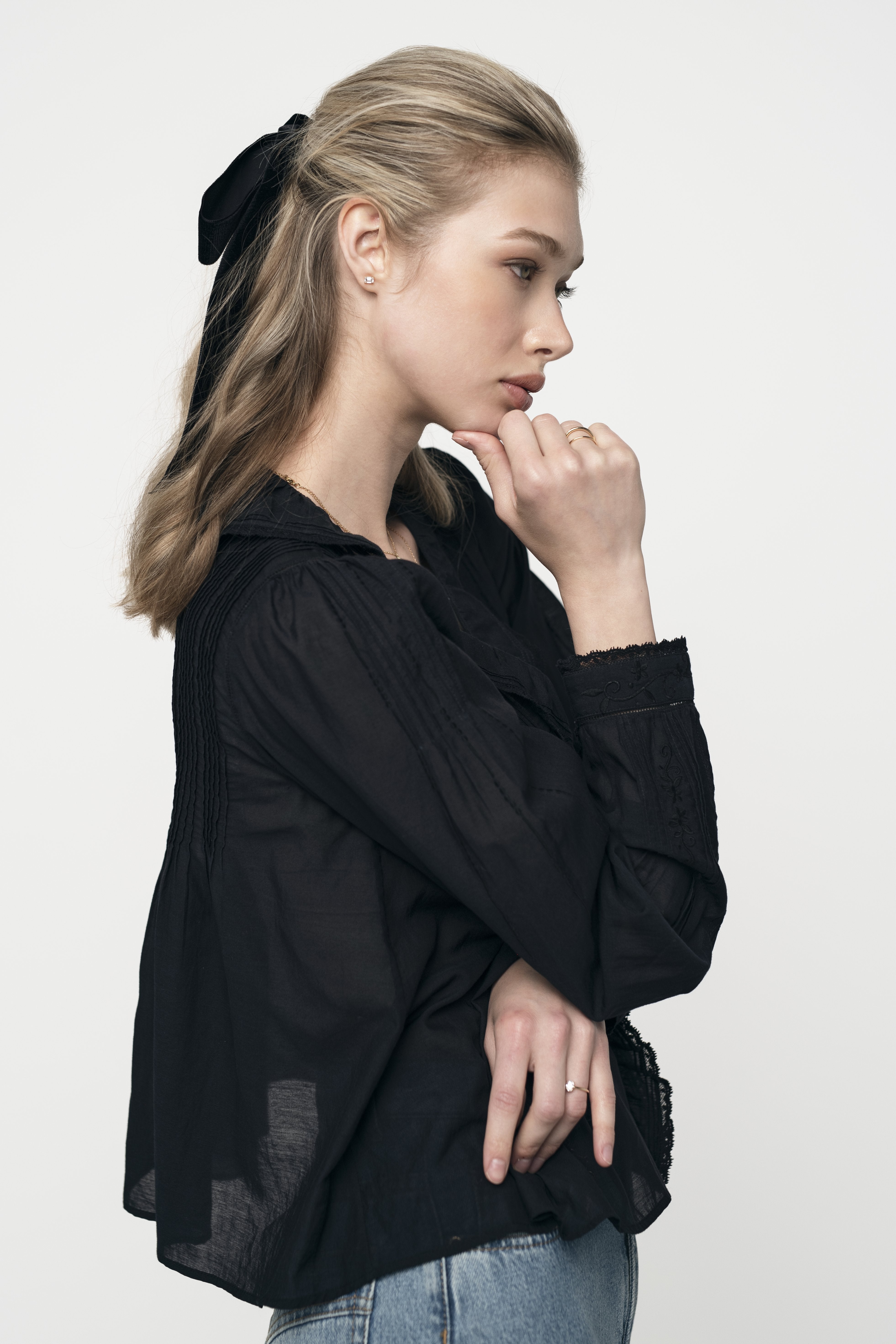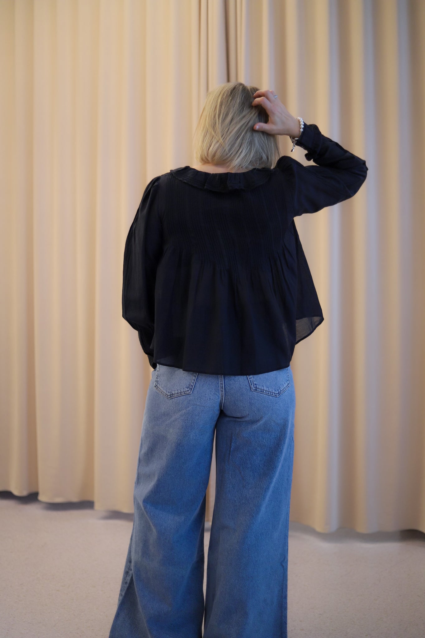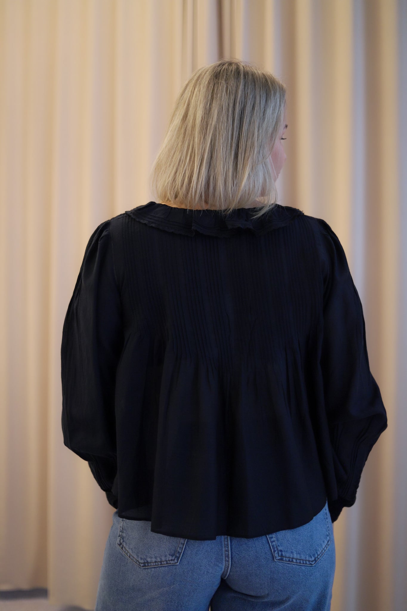 Lekker bluse i klassisk sort fra Pia Tjelta. Modellen skrår litt ut med nett lengde. V-hals med rysjer og lange ermer. Blusen har folder som gir den vidde, blonder og små broderidetaljer på ermene og rysjer. Laget av en behagelig bomullsviskose. Lett hverdagstopp!