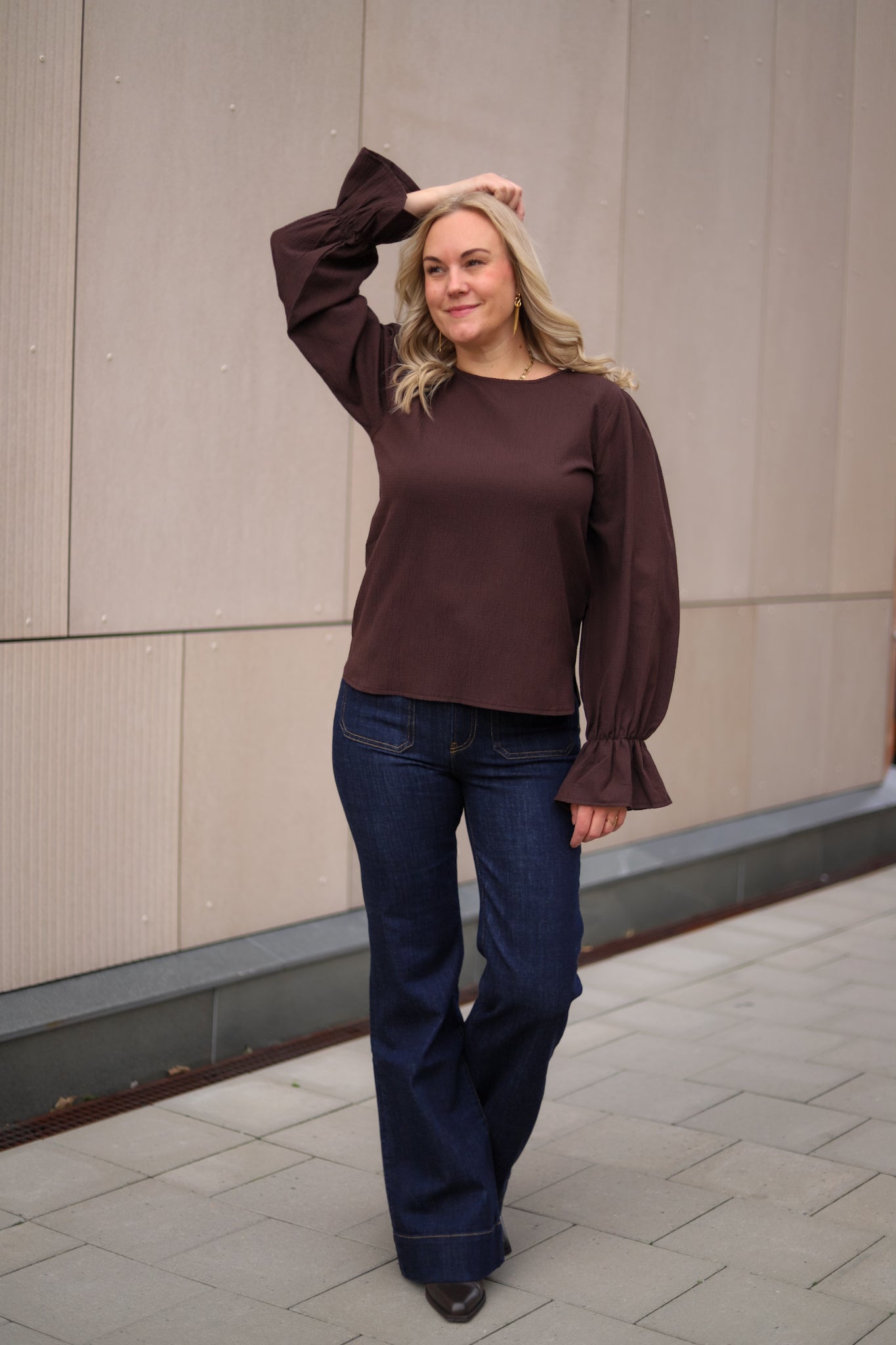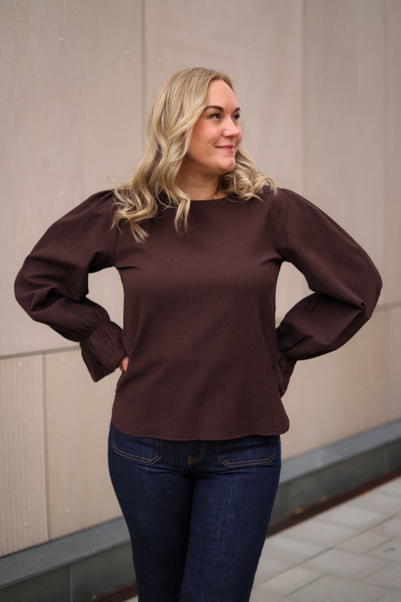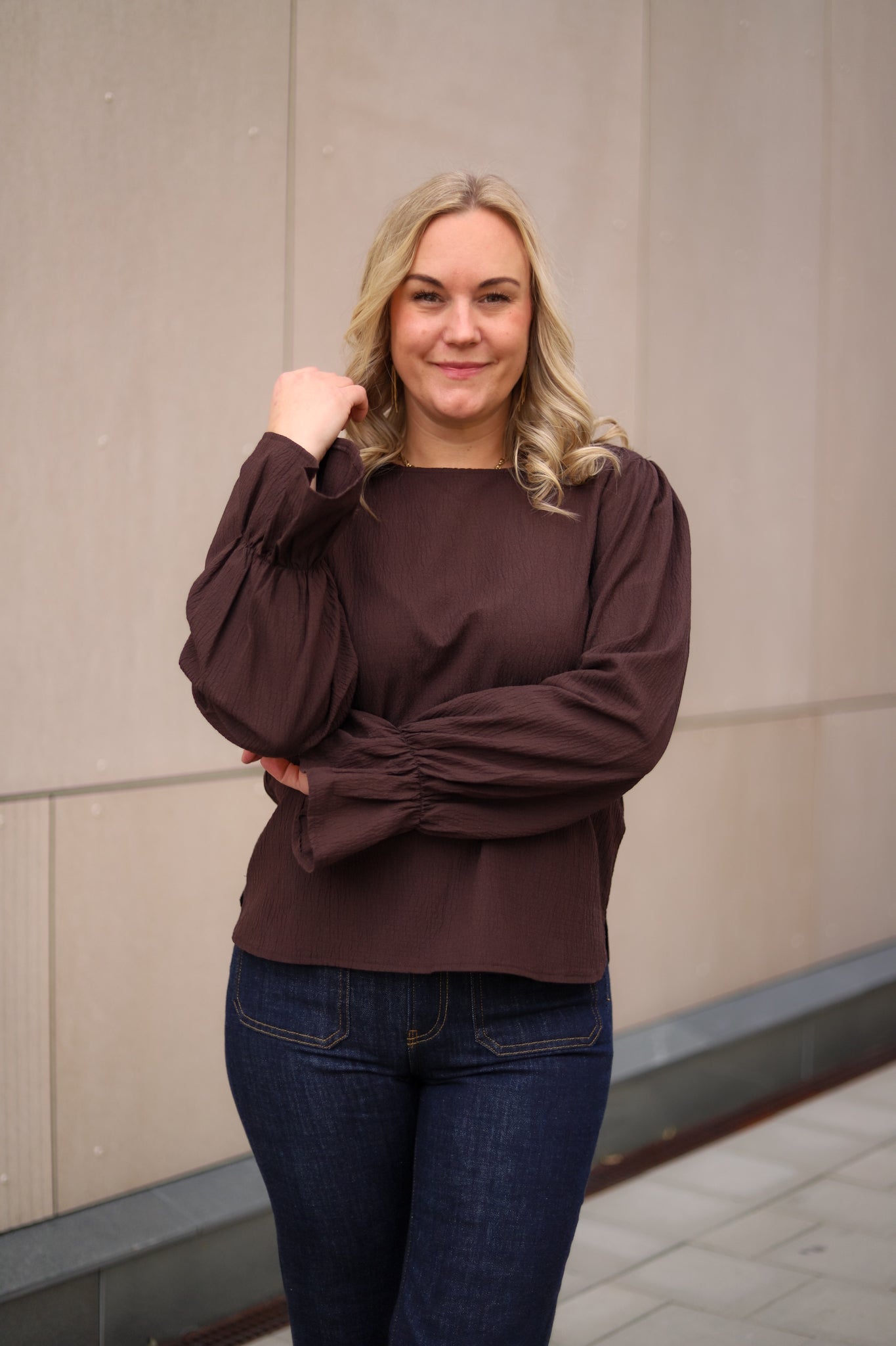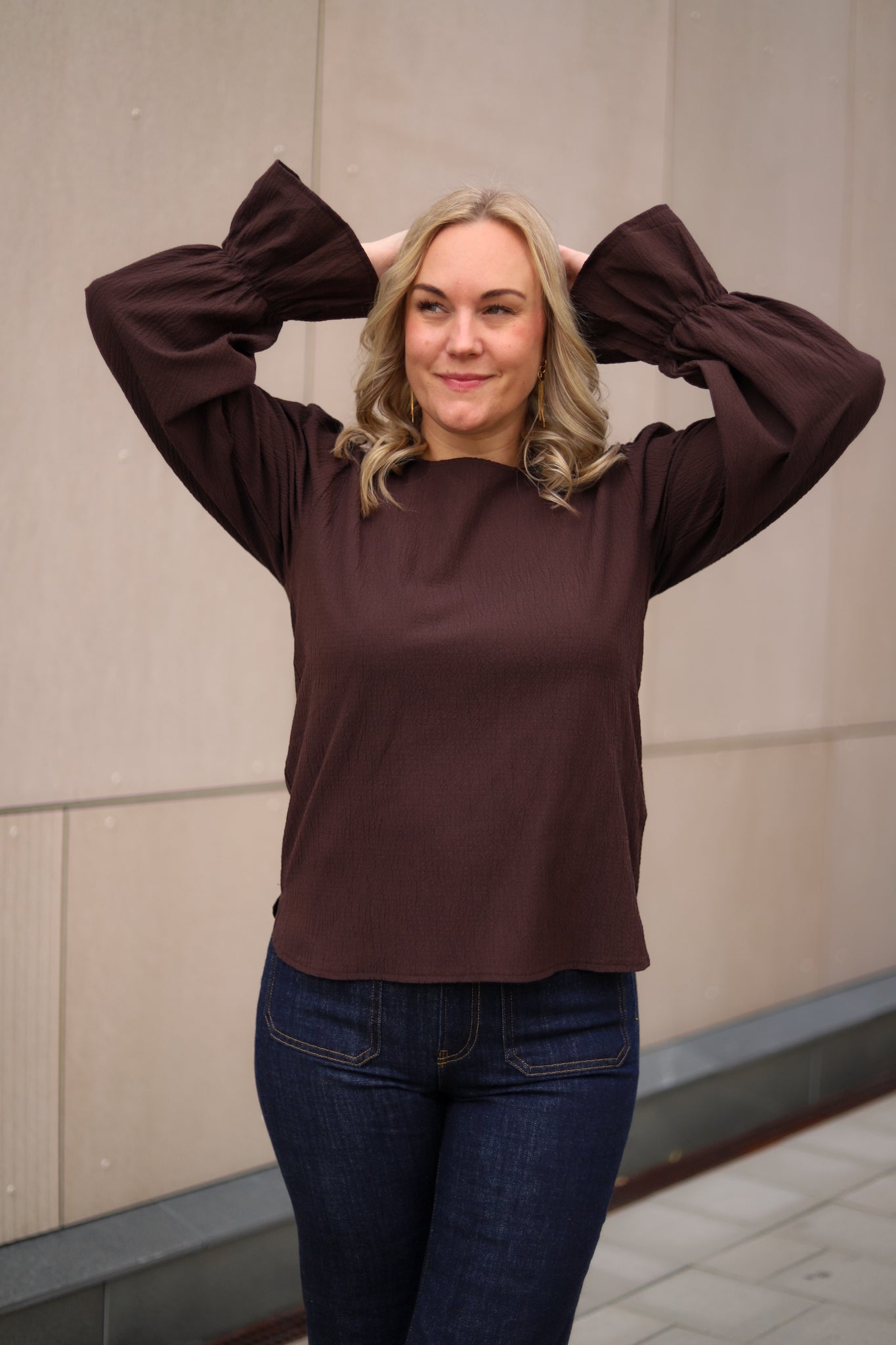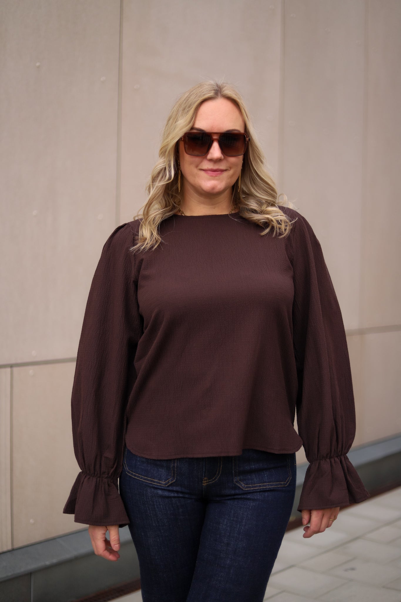Tidløs bluse fra Untold Stories i trendy brun. Avslappet modell med lett a-fasong og pen hoftelengde med avrundt hem. Rund hals, nøkkelhull i nakken og lange ermer med lett volum og strikk i mansjett som avsluttes i volang. Deilig lett og luftig seersucker kvalitet. Den perfekte hverdagsblusen!