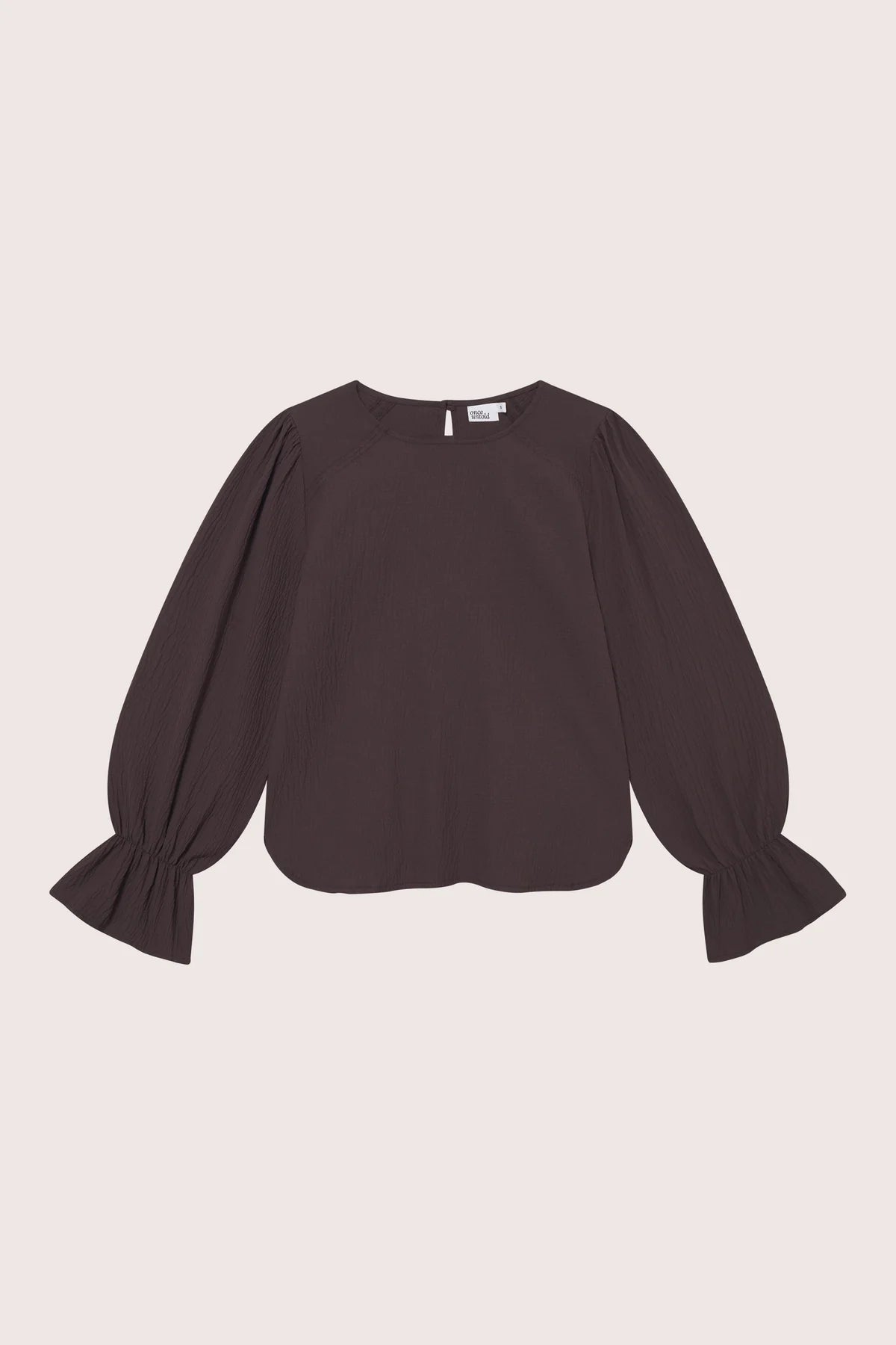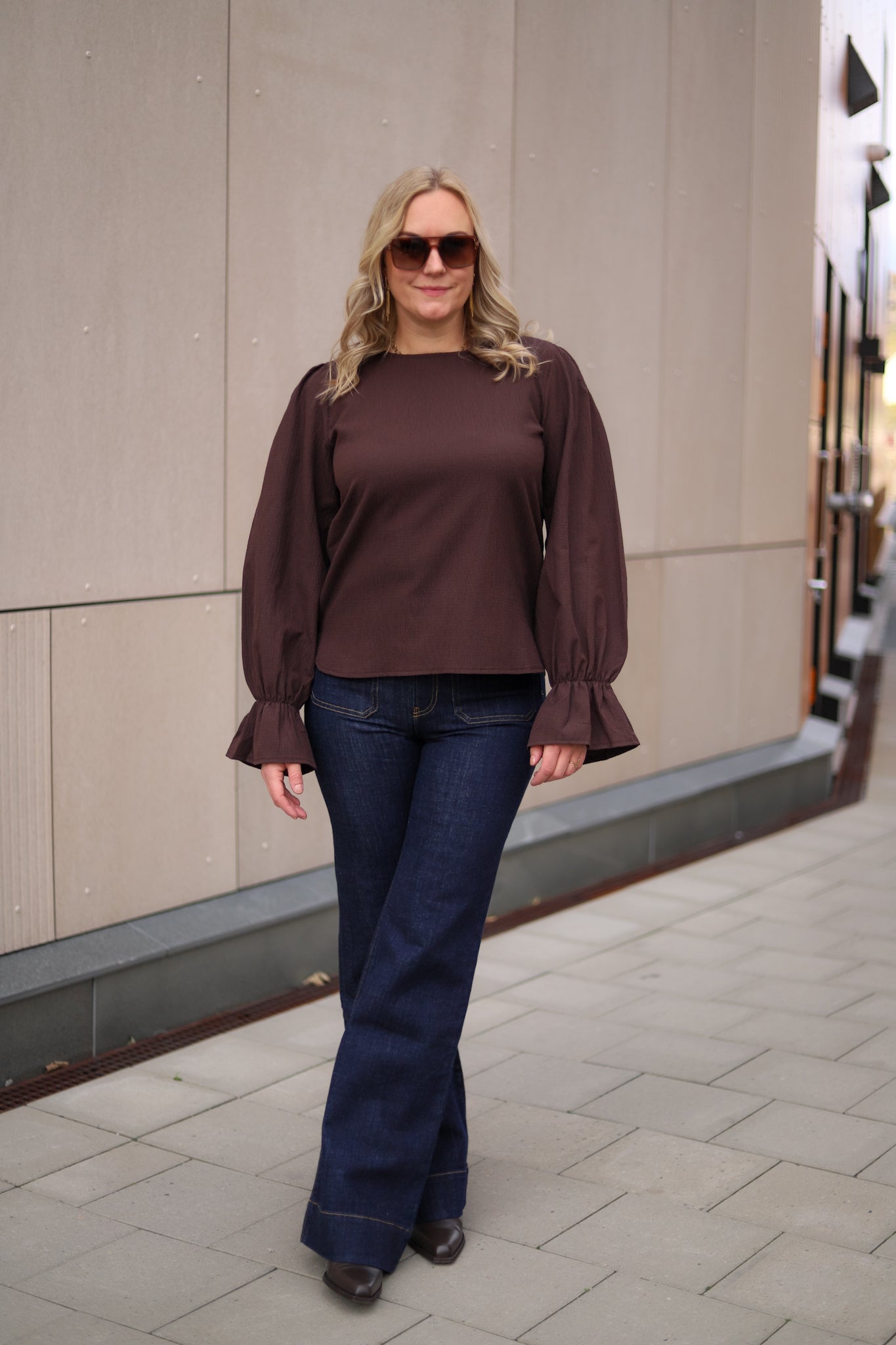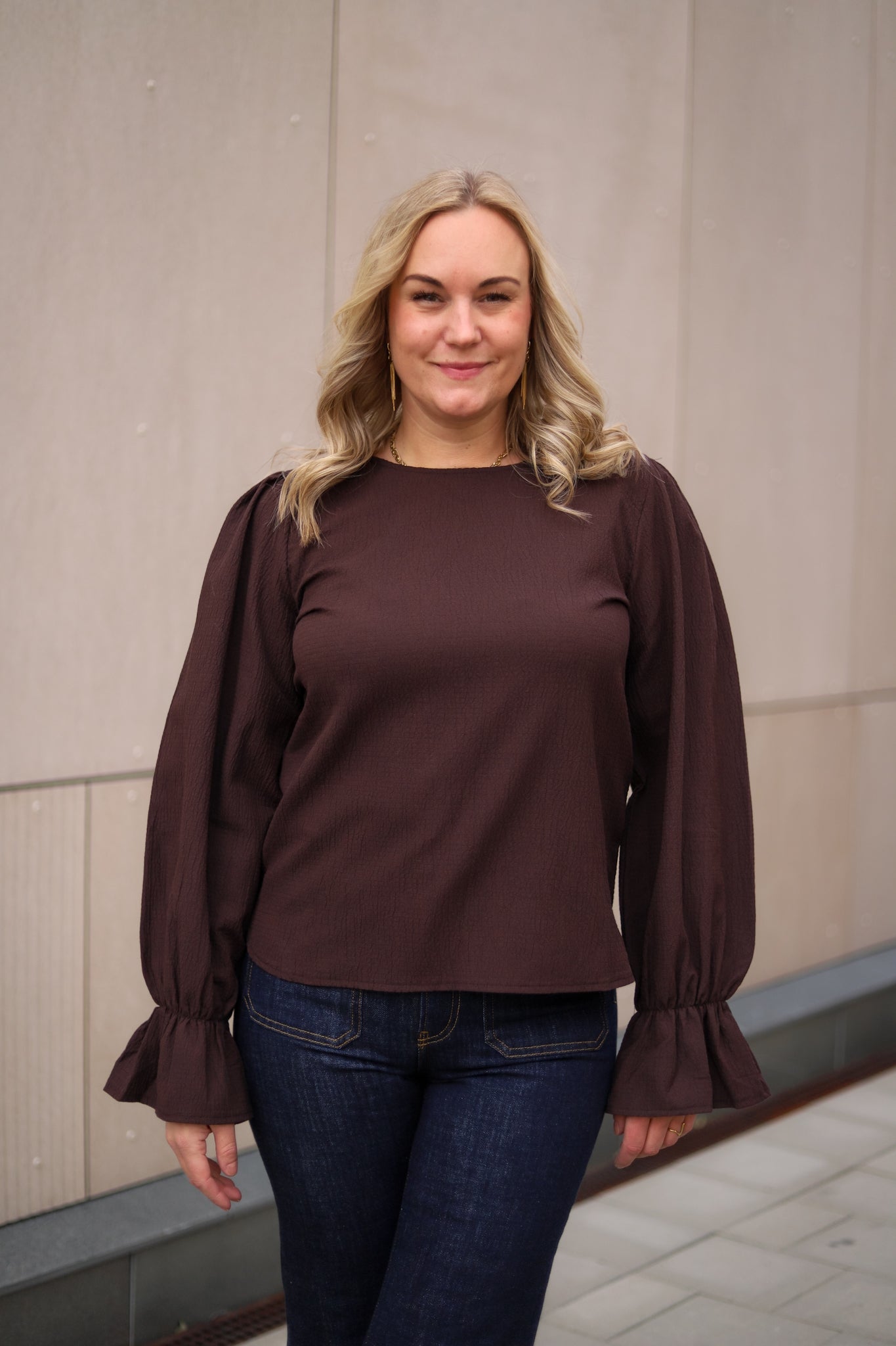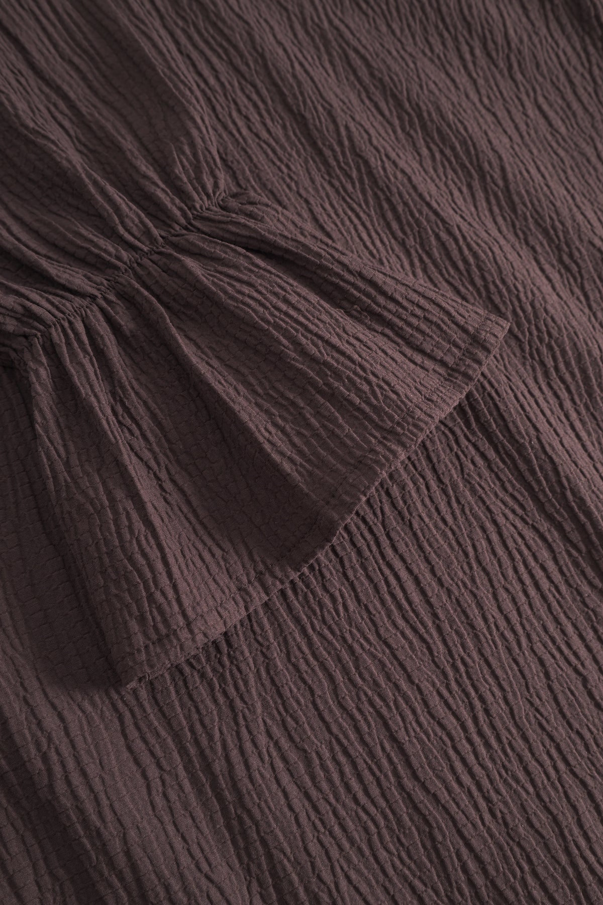 Tidløs bluse fra Untold Stories i trendy brun. Avslappet modell med lett a-fasong og pen hoftelengde med avrundt hem. Rund hals, nøkkelhull i nakken og lange ermer med lett volum og strikk i mansjett som avsluttes i volang. Deilig lett og luftig seersucker kvalitet. Den perfekte hverdagsblusen!