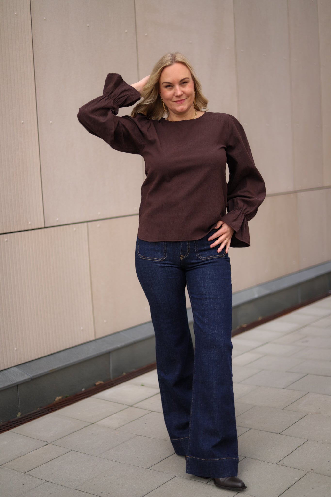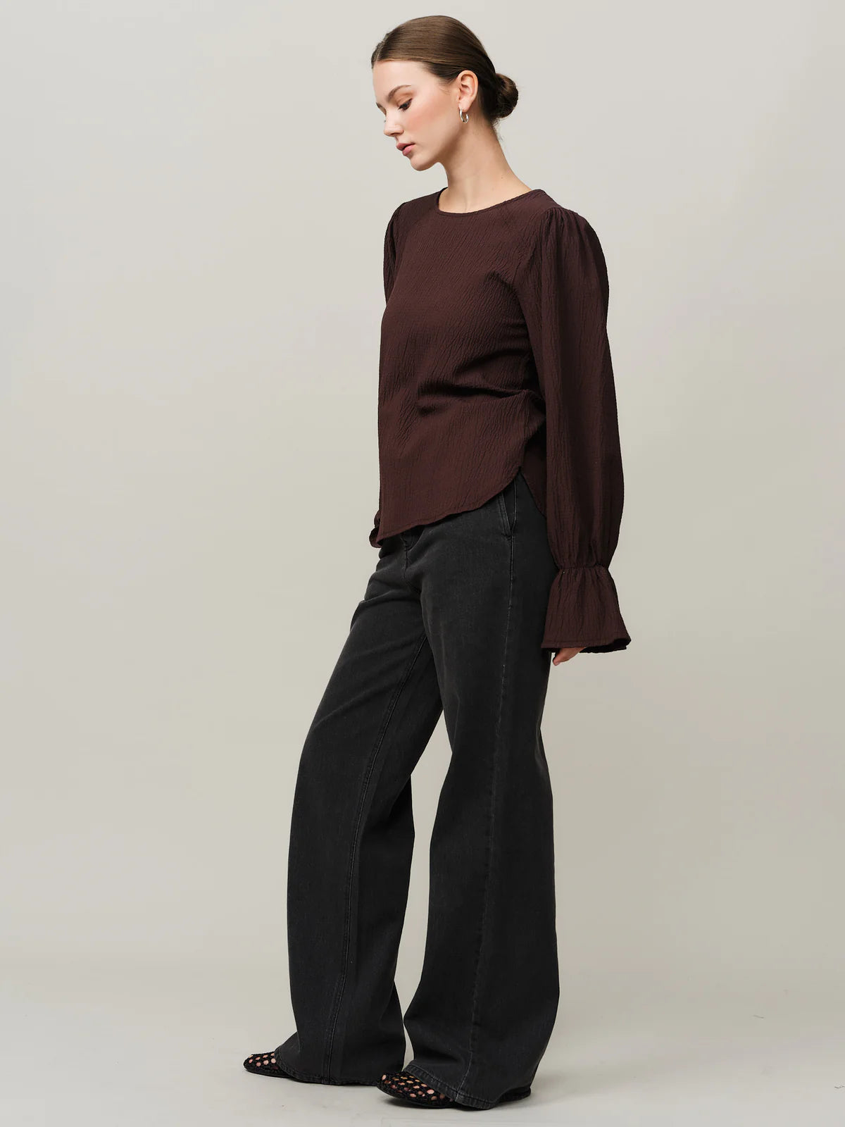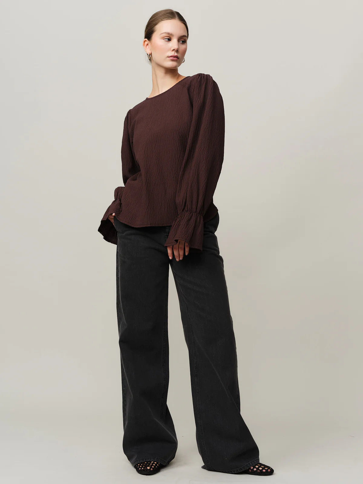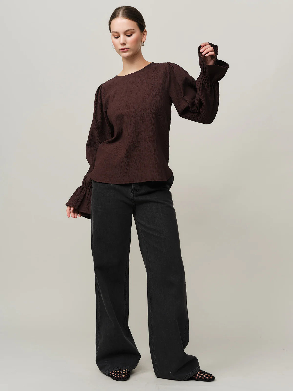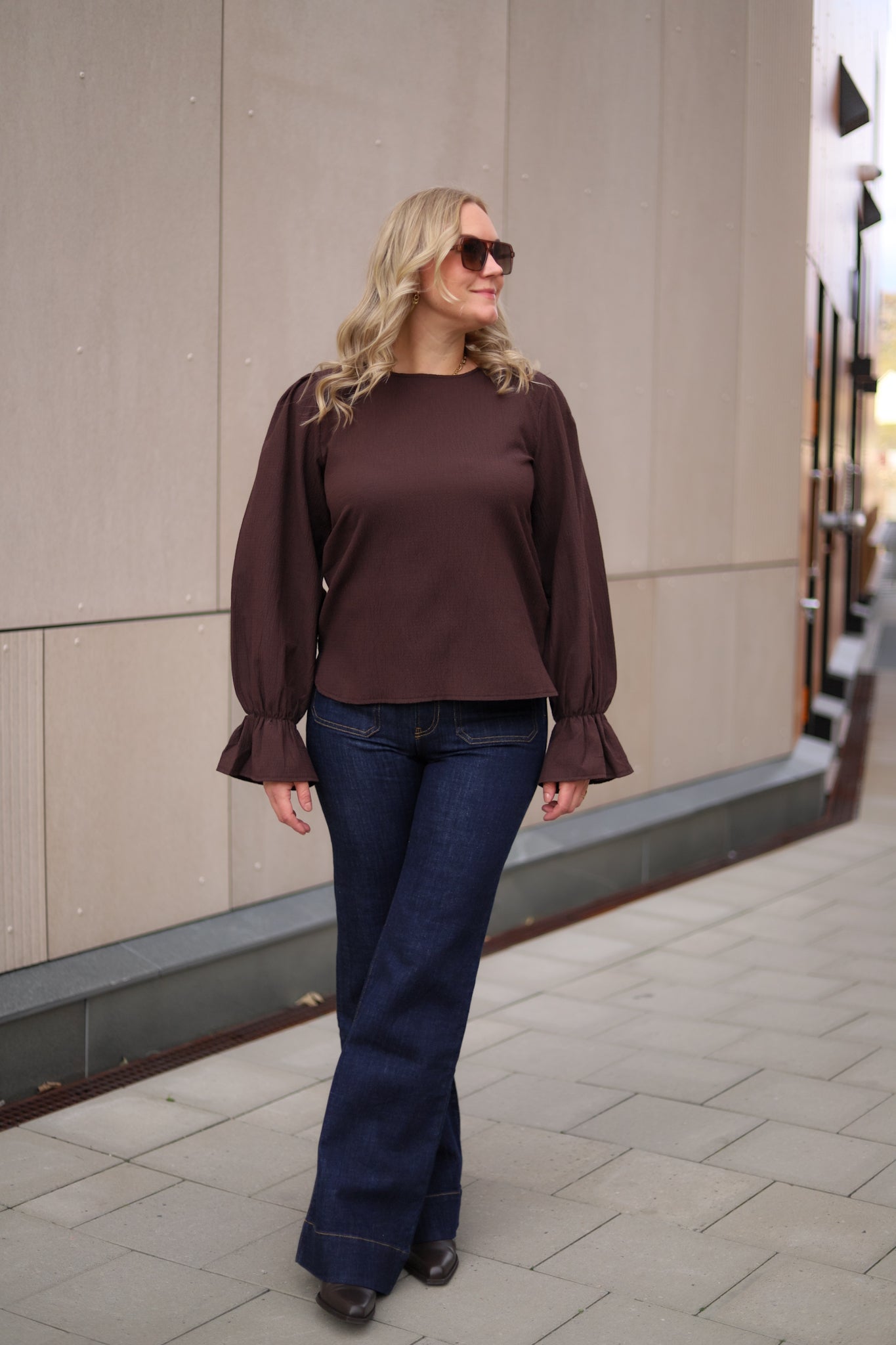 Tidløs bluse fra Untold Stories i trendy brun. Avslappet modell med lett a-fasong og pen hoftelengde med avrundt hem. Rund hals, nøkkelhull i nakken og lange ermer med lett volum og strikk i mansjett som avsluttes i volang. Deilig lett og luftig seersucker kvalitet. Den perfekte hverdagsblusen!