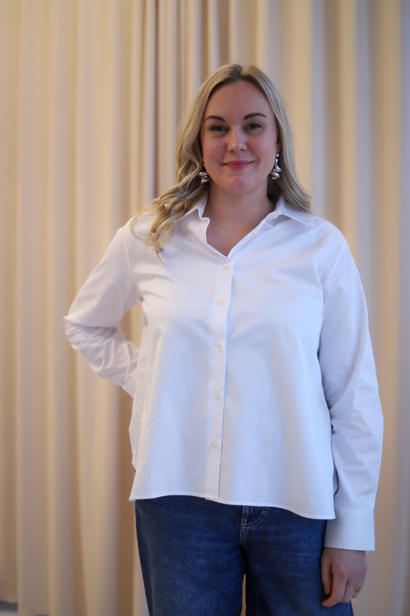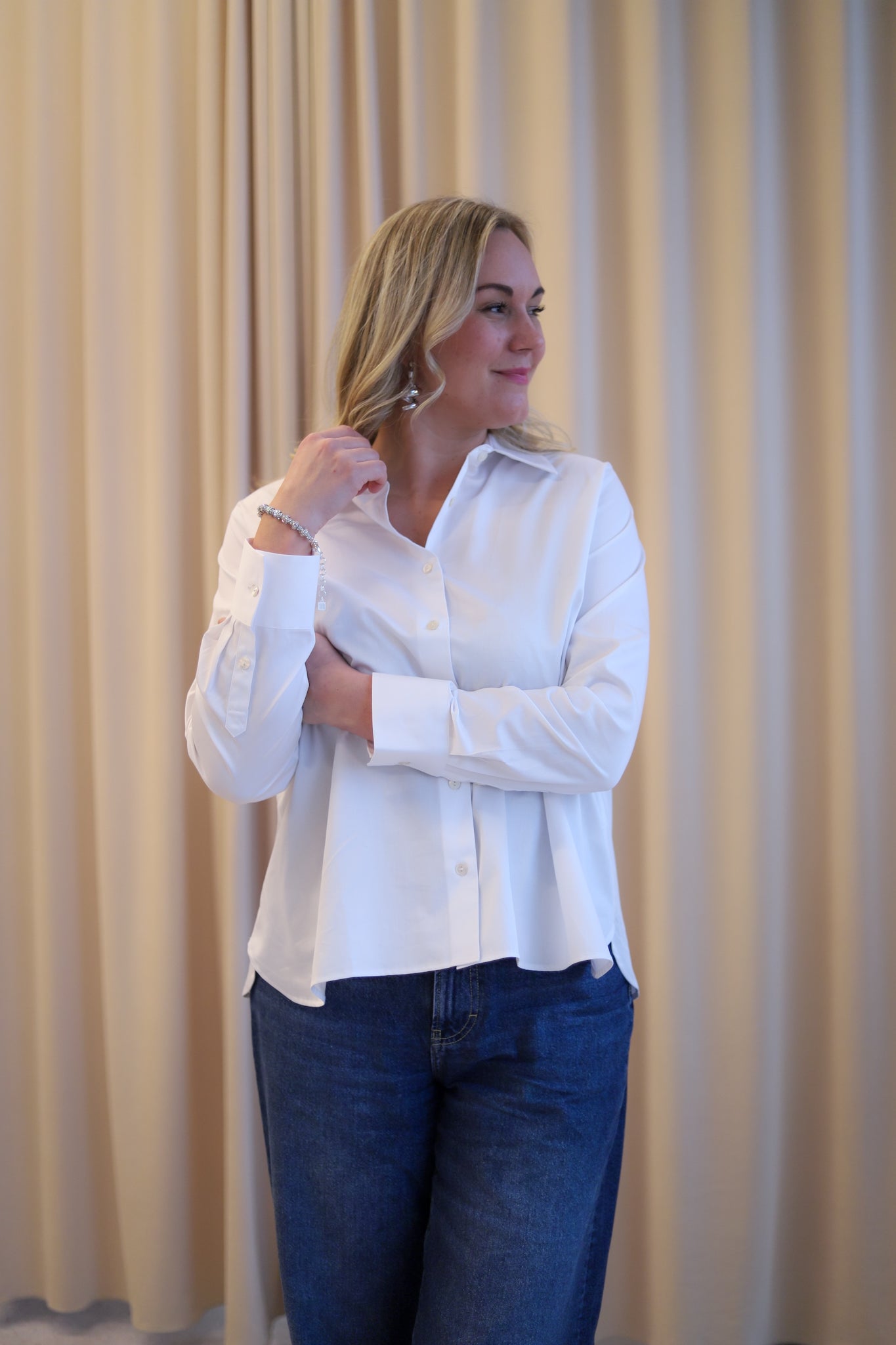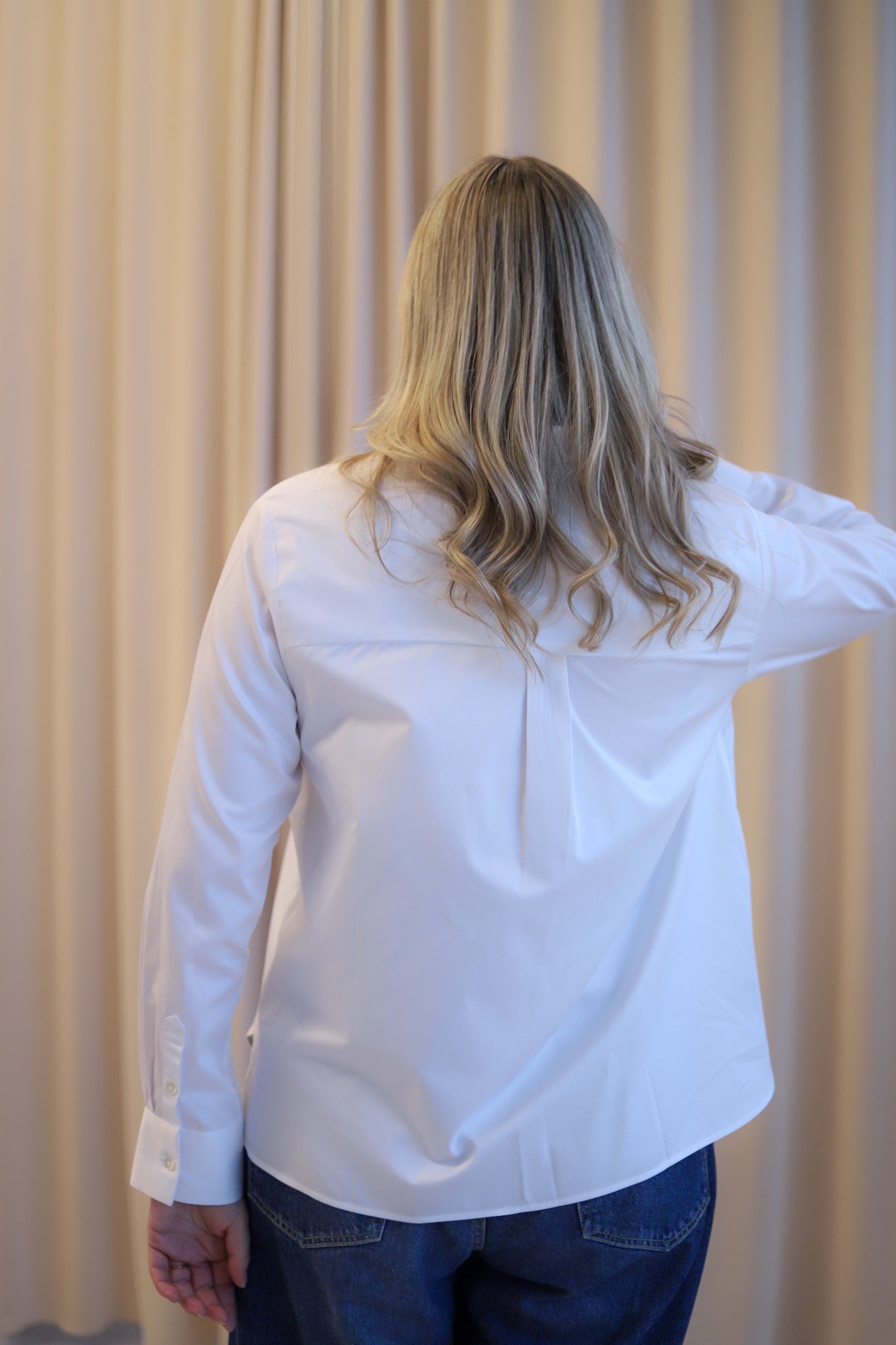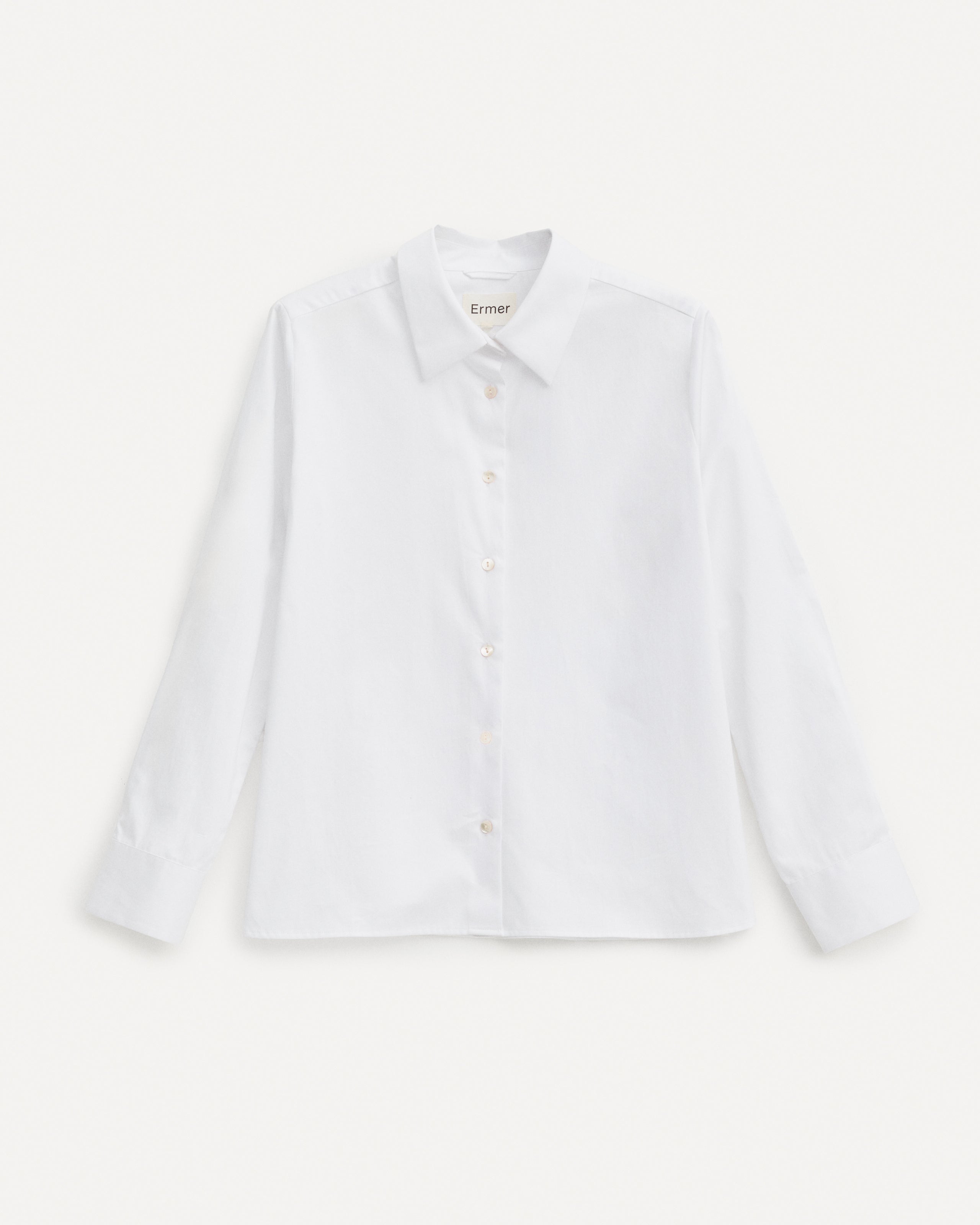 Moderne skjorte i klassisk hvit fra Ermer. Modellen skrår lett ut med klassisk skjortekrage og ton-i-ton knappestolpe. Nett lengde med rett hem, pen fold i ryggen og lange ermer med knapper i mansjett. Elegant modell i økologisk bomull med perlemorknapper, et allsidig basisplagg du vil bruke igjen og igjen.