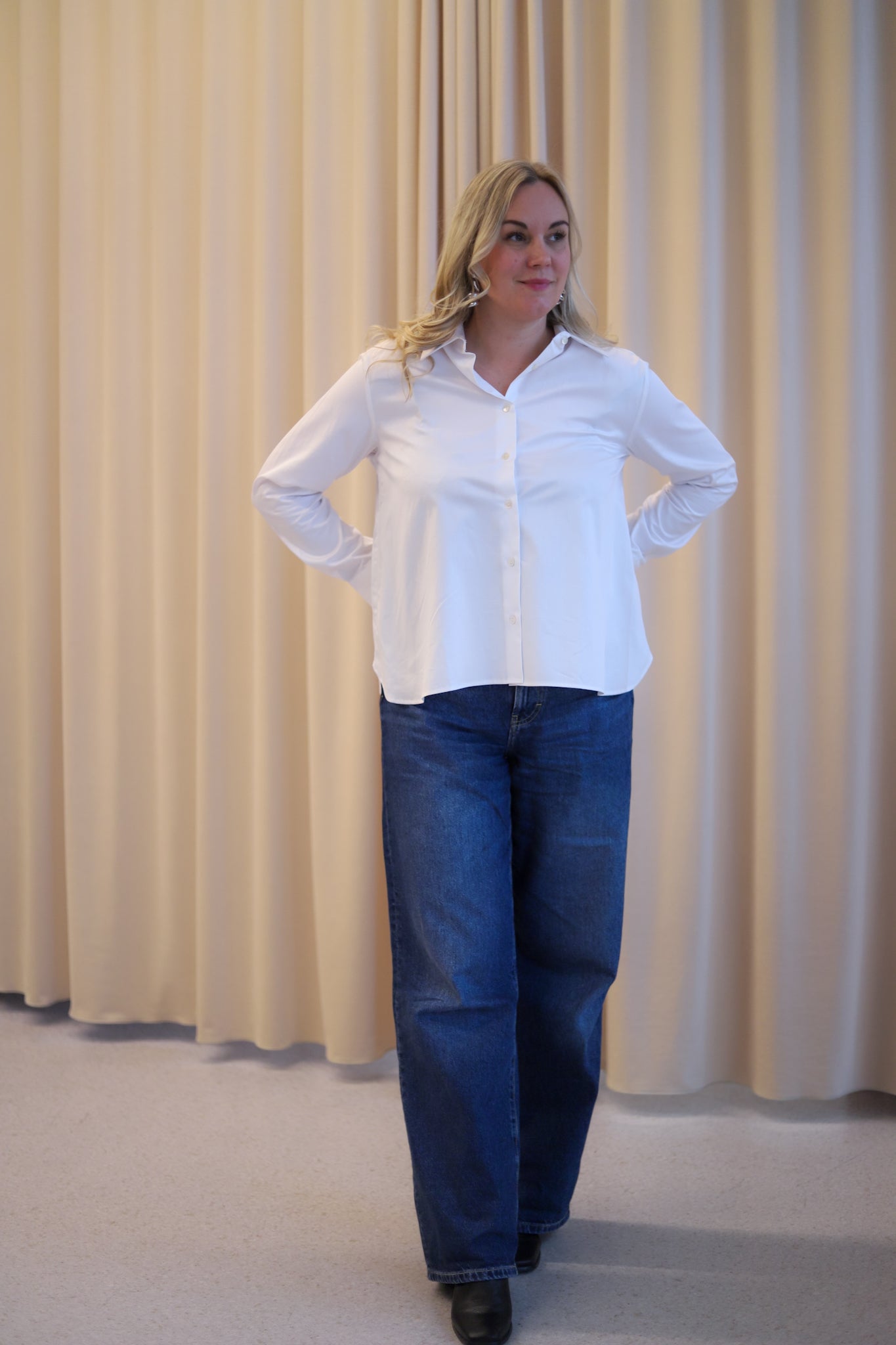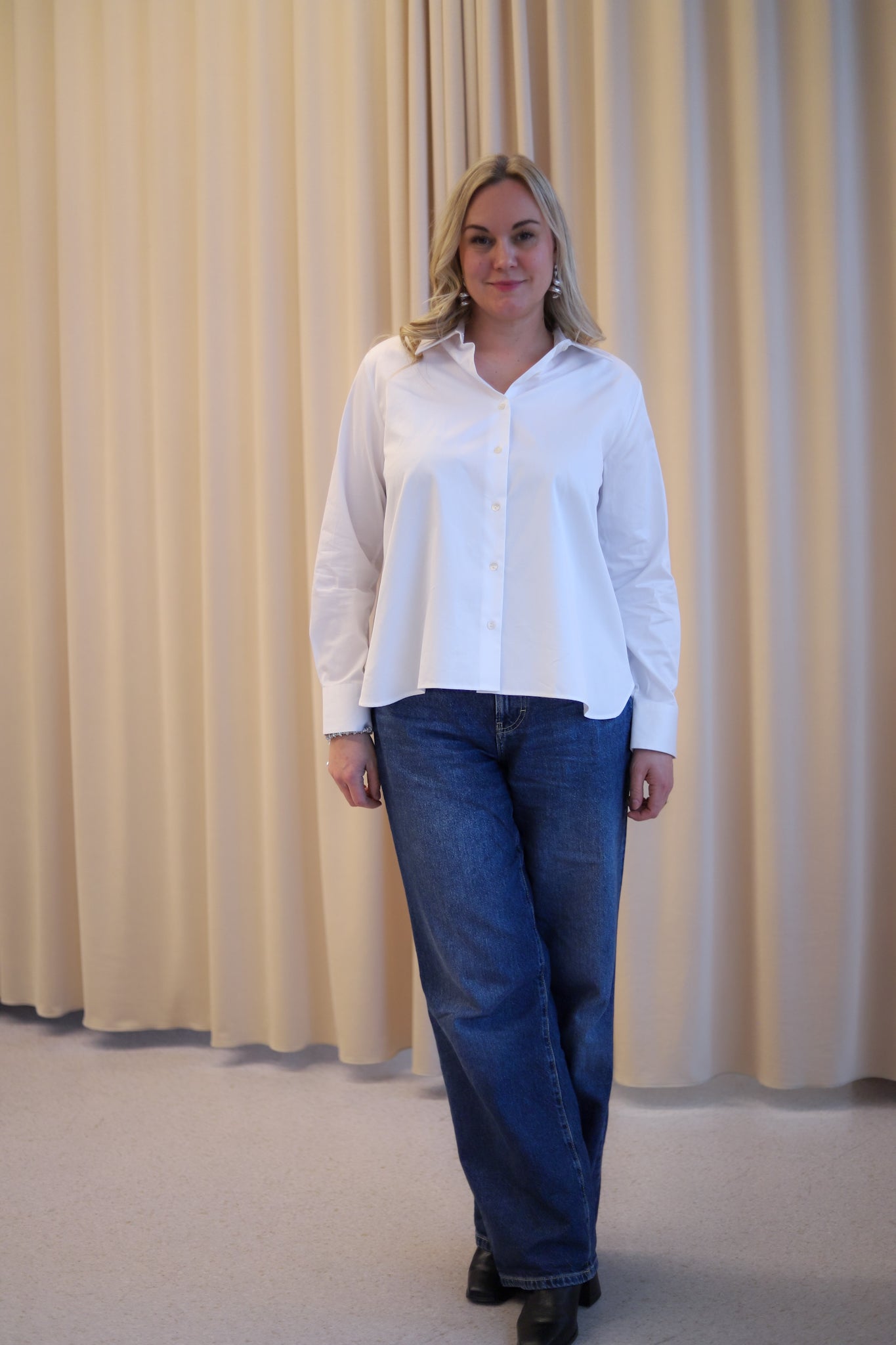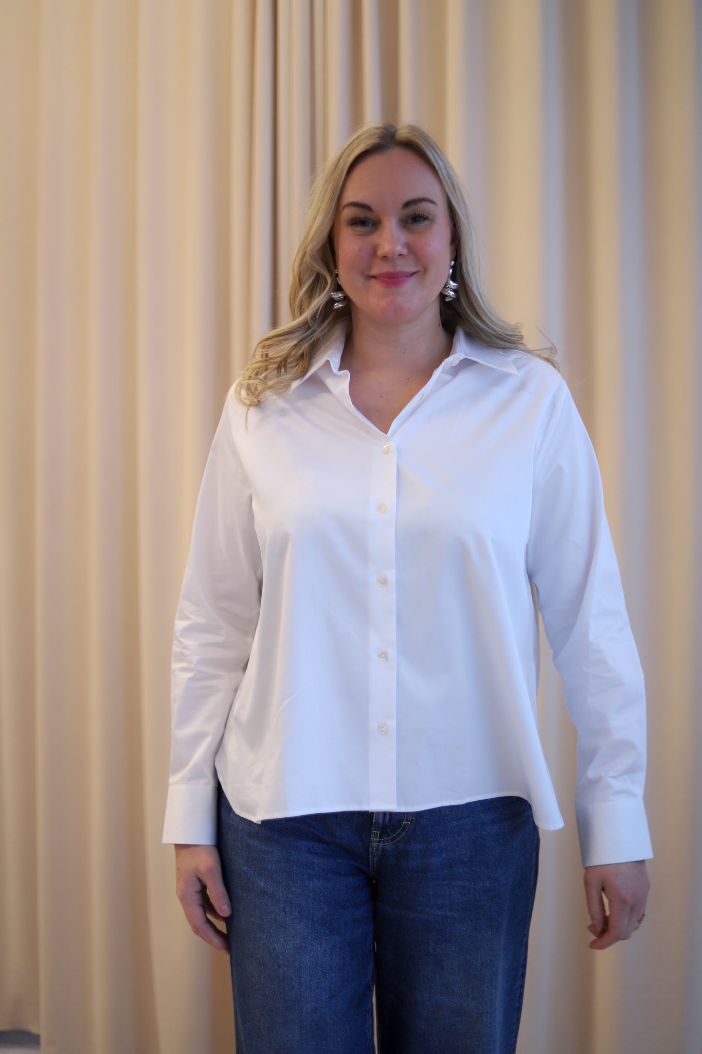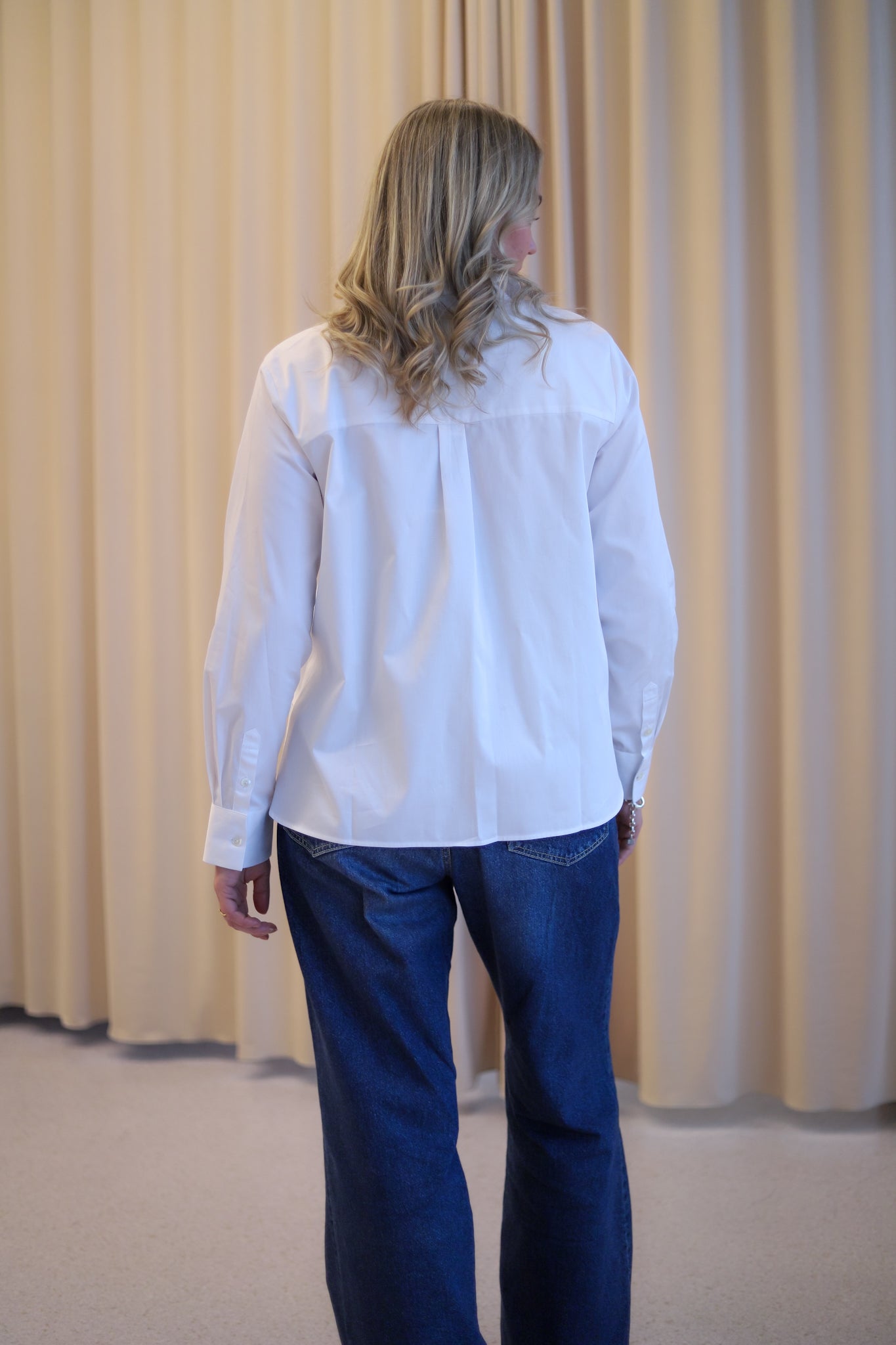 Moderne skjorte i klassisk hvit fra Ermer. Modellen skrår lett ut med klassisk skjortekrage og ton-i-ton knappestolpe. Nett lengde med rett hem, pen fold i ryggen og lange ermer med knapper i mansjett. Elegant modell i økologisk bomull med perlemorknapper, et allsidig basisplagg du vil bruke igjen og igjen.