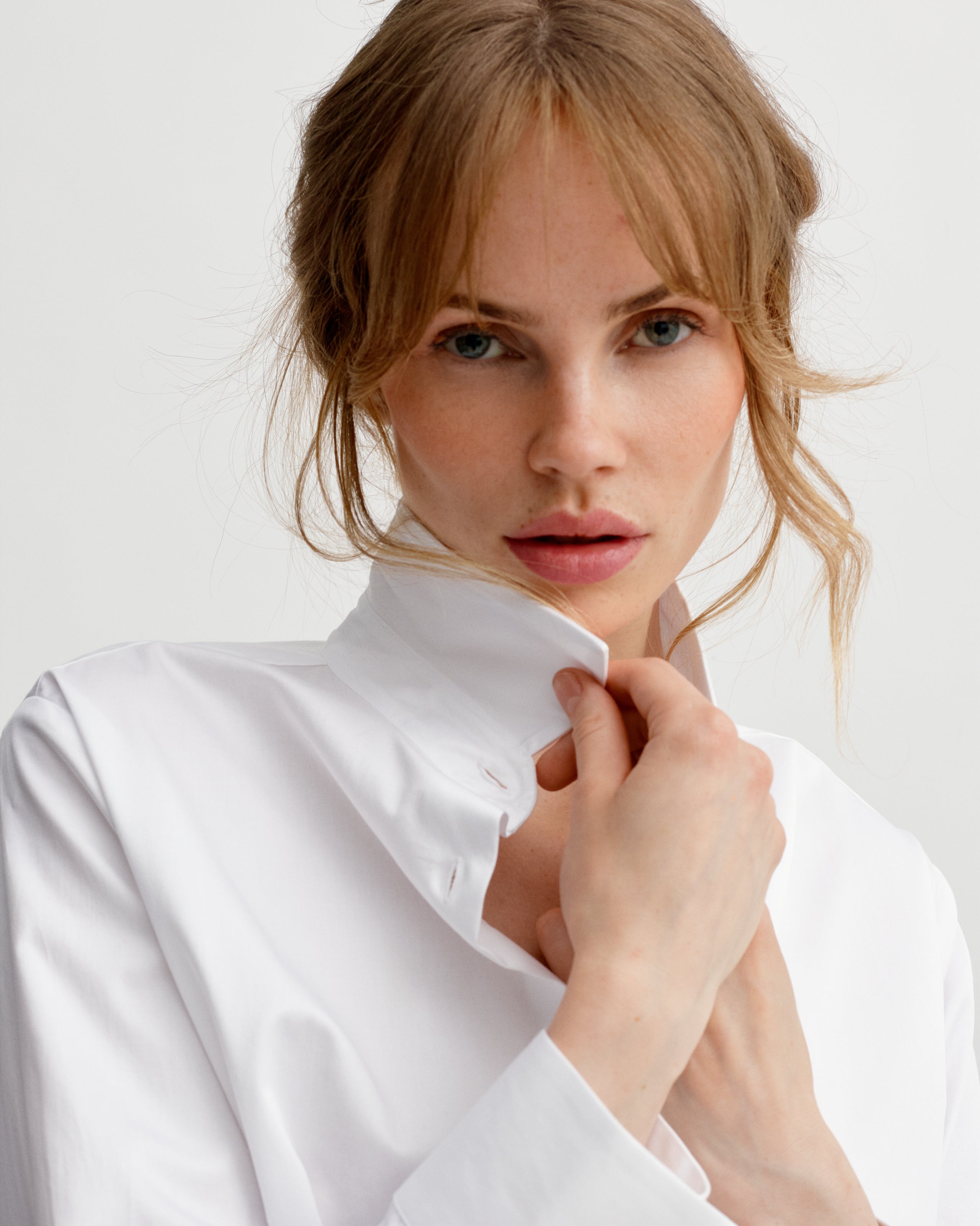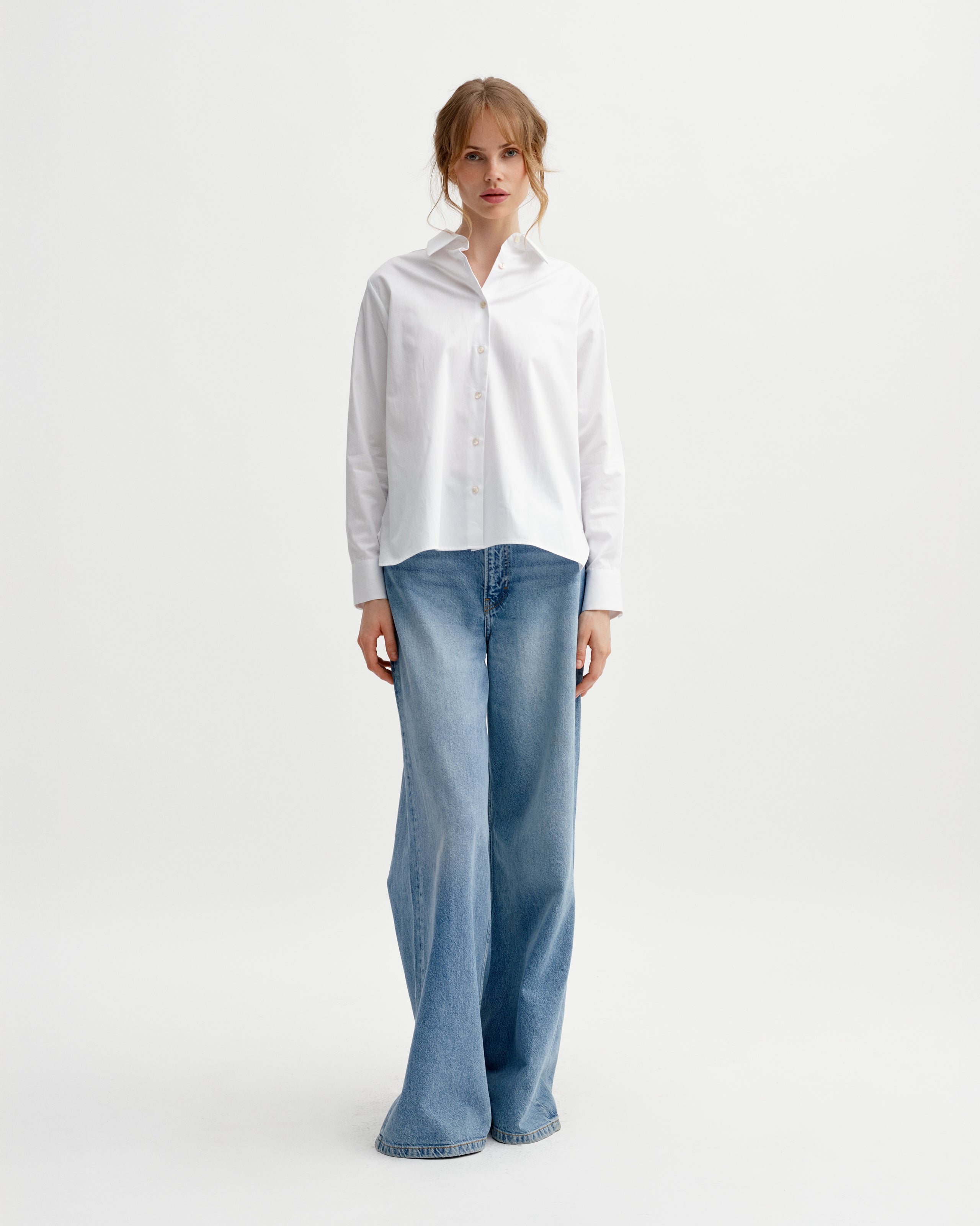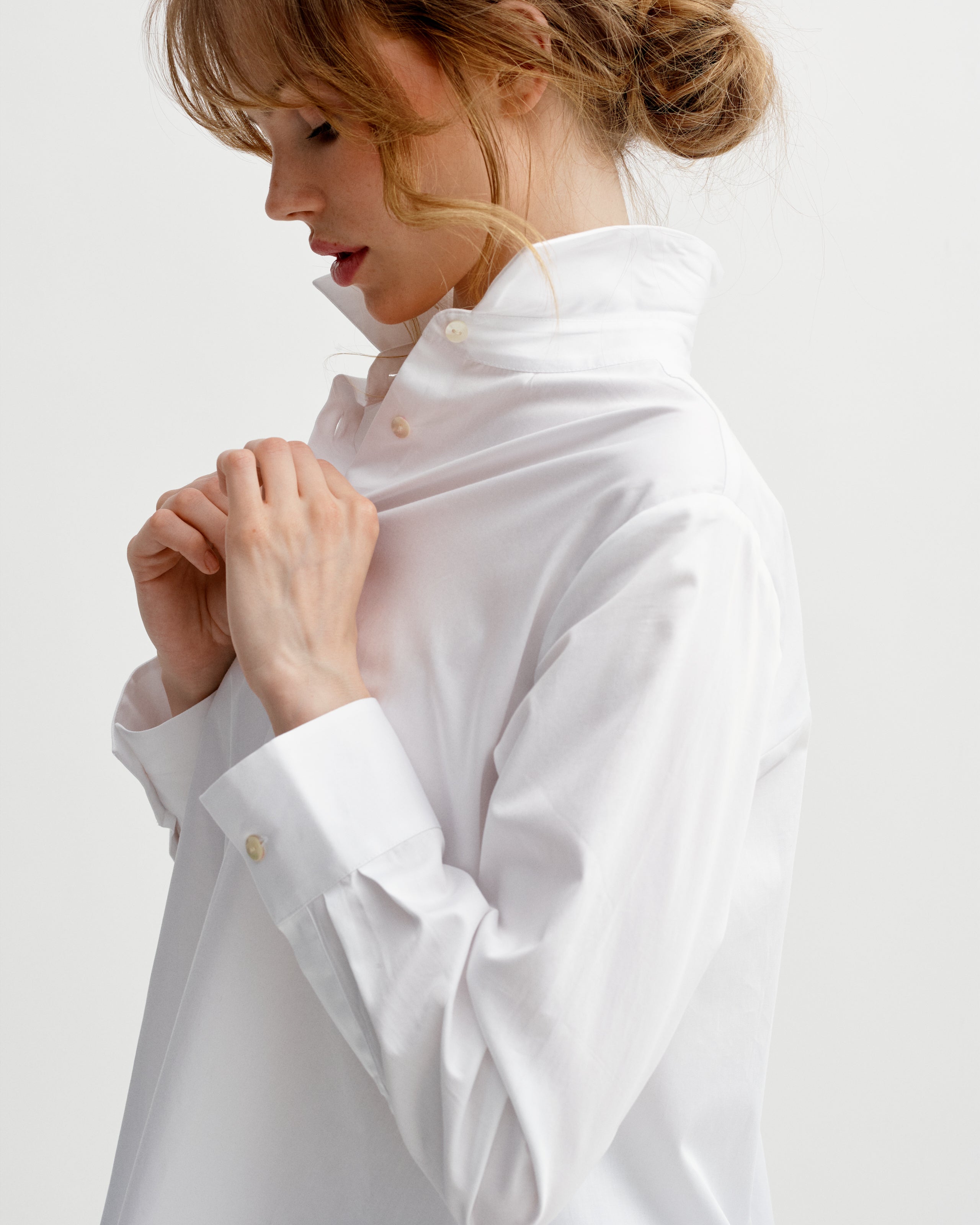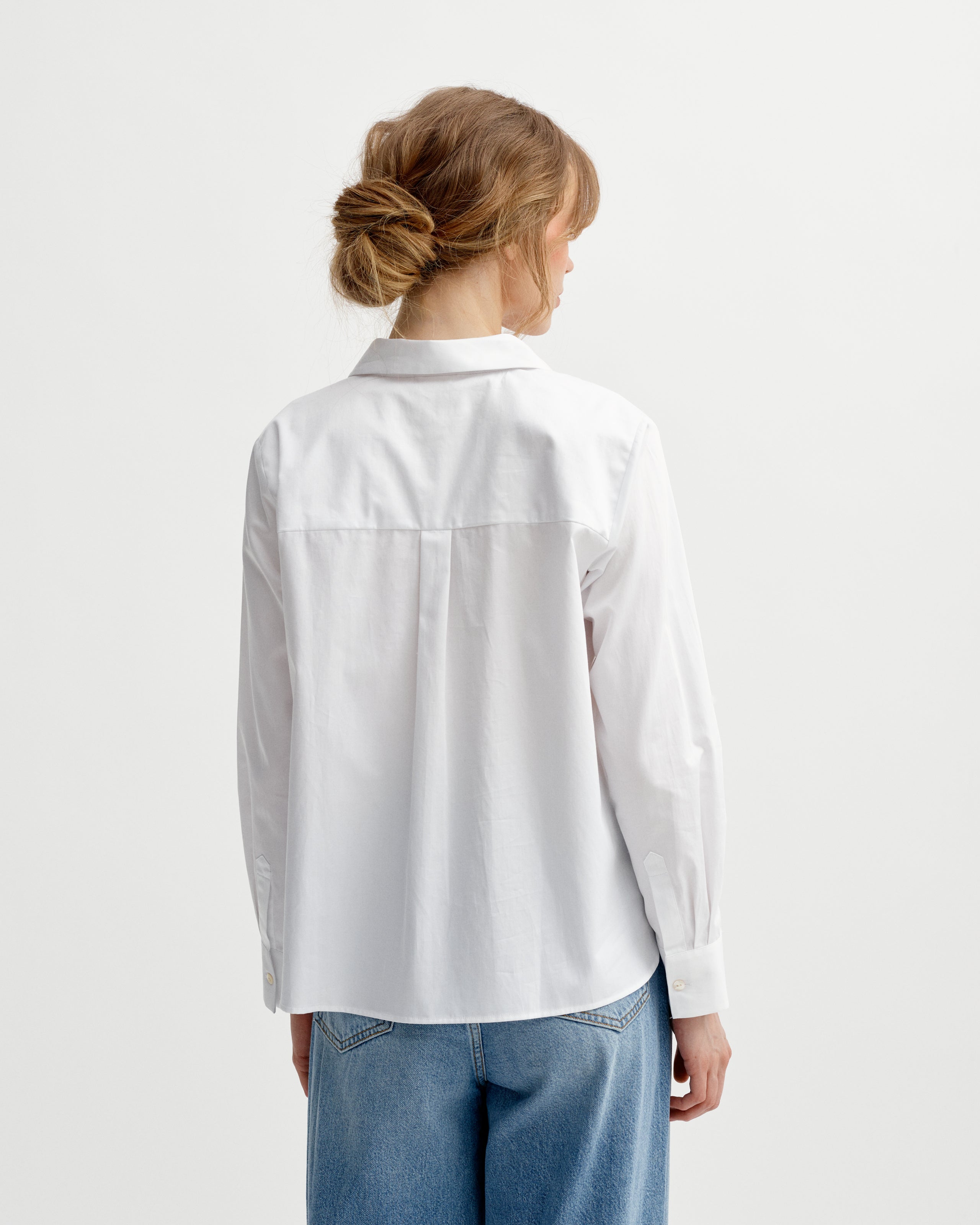 Moderne skjorte i klassisk hvit fra Ermer. Modellen skrår lett ut med klassisk skjortekrage og ton-i-ton knappestolpe. Nett lengde med rett hem, pen fold i ryggen og lange ermer med knapper i mansjett. Elegant modell i økologisk bomull med perlemorknapper, et allsidig basisplagg du vil bruke igjen og igjen.