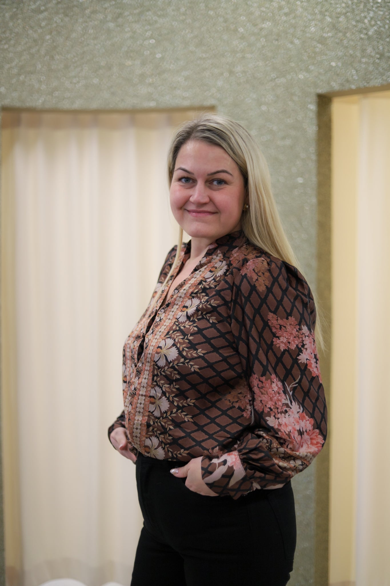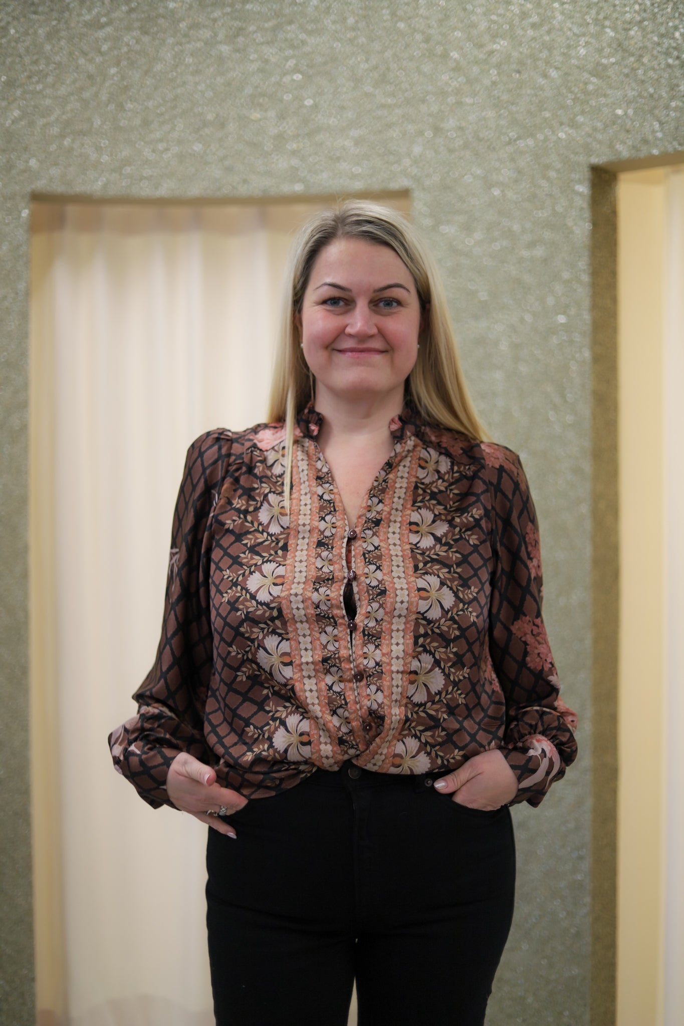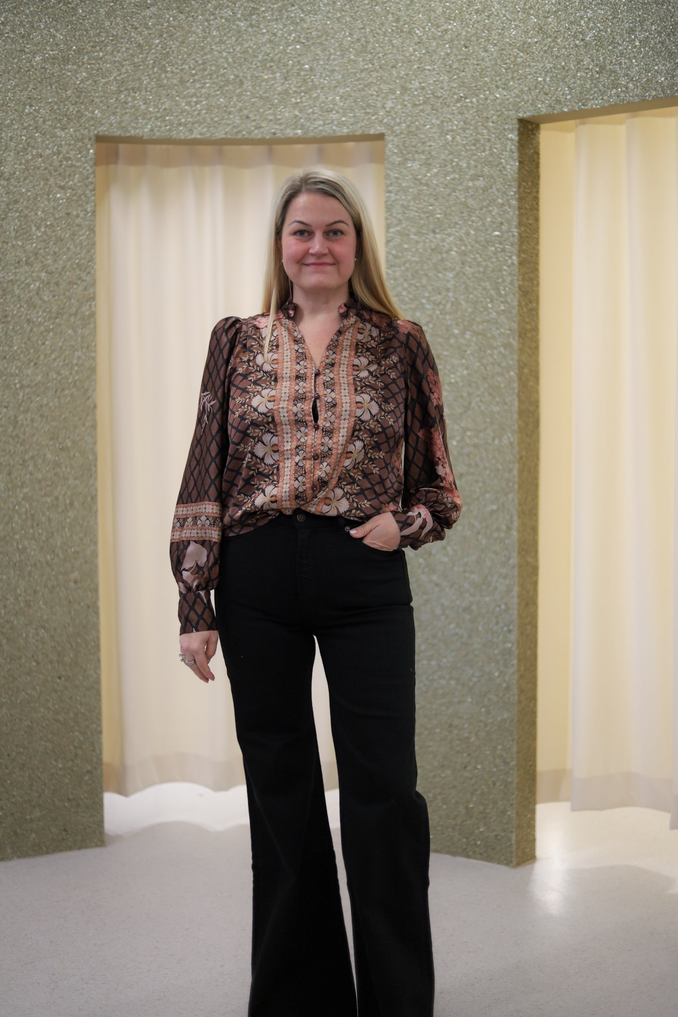 Lekker satengbluse i brun med delikat mønster i sort, beige og rosatoner fra Neo Noir. Modellen er rett med pen hoftlengde. V-hals med feminin volang i halskant og søt knappestolpe i front. Lange voluminøse ermer med puff i skuldre og smock i mansjett. Nydelig bluse til både hverdag og fest.