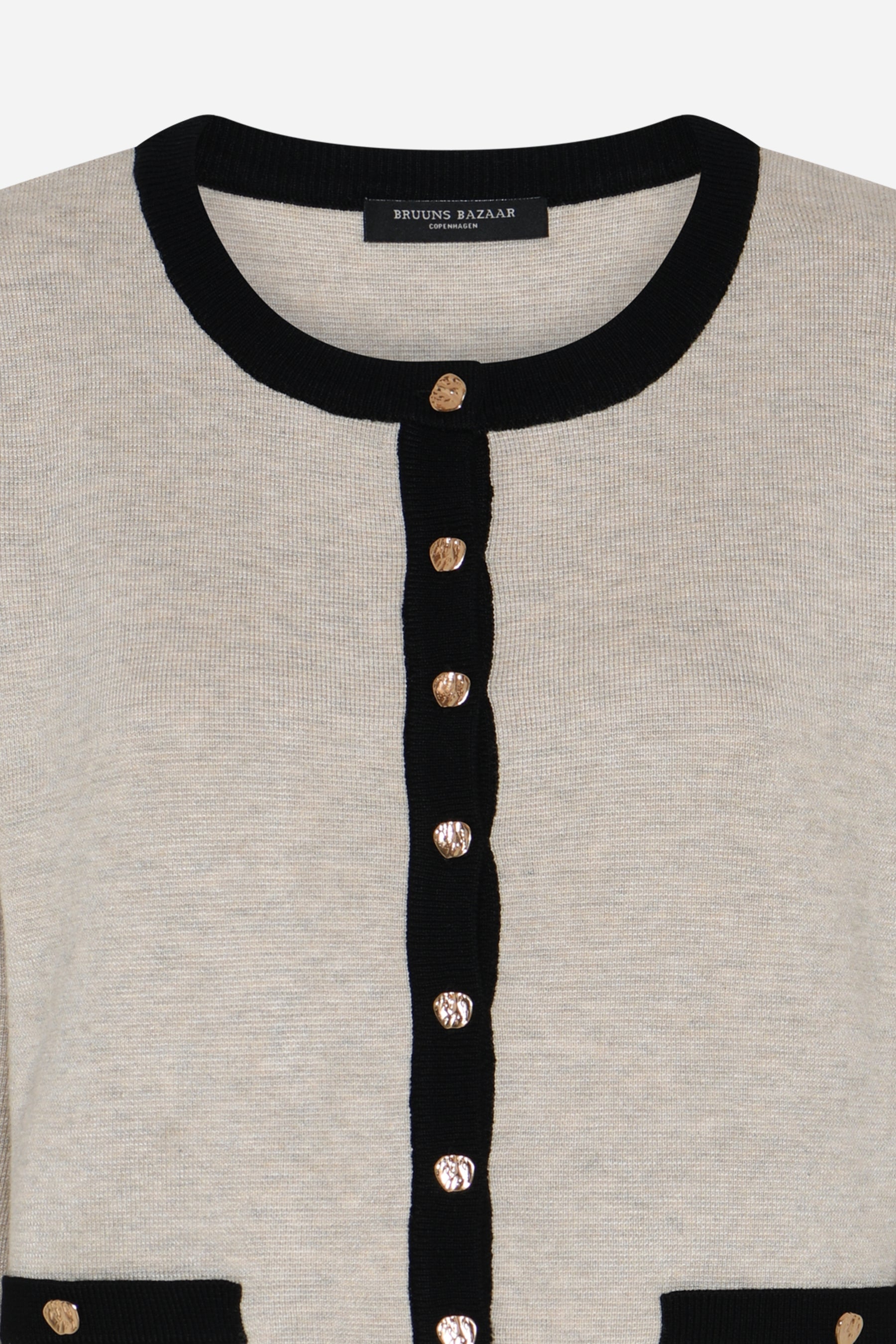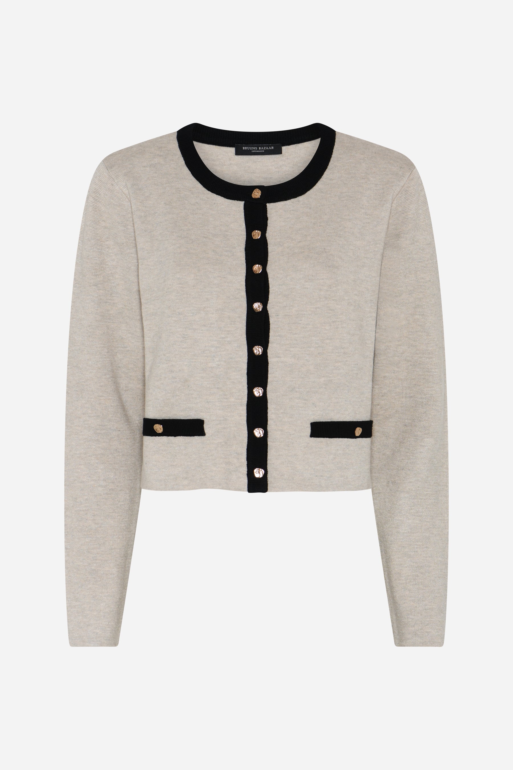 Stilren cardigan i en sandmelert farge med sorte kontrastkanter fra Bruuns Bazaar. Modellen er rett med lett croppet lengde og lange ermer med lett droppet skulder. Den har knappestolpe i front med delikate knapper i gull. En allsidig cardigan som enkelt kan pyntes opp eller ned. Den strukturerte strikken og kontrastkantene skaper et delikat og tidløst utseende. Style den over en kjole eller med en enkel topp og bukser med høy midje for en feminin look.