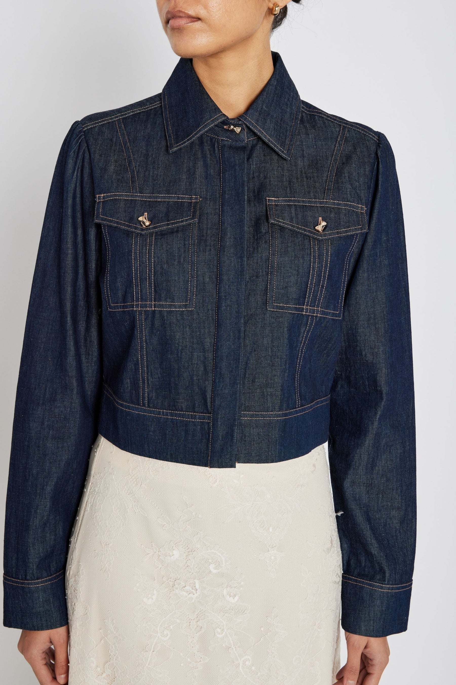 Feminin skjorte i mørk denim fra Bruuns Bazaar. Modellen er rett med croppet lengde, klassisk skjortekrage og lange ermer med knapper i mansjett. Den har skjult knepping i front og søte knapper formet som en sløyfe i halsen og på patchlommer på brystet. Kontrastsømmer skaper et moderne og strukturert uttrykk. Style den med matchende skjørt for en kul denim-look.