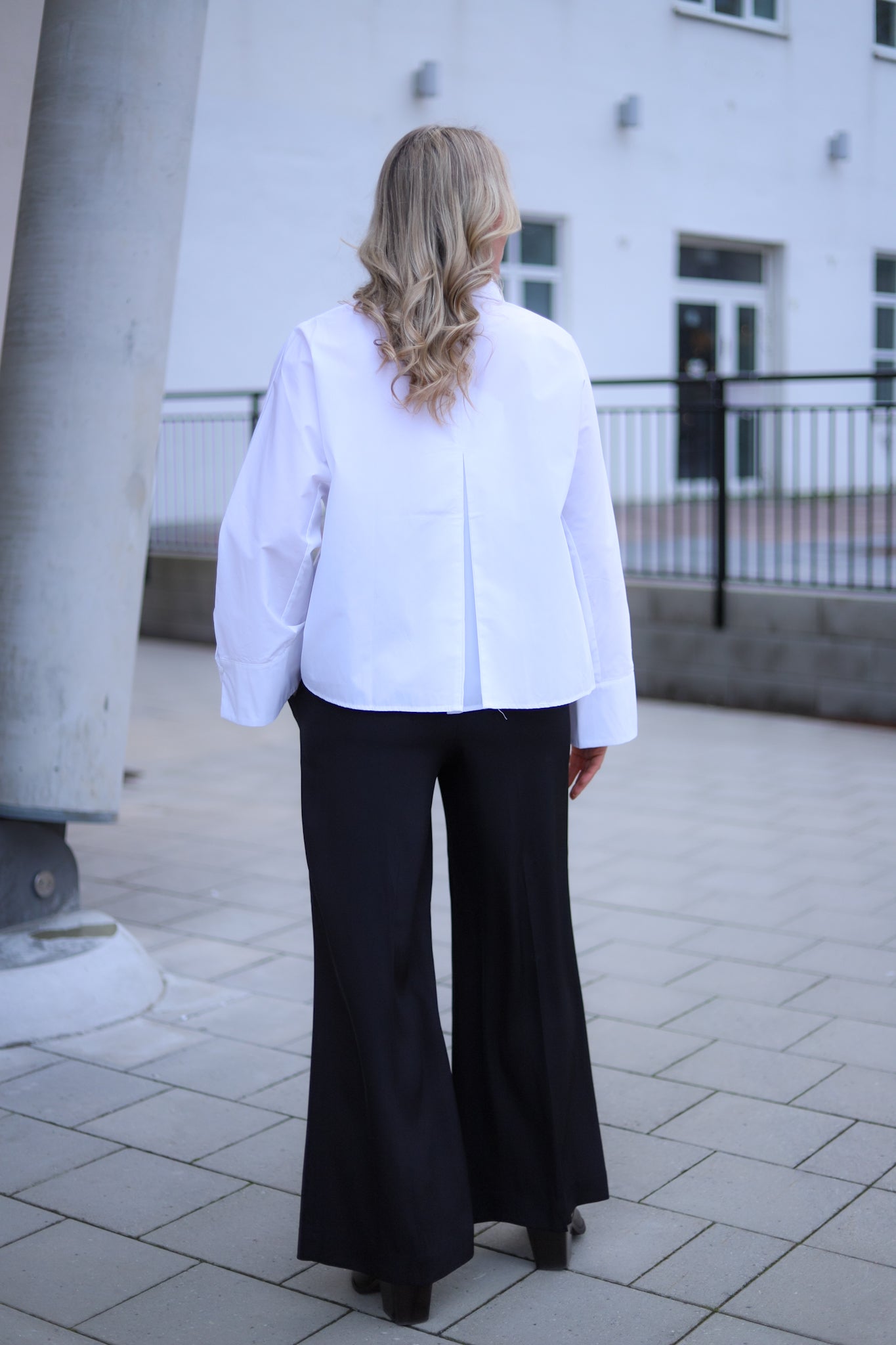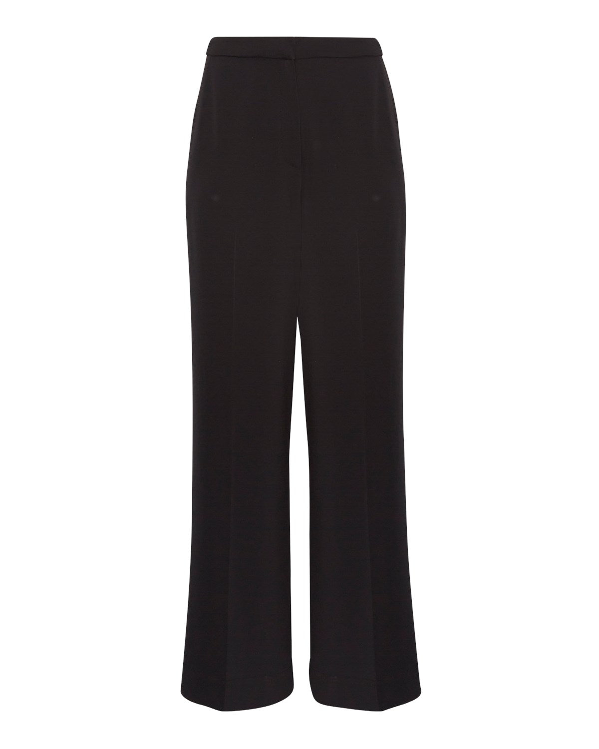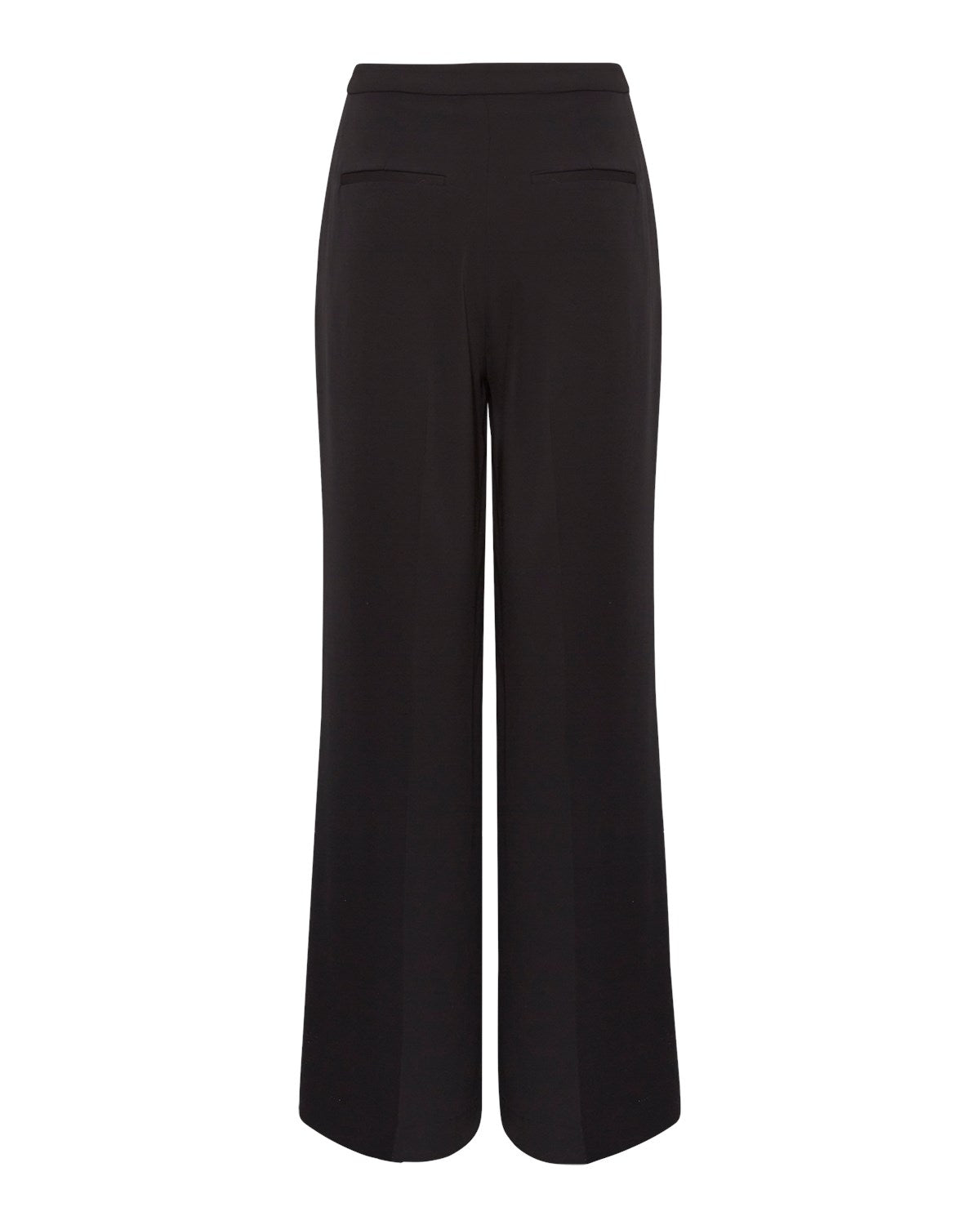 Tidløs bukse i klassisk sort fra MSCH Copenhagen. Modellen er rett med høyt liv og delikat presskant i buksebena. Lukkes med glidelås og knapping. Praksiske stikklommer i sidene. Lett og shiny kvalitet. Buksen er like fin til både hverdags og fest! Style med matchende bluse for komplett look.