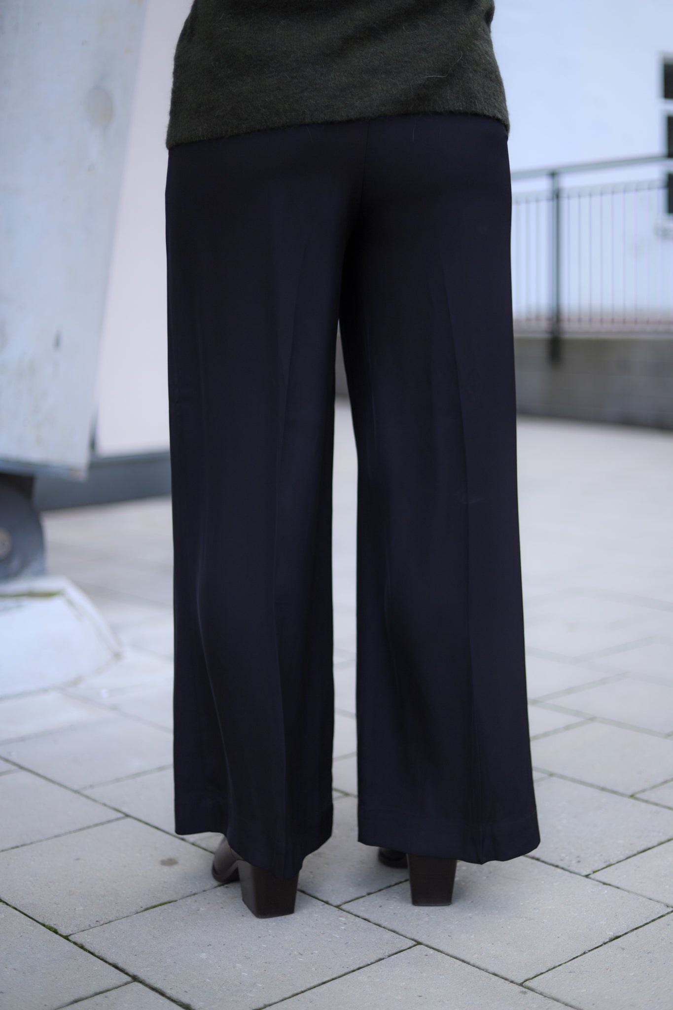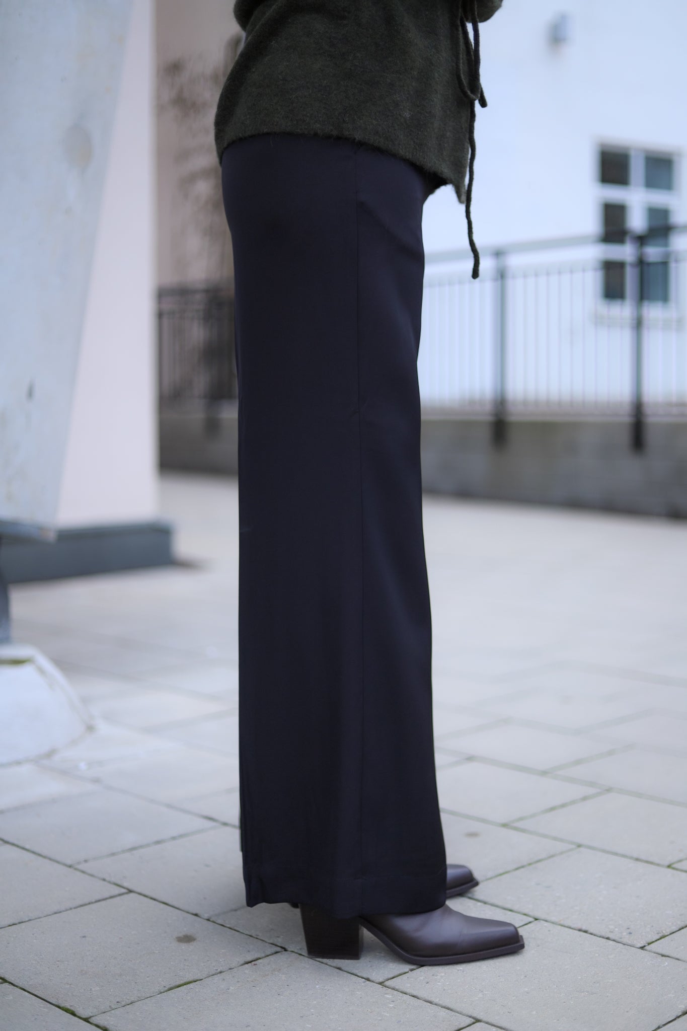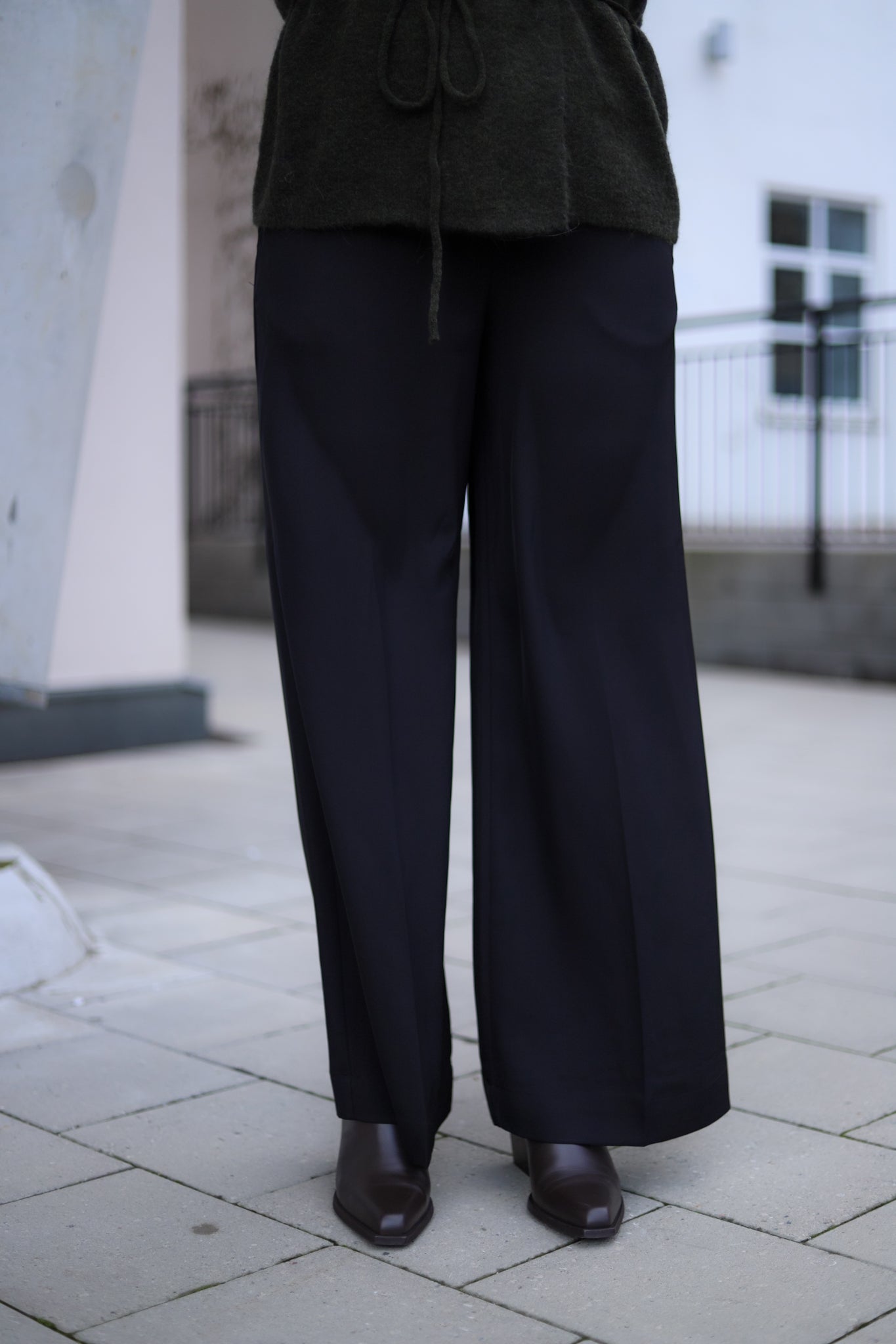 Tidløs bukse i klassisk sort fra MSCH Copenhagen. Modellen er rett med høyt liv og delikat presskant i buksebena. Lukkes med glidelås og knapping. Praksiske stikklommer i sidene. Lett og shiny kvalitet. Buksen er like fin til både hverdags og fest! Style med matchende bluse for komplett look.