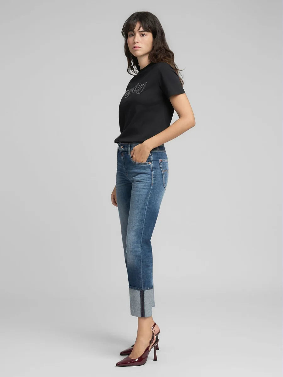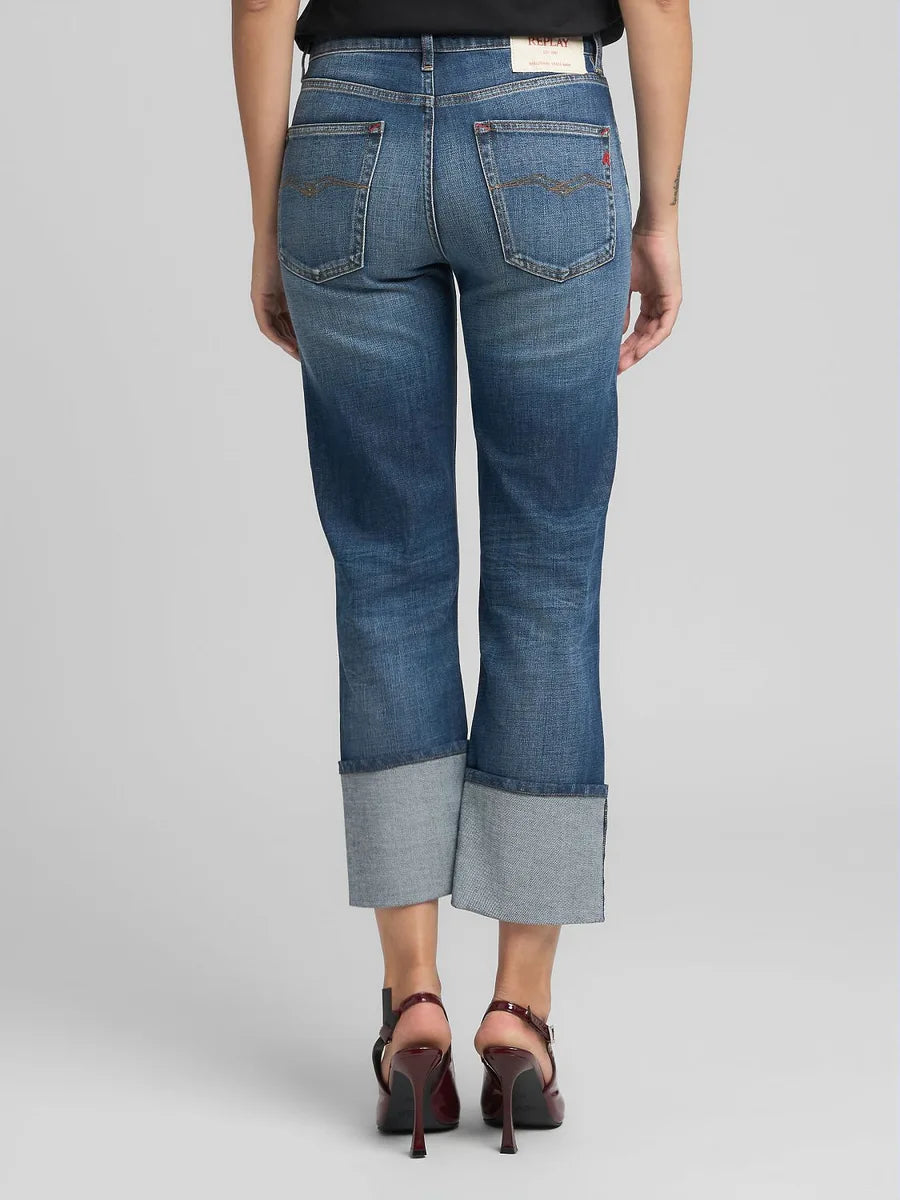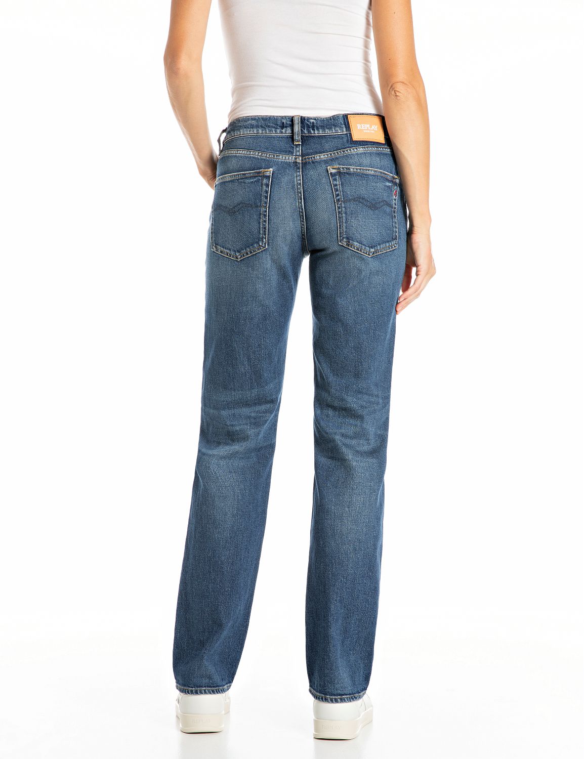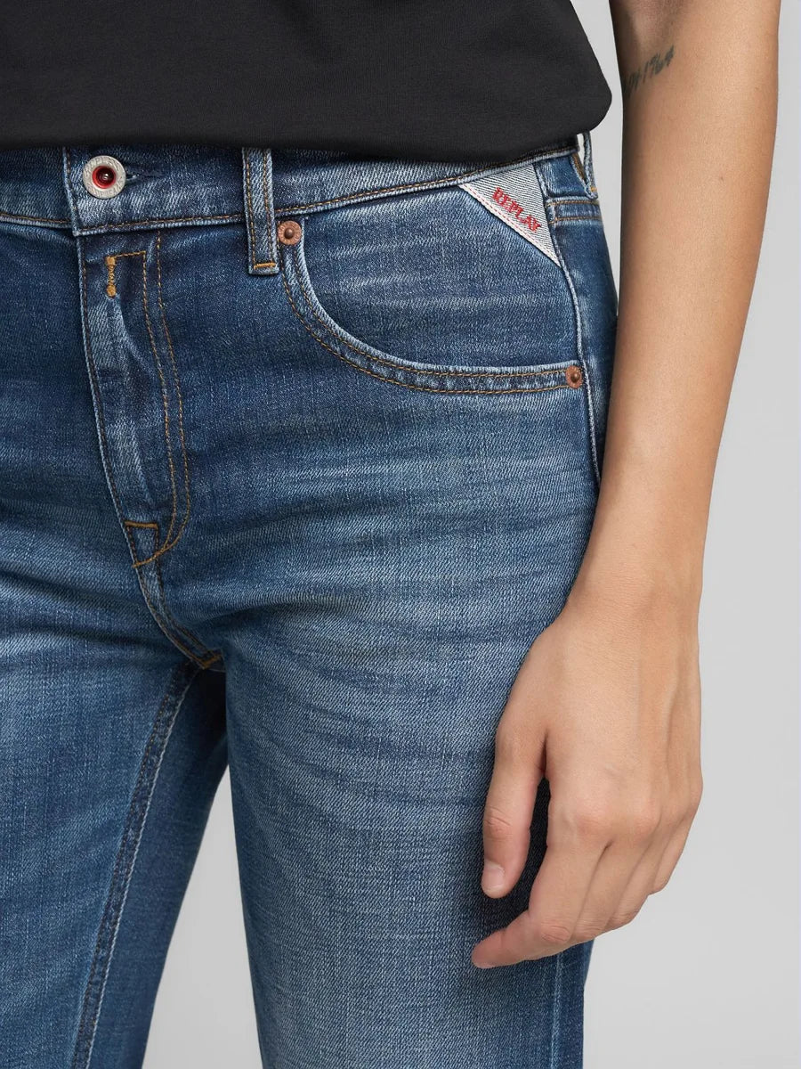 Akeme Pants Mid Blue er tøffe jeans i mellomblå vask fra Replay. En tidløs jeans med lavt liv og rette ben. Buksen har klassiske 5-pocket detaljer. Linning, beltehemper, gylf med skjult glidelås og jeansknapp i front. Buksen sitter tett rundt livet og over baken, og slipper fra lårene. Buksen er detaljert med "Replay"-logo på ene frontlommen og en rød "R" brodert på høyre baklomme. Tøff jeans til strikk og boots. Men også stilig med hæler og dressjakke, style den gjerne med oppbrett som på bildene.