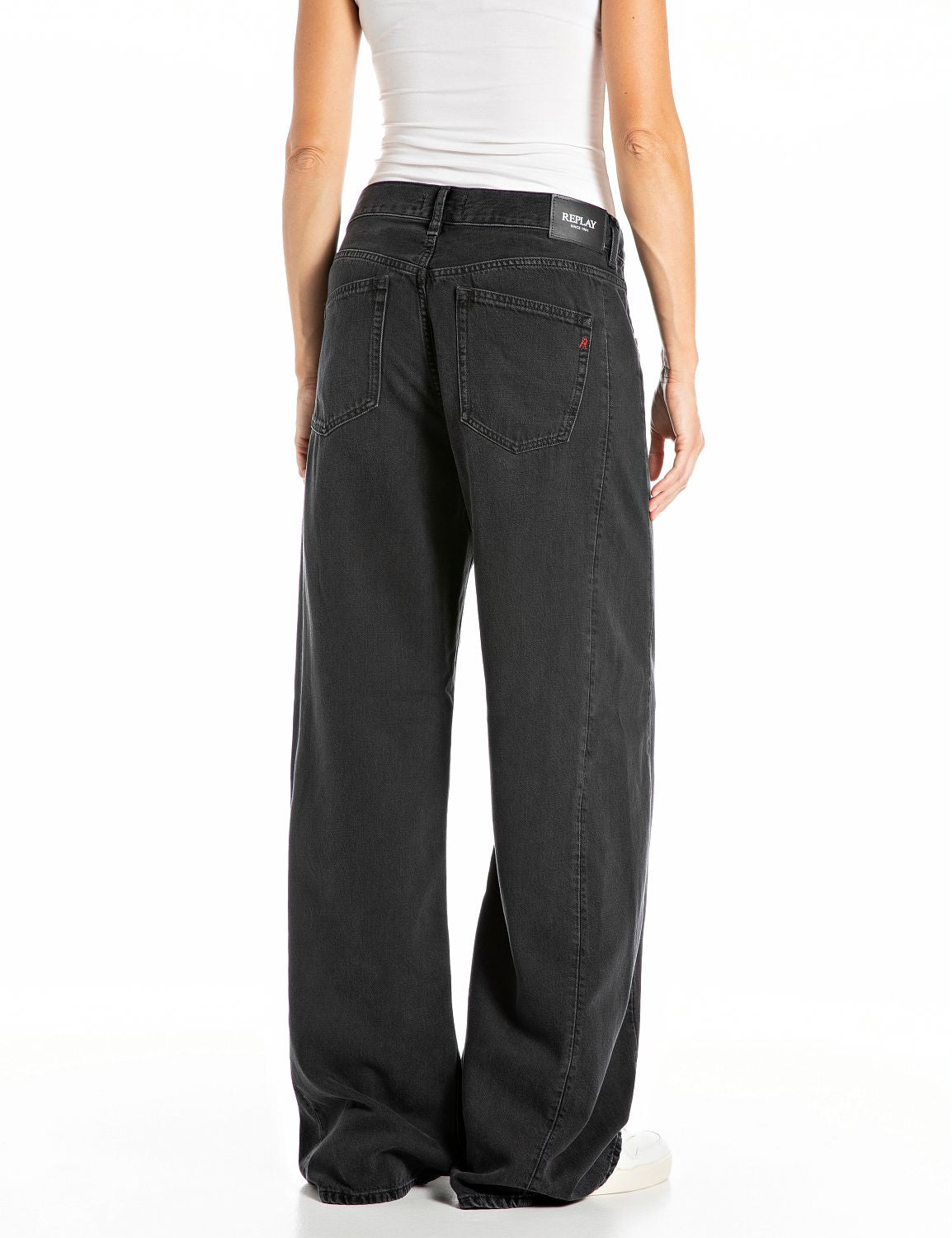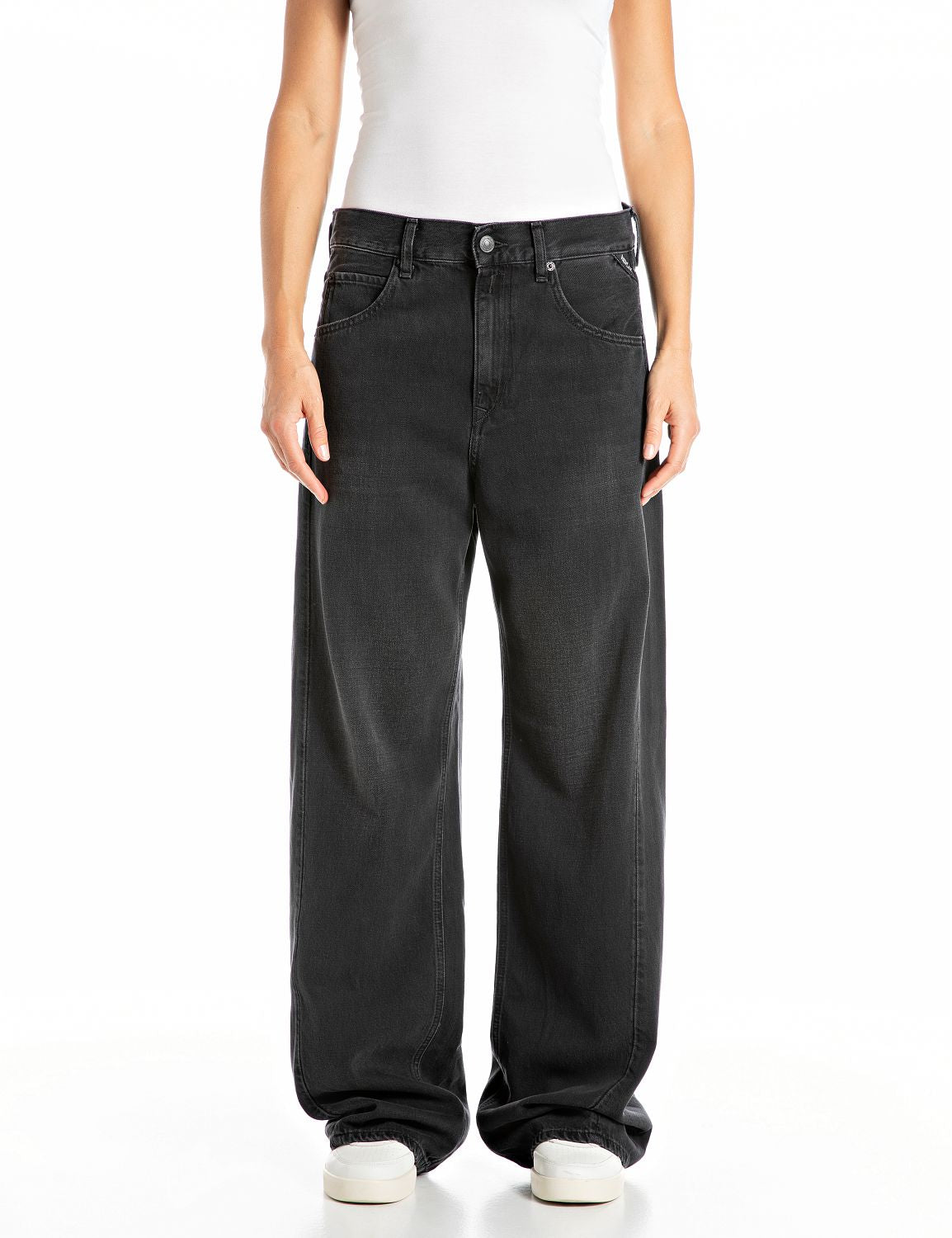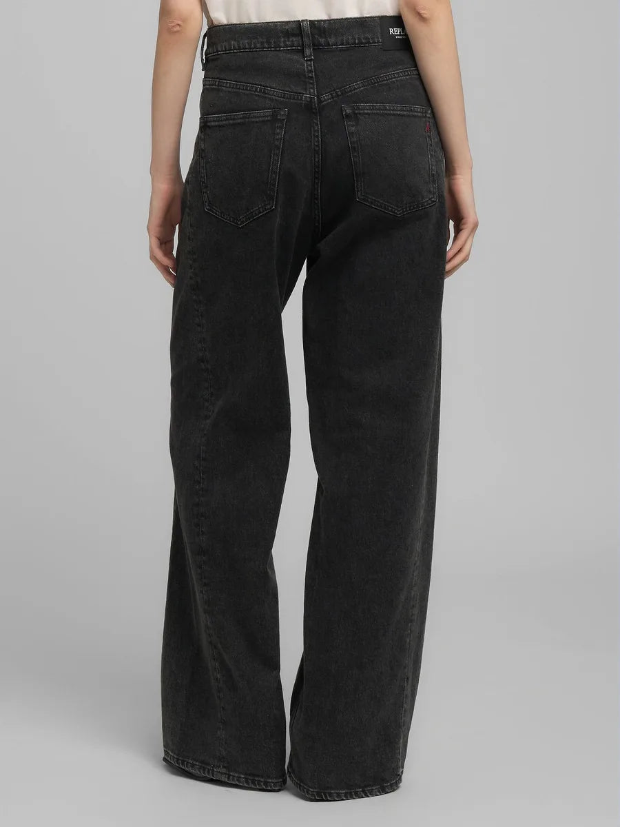 Nerja Pants Washed Black er baggy jeans i vasket sort fra Replay. En trendy  bukse med lavt liv og rette ben med stilige sømmer langs benet. Buksen har klassiske 5-pocket detaljer. Linning, beltehemper, gylf med skjult glidelås og jeansknapp i front. Buksen sitter tett rundt livet og slipper fra hoftene. Buksen er detaljert med "Replay"-logo på ene frontlommen og en rød "R" brodert på høyre baklomme. Tøff jeans til strikk og boots. Men også stilig med hæler og dressjakke!