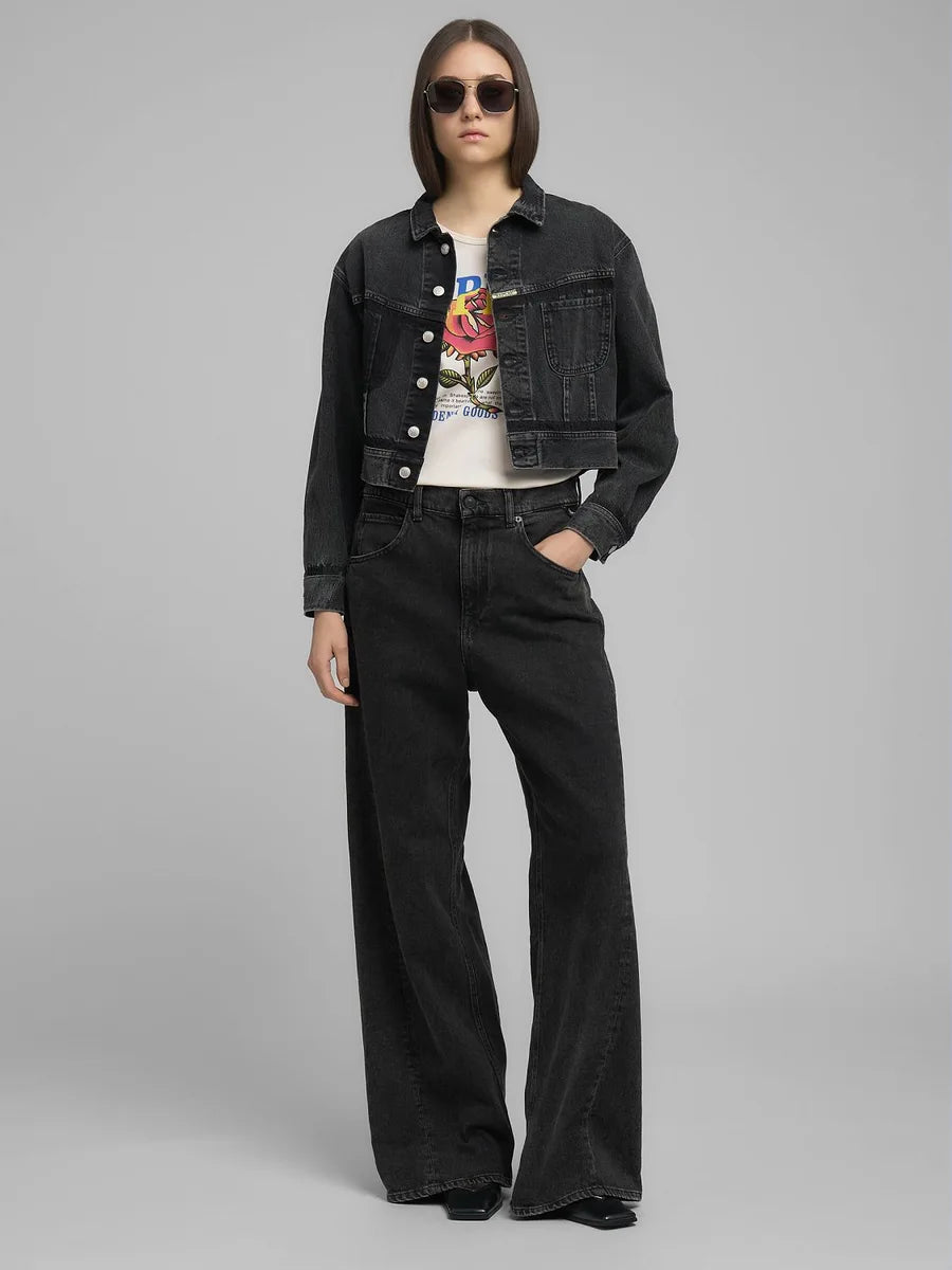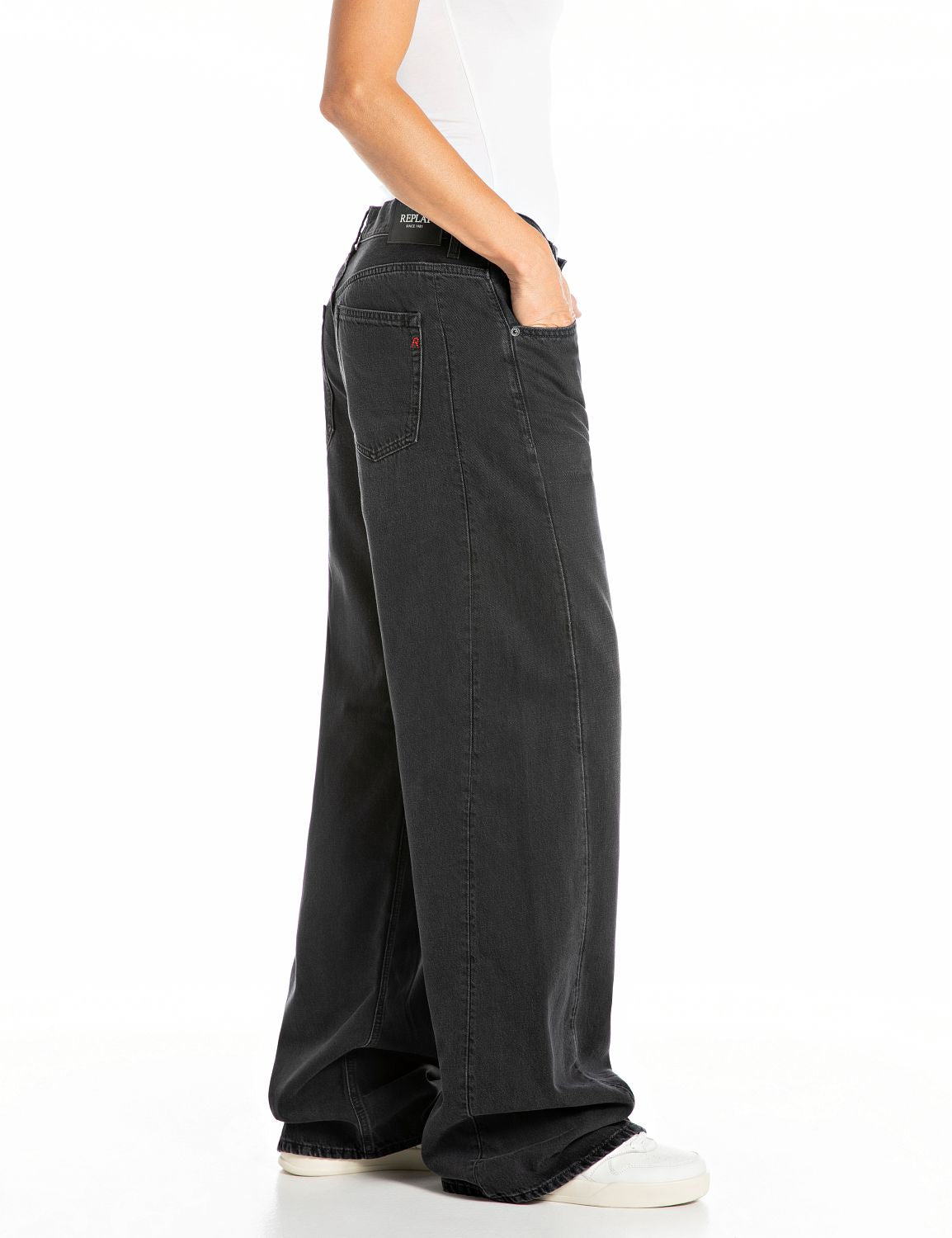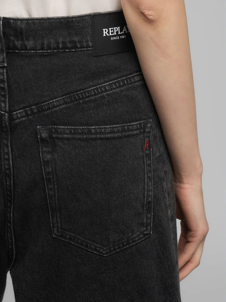 Nerja Pants Washed Black er baggy jeans i vasket sort fra Replay. En trendy  bukse med lavt liv og rette ben med stilige sømmer langs benet. Buksen har klassiske 5-pocket detaljer. Linning, beltehemper, gylf med skjult glidelås og jeansknapp i front. Buksen sitter tett rundt livet og slipper fra hoftene. Buksen er detaljert med "Replay"-logo på ene frontlommen og en rød "R" brodert på høyre baklomme. Tøff jeans til strikk og boots. Men også stilig med hæler og dressjakke!