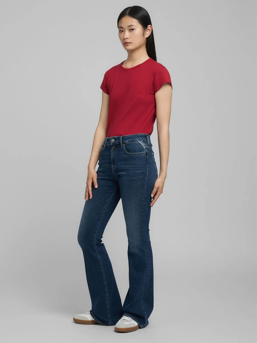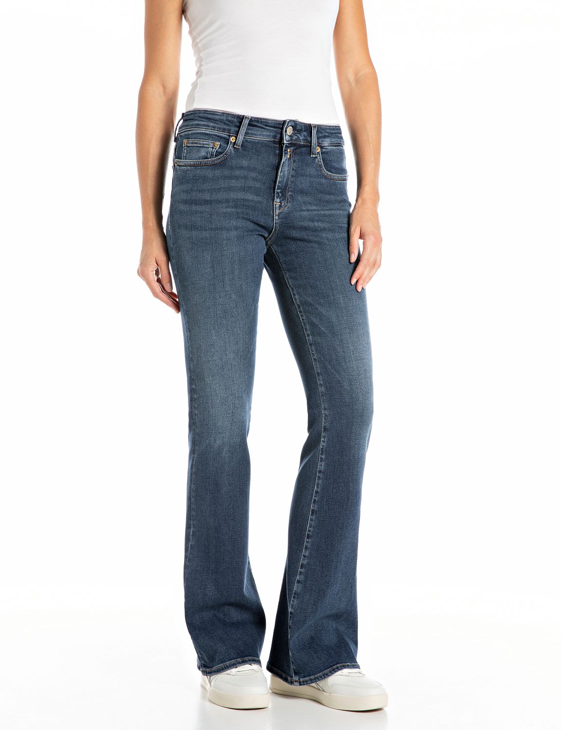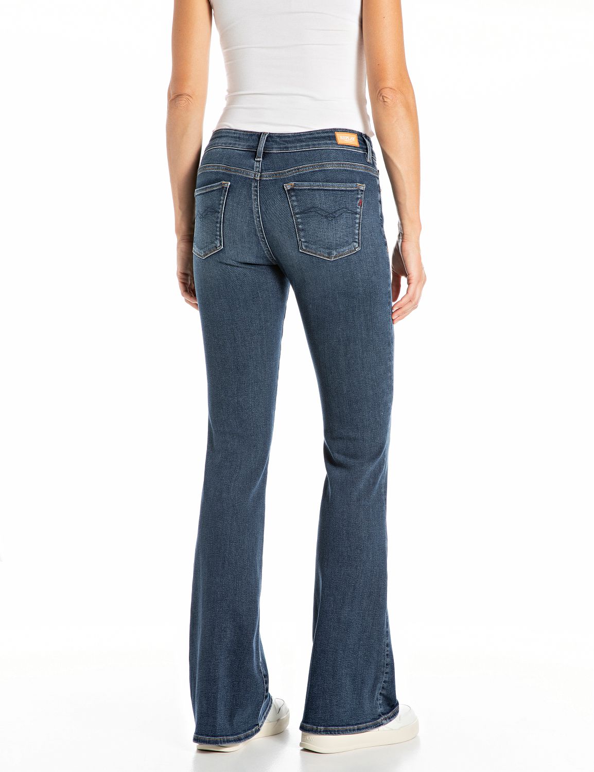 Joella Flare Pants er stilige jeans i mørk blå vask fra Replay. En trendy og elegant jeans med medium høyt liv og trendy flare i beina. Buksen har klassiske 5-pocket detaljer. Linning, beltehemper, gylf med skjult glidelås og jeansknapp i front. Deilig myk og stretchy kvalitet. Buksen sitter tett rundt livet og over baken, og slipper fra leggene. Bena har sleng med full lengde. Buksen er detaljert med "Replay"-logo på ene frontlommen og en rød "R" brodert på høyre baklomme. Tøff jeans til strikk og boots. Men også classy med hæler og dressjakke!