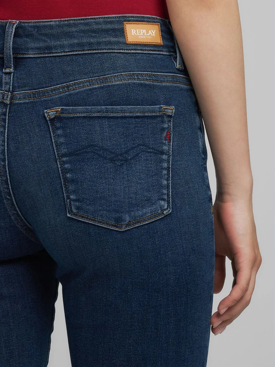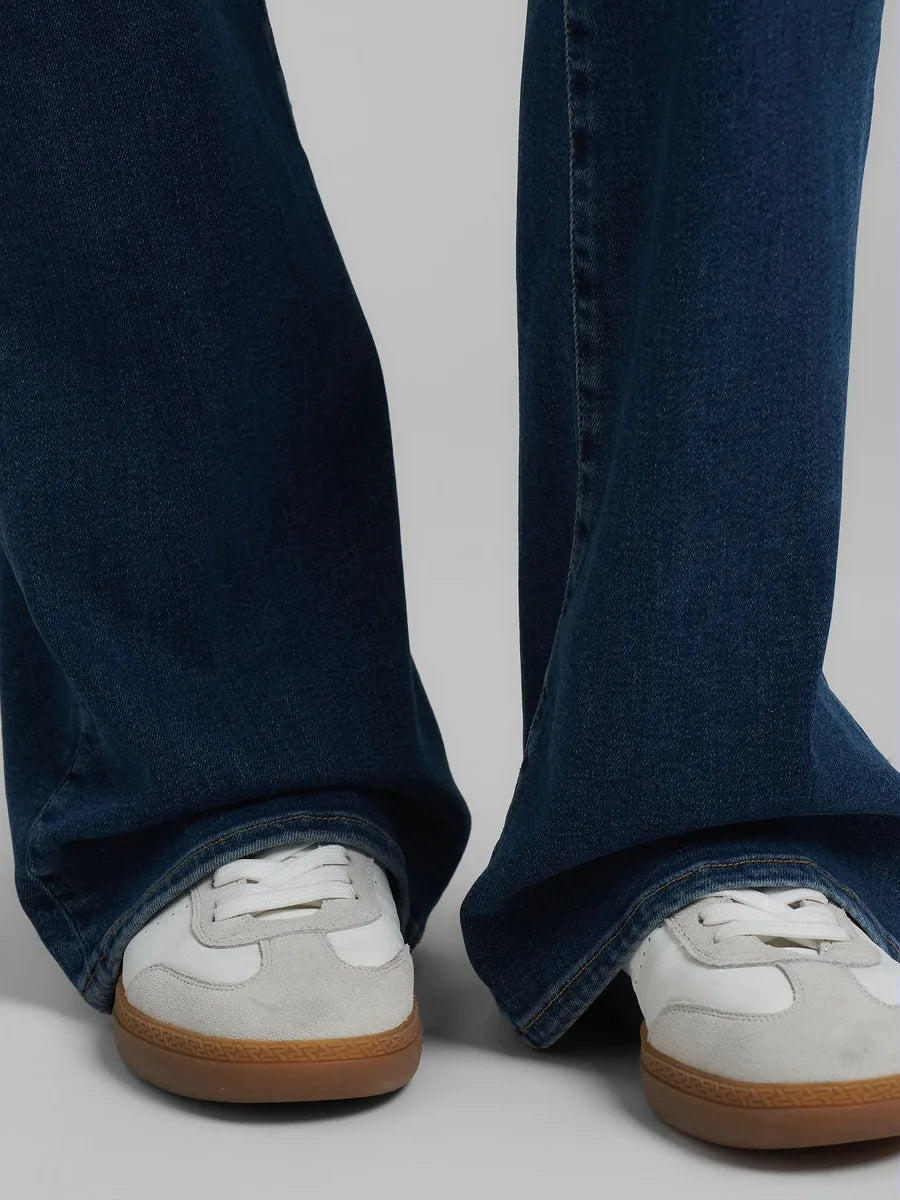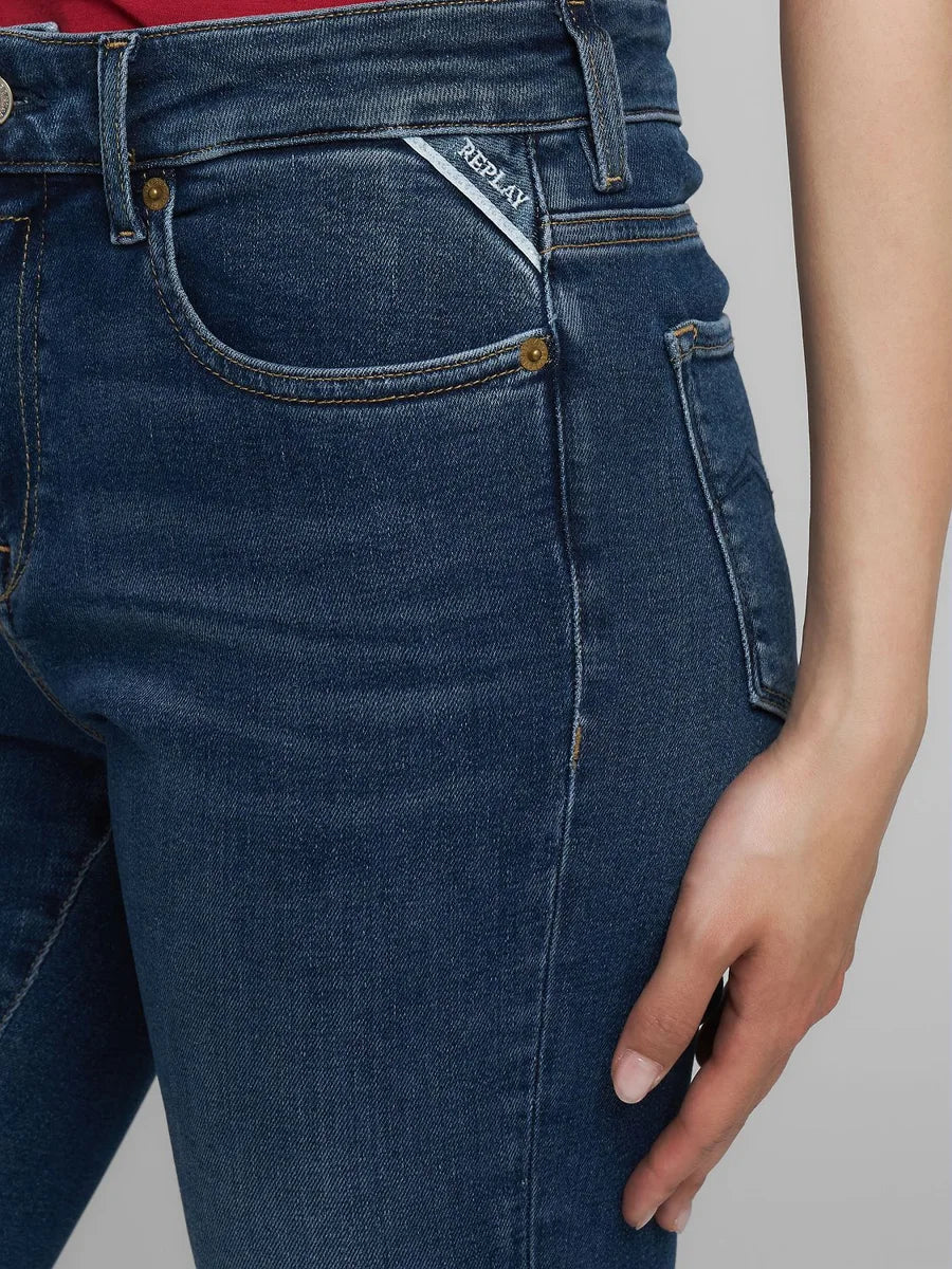 Joella Flare Pants er stilige jeans i mørk blå vask fra Replay. En trendy og elegant jeans med medium høyt liv og trendy flare i beina. Buksen har klassiske 5-pocket detaljer. Linning, beltehemper, gylf med skjult glidelås og jeansknapp i front. Deilig myk og stretchy kvalitet. Buksen sitter tett rundt livet og over baken, og slipper fra leggene. Bena har sleng med full lengde. Buksen er detaljert med "Replay"-logo på ene frontlommen og en rød "R" brodert på høyre baklomme. Tøff jeans til strikk og boots. Men også classy med hæler og dressjakke!